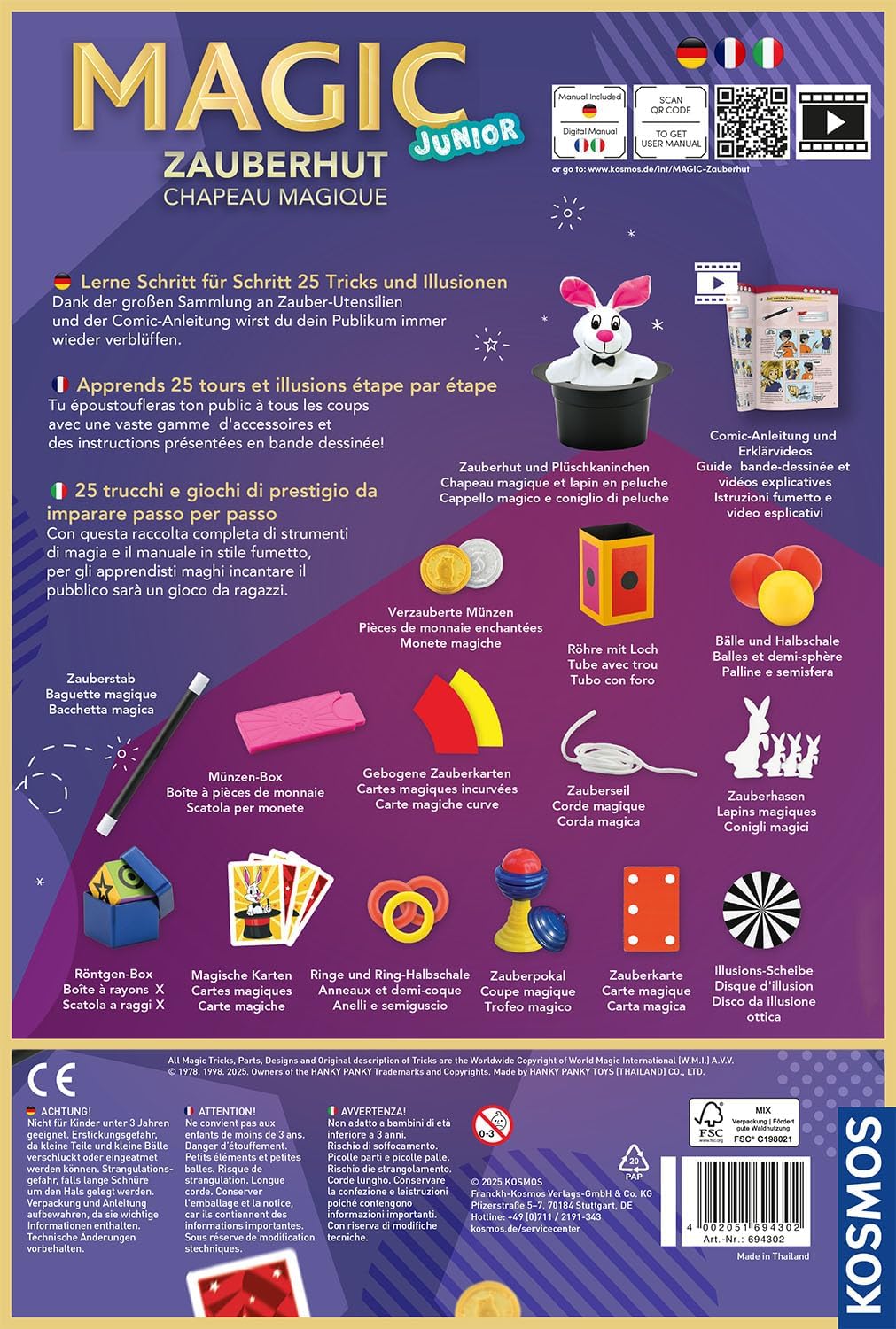 Concetto didattico con livelli di difficoltà crescenti. Un'introduzione giocosa alla magia: 25 illusioni impressionanti, da semplici a sofisticate. Con un fantastico cappello magico, un coniglio di peluche e molto altro ancora. Istruzioni dettagliate immagine per immagine e tutorial online per i migliori trucchi. Ulteriori suggerimenti e trucchi per uno spettacolo teatrale di successo. Promuove giocosamente la coordinazione, la fiducia in se stessi e la concentrazione. Il regalo perfetto per gli appassionati di magia. Per bambini dai 6 anni in su.