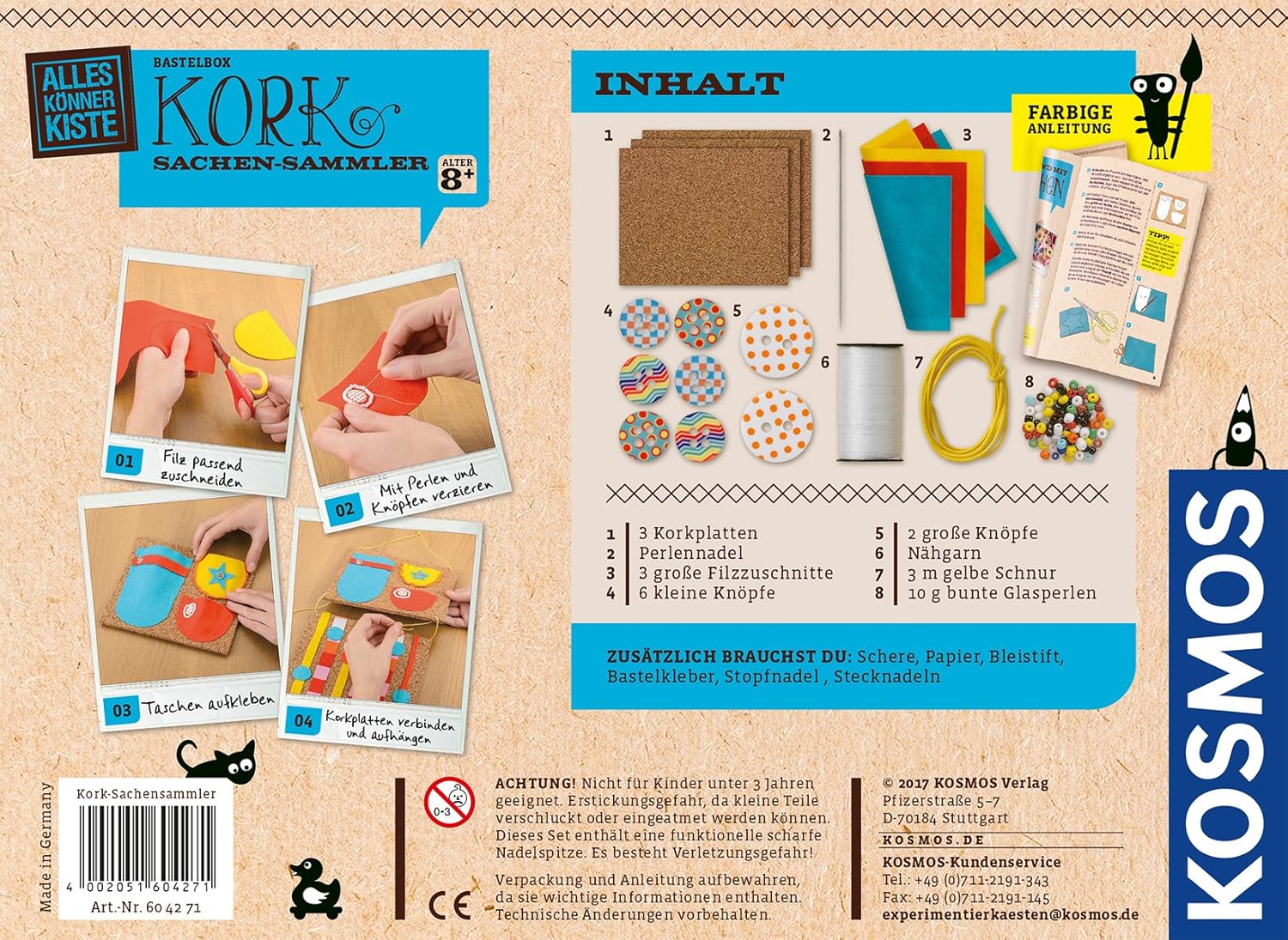 Organizer da parete in sughero Con tasche in feltro per molti oggetti di cancelleria Decorate con splendidi bottoni e perline Sughero alla moda per bricolage Età consigliata: a partire da 8 anni