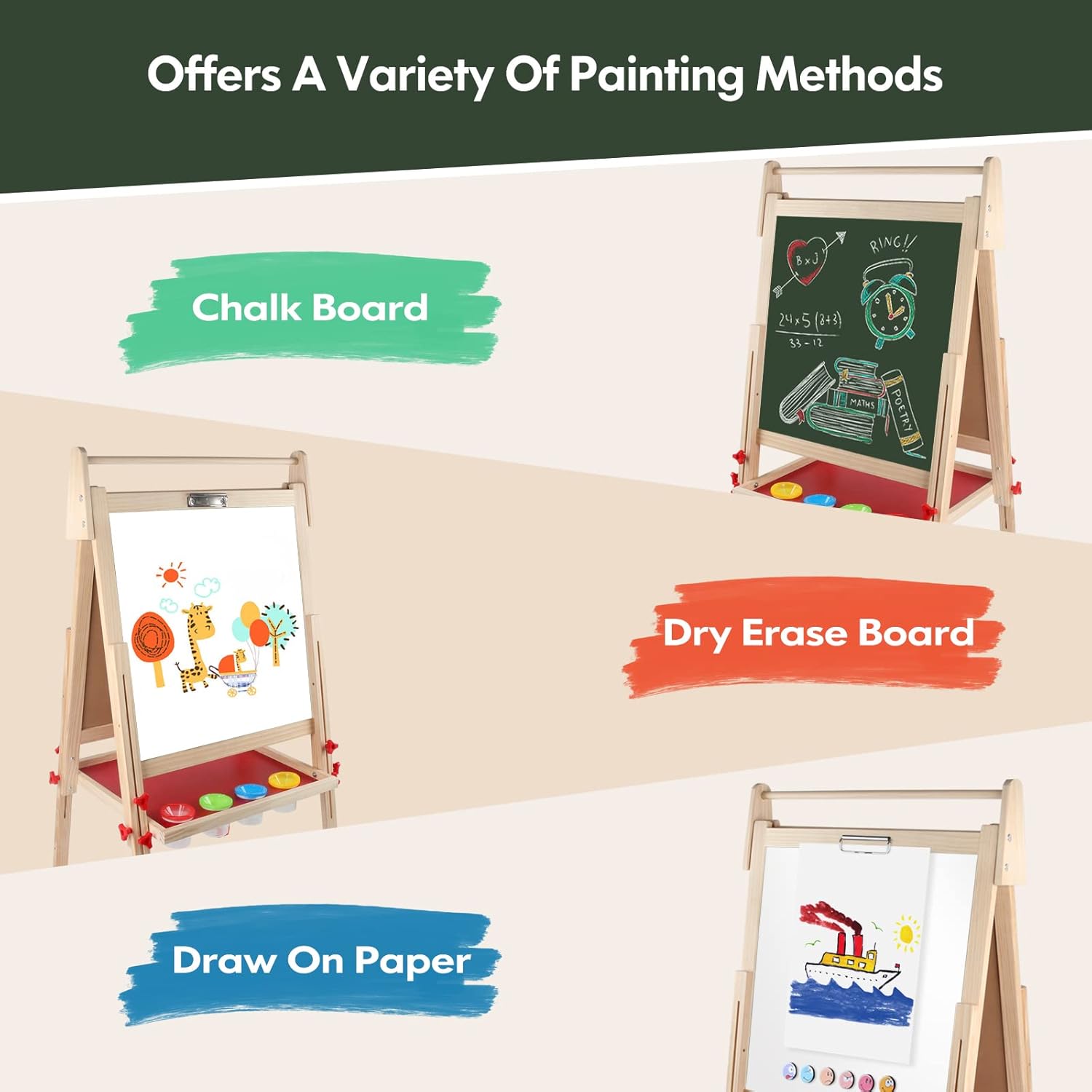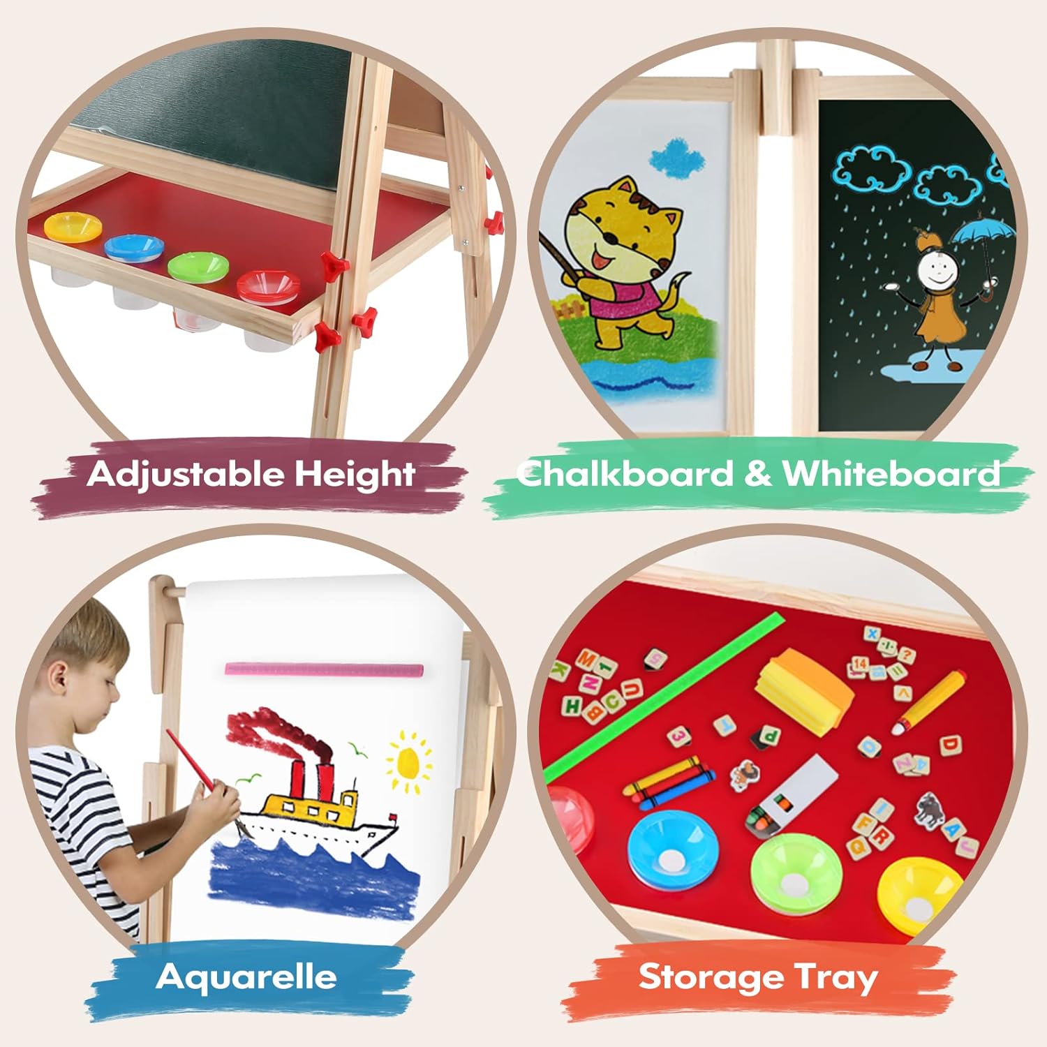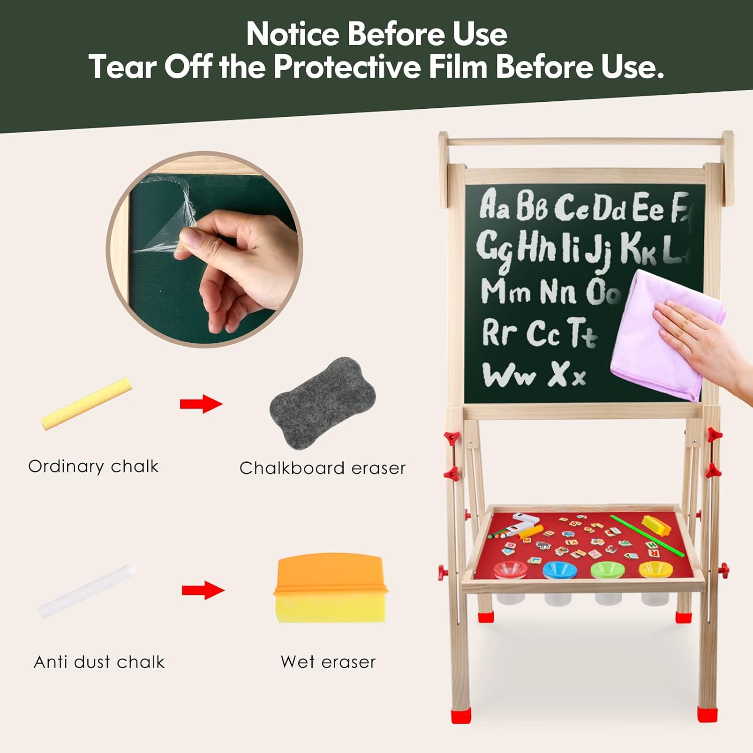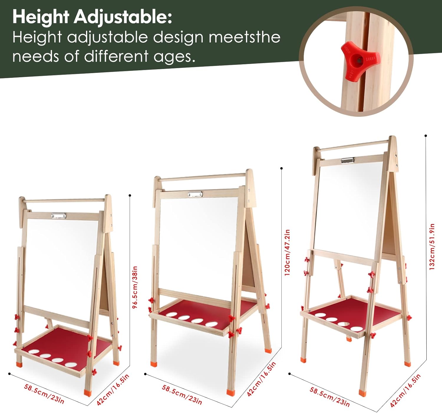 🎨 Tavola Magnetica Bilaterale: Con lavagna e lavagna, permette il disegno da entrambi i lati contemporaneamente. 🔐 Cavalletto Robusto in Legno: Montaggio facile e resistente. 🧲 Set Completo: Ogni set comprende 52 lettere magnetiche colorate, numeri, simboli, 4 tazze di pittura, 6 magneti, 1 scatola di gesso, 1 righello e 1 cancellino. ⬆️ Regolabile e Spazioso: Cavalletto regolabile in altezza da 98 a 132 cm, con dimensioni della superficie di scrittura di 48 cm x 48 cm. 🤖 Divertente ed Educativo: Promuove lo sviluppo artistico attraverso pittura, disegno, scrittura e narrazione.