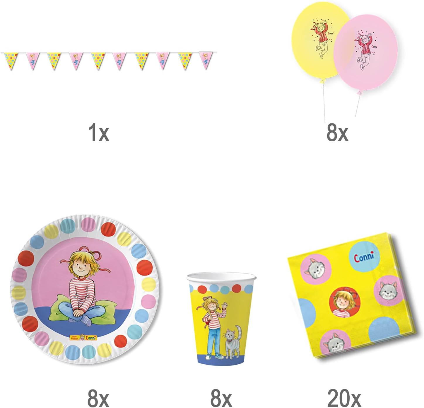 Set da 45 pezzi per la mia amica Conni. Decorazione da tavolo per bambini Contenuto della confezione: 1 festone (3,5 m di lunghezza), 8 bicchieri (200 ml), 8 piatti (diametro 23 cm), 8 palloncini (gonfiati circa 90 cm) e 20 tovaglioli (a tre strati, circa 33 x 33 cm) Sì, arriva Conni. La mia amica Conni." La fidanzata Conni ora prende posto anche al tavolo di compleanno: con questo bellissimo set per feste i bambini possono festeggiare con il segno del popolare personaggio Conny! Questo fantastico set per feste con la mia amica Conni farà brillare gli occhi dei bambini. L'accessorio per feste è composto da un totale di 45 pezzi ed è pronto per un massimo di otto bambini. La confezione include otto piatti rotondi con un diametro di 23 cm ciascuno e otto bicchieri con una capacità di circa 200 millilitri con elegante motivo Conni. Il set di 20 tovaglioli è completato, soprattutto per i bambini sono spesso necessari diversi tovaglioli. Con la ghirlanda di bandierine da 3,5 metri con dieci bandierine e gli otto palloncini colorati, è possibile decorare la stanza delle feste di conseguenza. Con questo set per feste avrete tutti gli articoli in modo rapido e semplice, i piccoli ospiti piaceranno sicuramente! Materiale: tovaglioli, bandierine, 100% carta | bicchieri, piatti 100% carta | palloncini 100% lattice