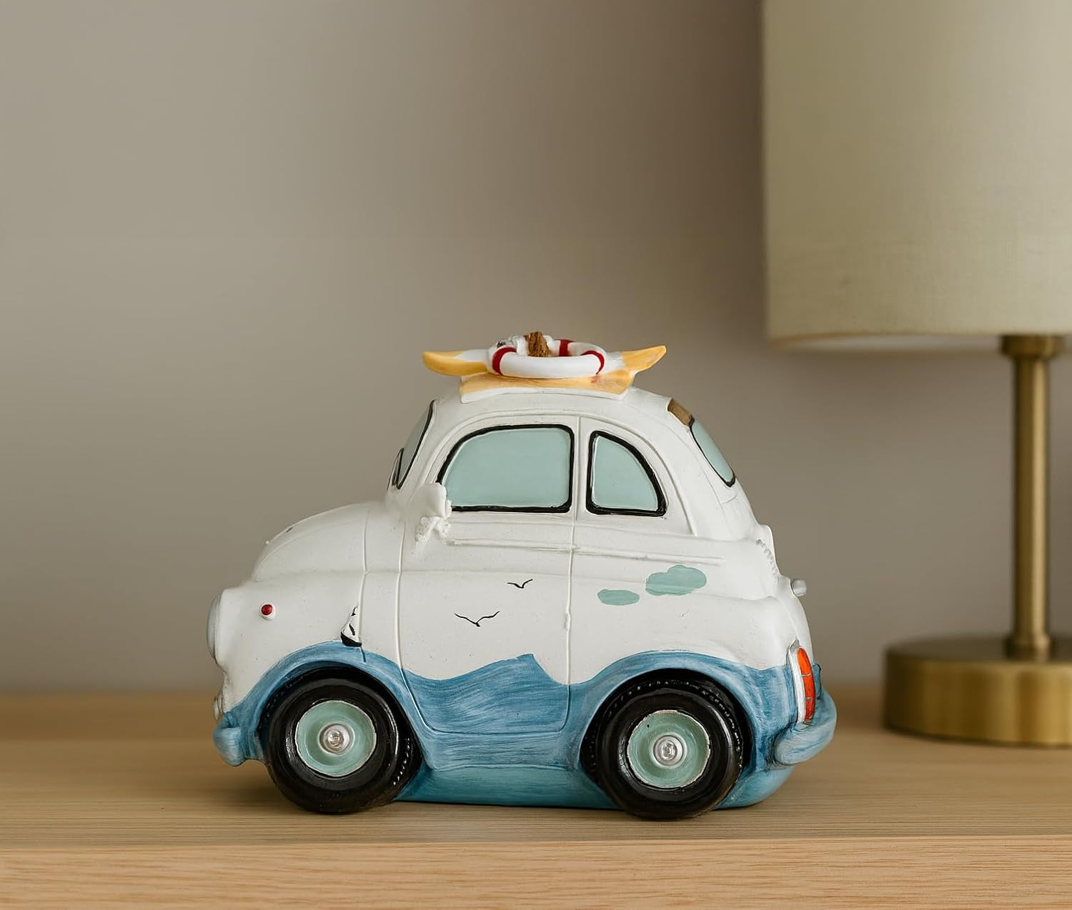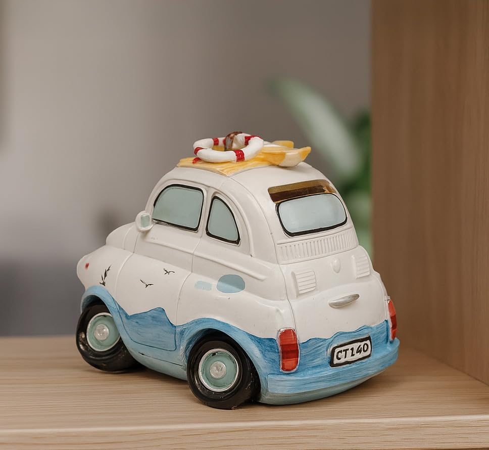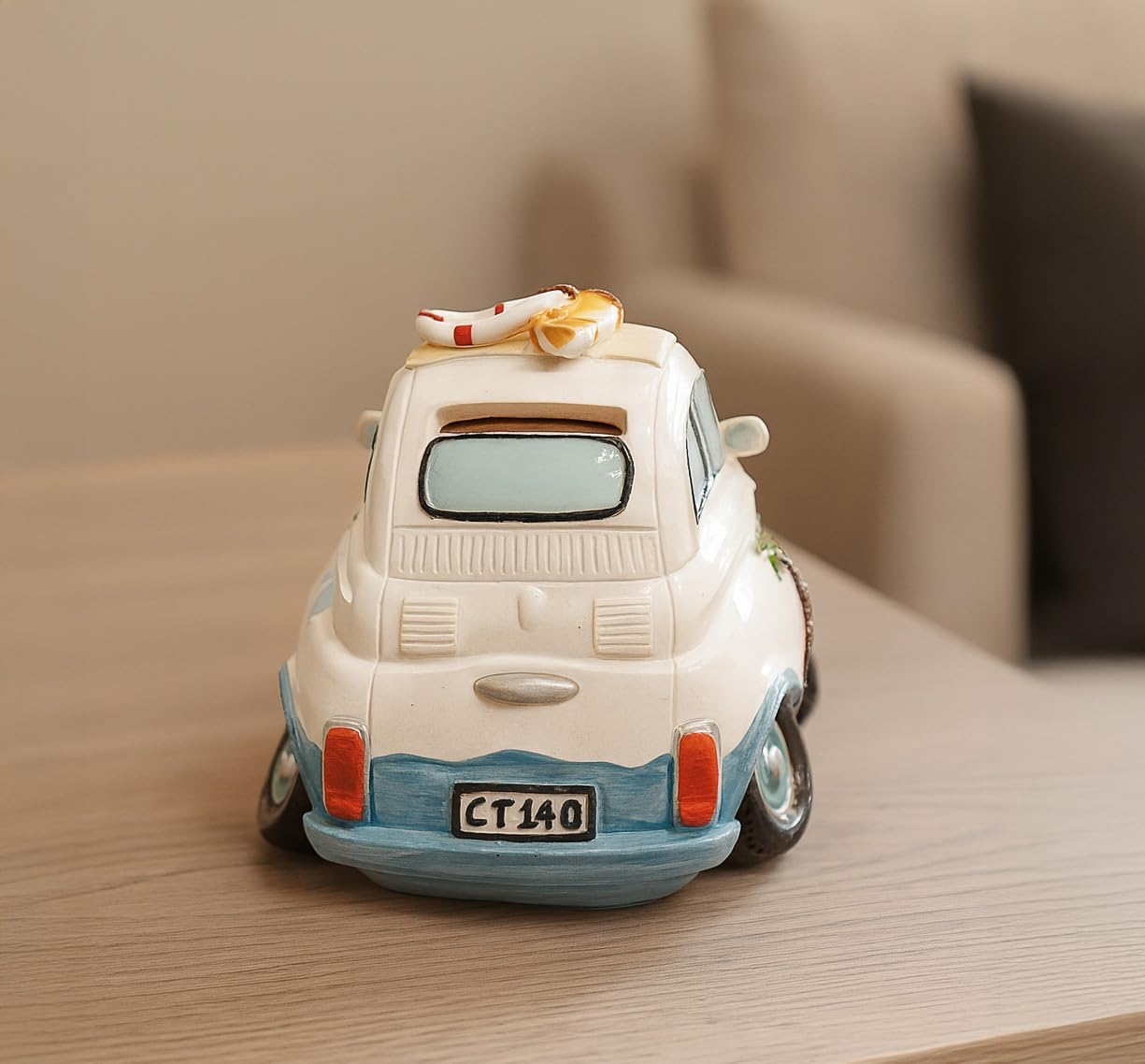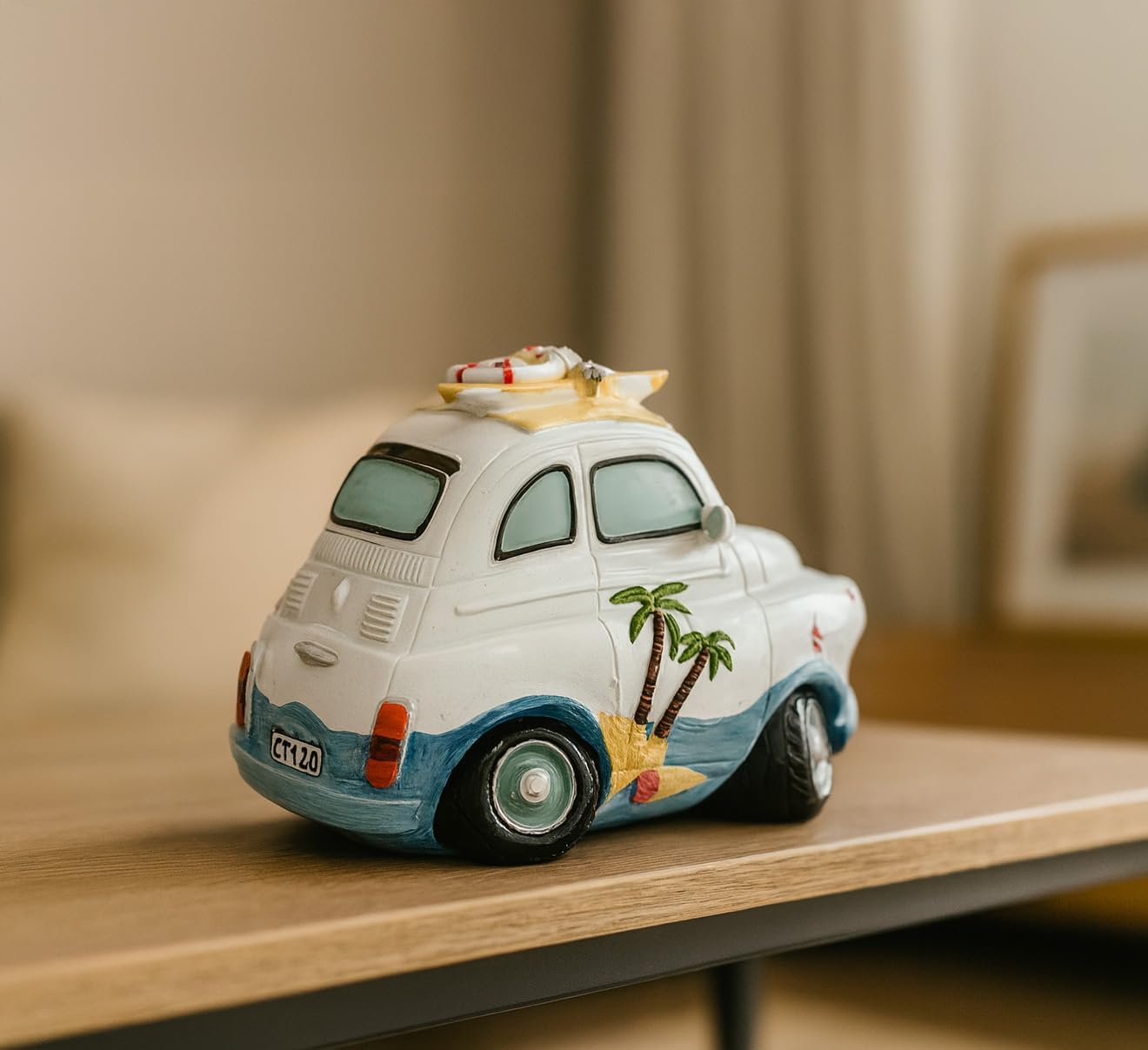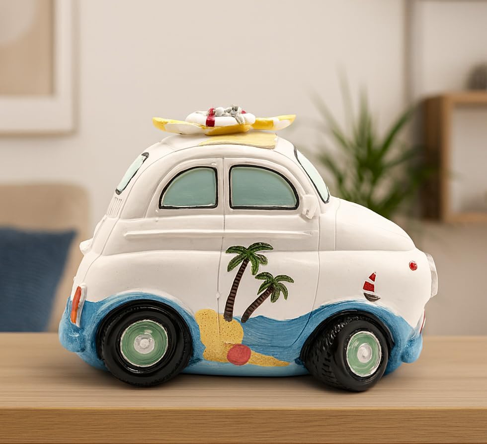 ALTA QUALITÀ E DIPINTO A MANO – Robusta poliresina, dettagliata e dipinta con amore. Ogni fondo vacanze è un pezzo unico con un design nostalgico dell'auto. IDEA REGALO PERFETTA - Ideale per gli amanti dei viaggi, compleanni, Natale o matrimoni. Un regalo originale dal sapore vacanziero. IL RISPARMIO PER LE VACANZE È FACILE - Raccogli denaro per la tua prossima vacanza da sogno o per la tua nuova auto: risparmiare è divertente con questo salvadanaio. HIGHLIGHT DECORATIVO - Che sia in soggiorno, su uno scaffale o in ufficio, la mini macchina dal look da spiaggia attira davvero l'attenzione e ti regala un'atmosfera vacanziera. CHIUSURA PRATICA - Si chiude con un tappo, facile da aprire e sicura. Dimensioni: 16,8 × 13,2 × 12,6 cm - compatto, accattivante e salvaspazio