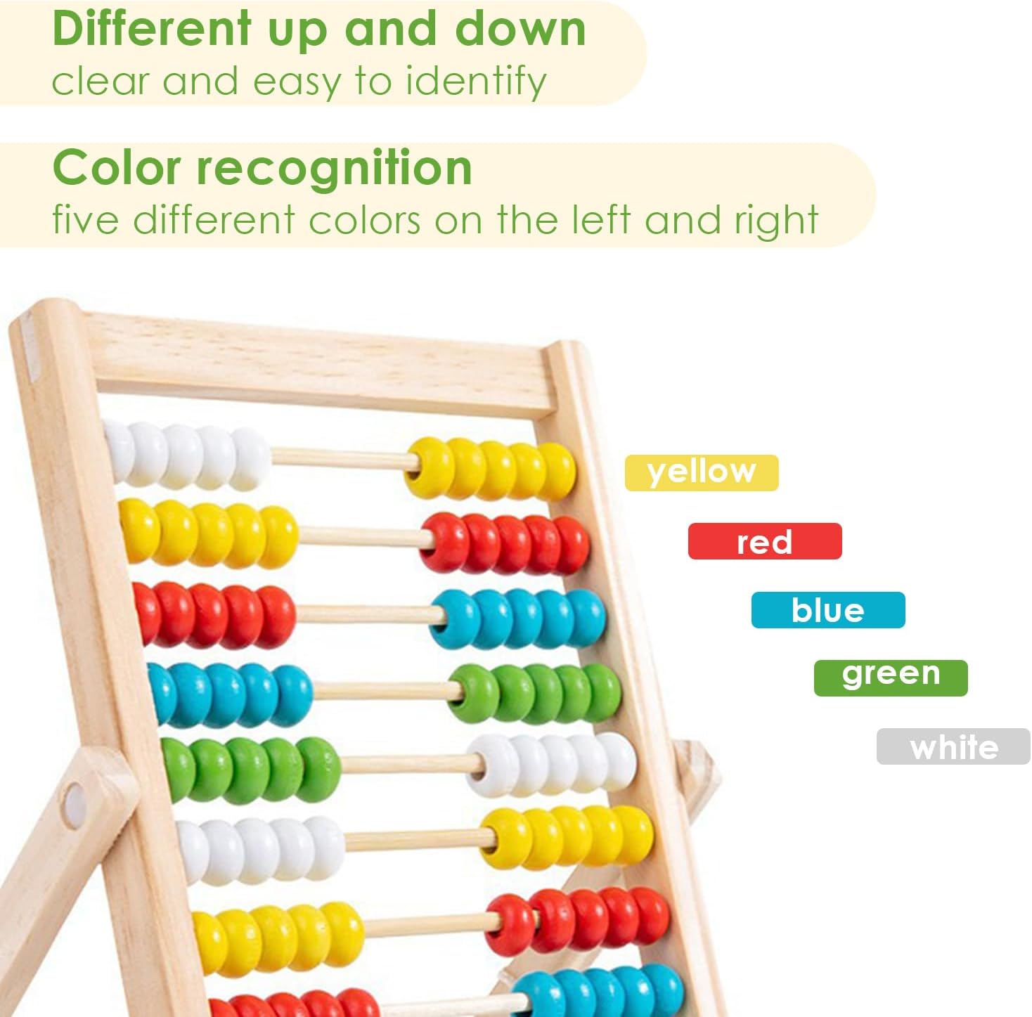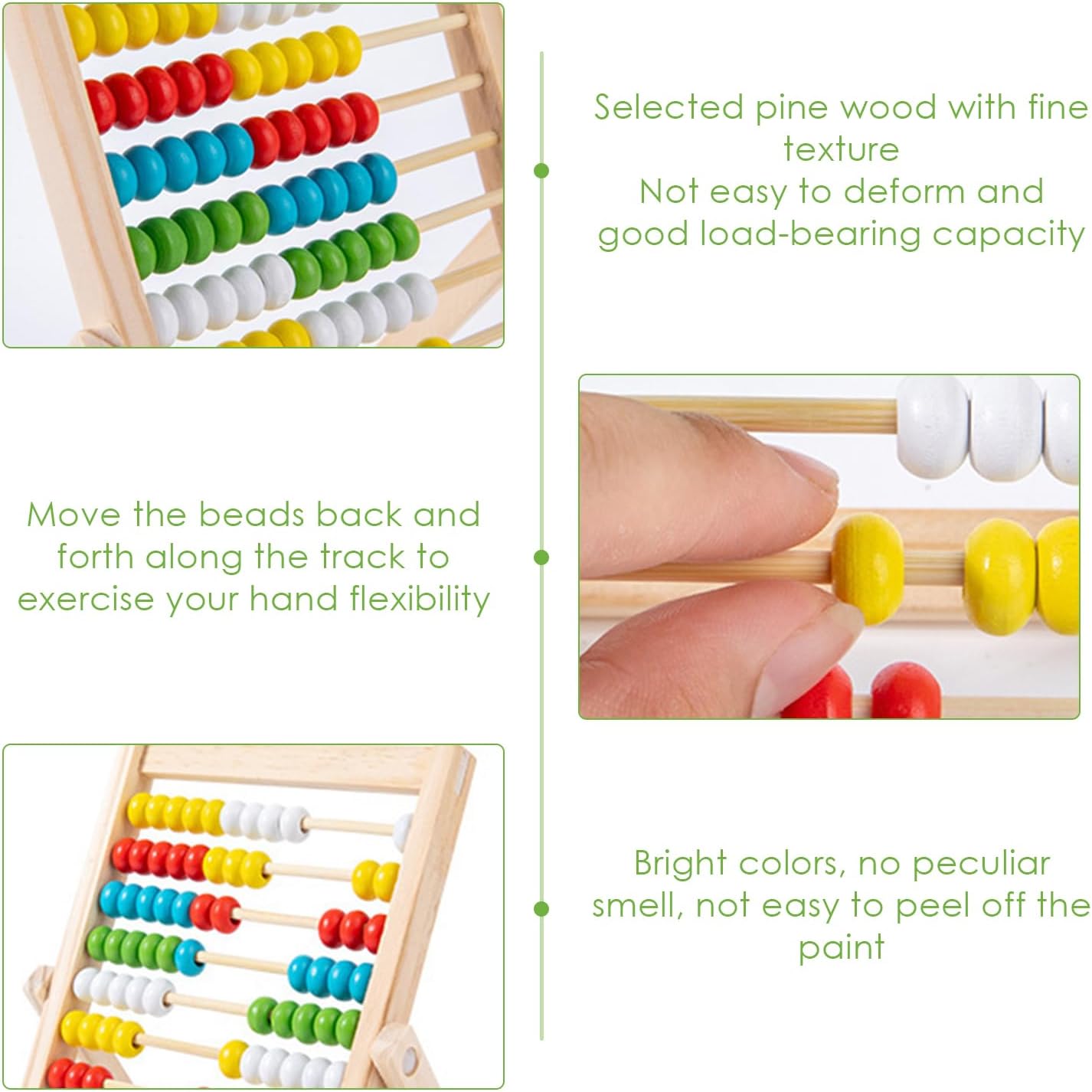 【Contenuto del prodotto】: Riceverai 1 pezzo di abaco per bambini, dimensioni 21*15,5 cm. Abacus for children è un potente strumento di apprendimento che insegna ai bambini le abilità matematiche di base e migliora le loro capacità cognitive. 【Materiale del prodotto】: L'abaco è realizzato in legno selezionato, che è forte e durevole, resistente all'usura e anticaduta, la vernice non si sbuccia e non ha odore, non è facile da deformare, ha una buona capacità di carico e può sopportare un uso frequente da parte di bambini piccoli. 【Interattivo】L'abaco per bambini presenta perline colorate e un design intuitivo. Utilizza perline colorate per incoraggiare il riconoscimento dei colori da parte dei bambini, rendendo divertente l'apprendimento della matematica e attirando la partecipazione dei bambini di tutte le età. 【Partecipazione multisensoriale】: man mano che i bambini maneggiano le perline sul telaio di conteggio, sviluppano le loro capacità motorie e si impegnano nell'apprendimento multisensoriale per consolidare la conoscenza e migliorare la memoria. 【Ampiamente usato】: sia in classe che a casa, l'abaco per bambini è un eccellente strumento didattico per ogni bambino e aiuta a gettare solide basi per il futuro successo dell'apprendimento.
