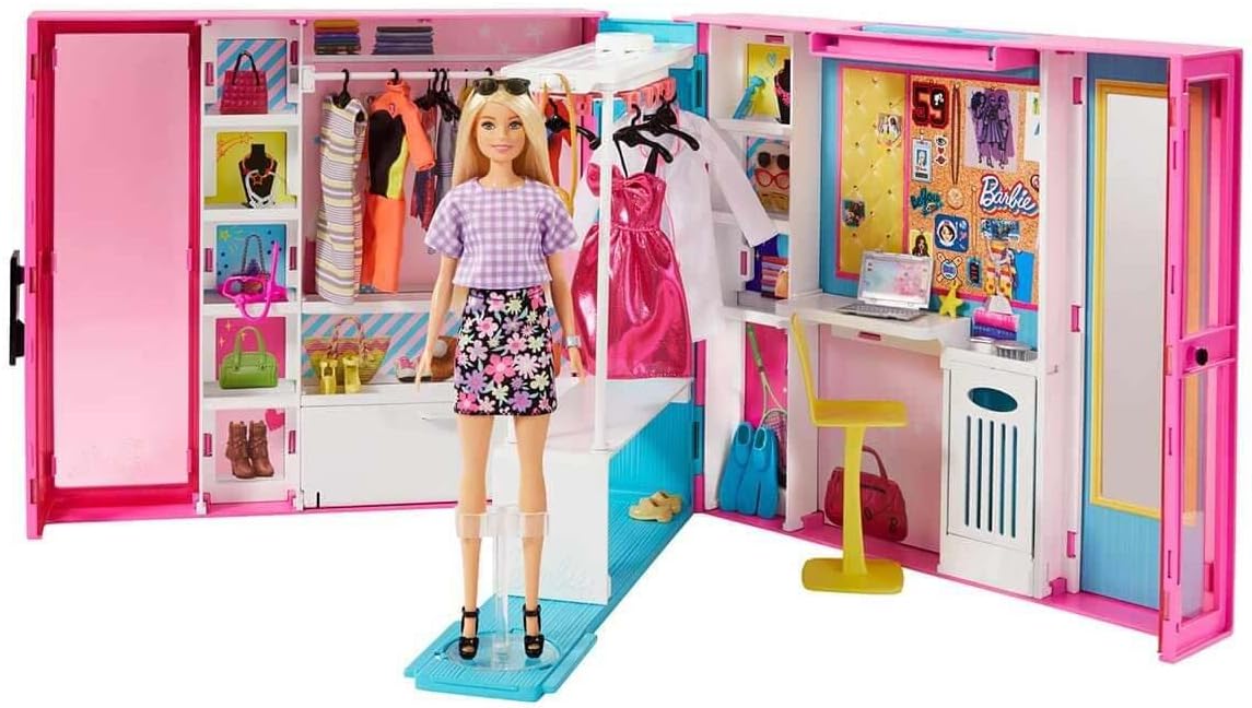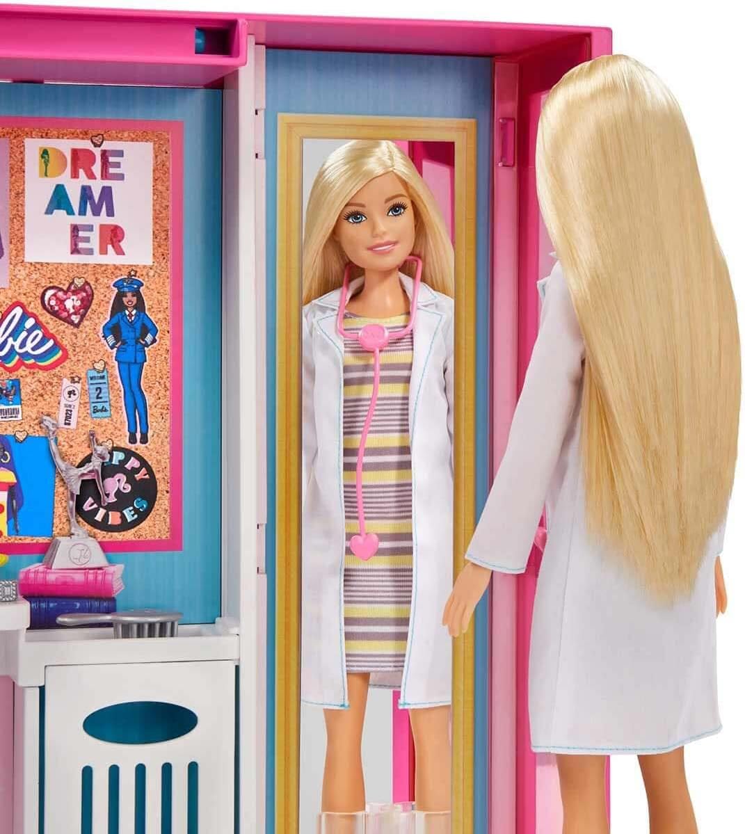 CREA UN'INFINITÀ DI LOOK E STORIE. Il camerino si apre per rivelare uno spazio di 60 cm che comprende più di 10 vani portaoggetti e più di 25 accessori per vestirsi in ogni occasione 4 OUTFIT INCLUSI. Scegli tra un abito da sera rosa scintillante, una camicia a quadri e una gonna a fiori, un completo da pediatra con un camice bianco e una muta da sub. QUESTO SET DA GIOCO COMPRENDE una bambola, un appendiabiti girevole, uno specchio da terra, una scrivania e più di 25 accessori inclusi adesivi per decorarli. Regalo ideale dai 3 anni I BAMBINI POSSONO SOGNARE di essere un medico o di esplorare i fondali marini travestendosi per le loro avventure prima di fare festa con i loro amici. Scegli l'outfit perfetto tra gli scaffali IL REGALO IDEALE PER BAMBINI DAI 3 ANNI. Incoraggia il gioco fantasioso e aiuta i bambini a sviluppare la loro sicurezza e identità aiutando a realizzare i loro sogni