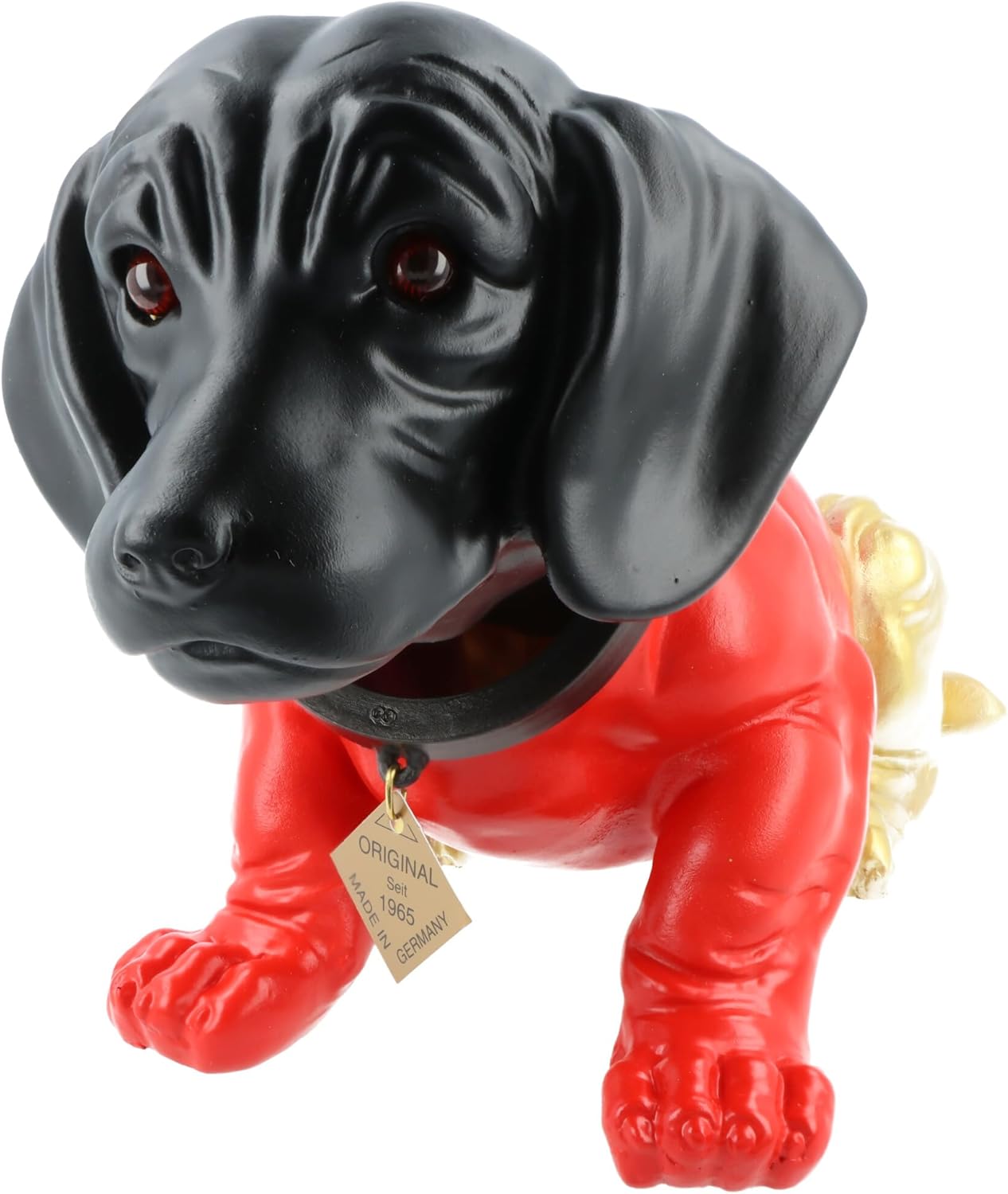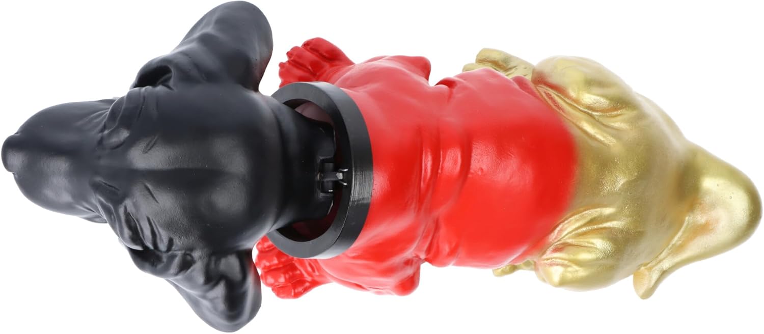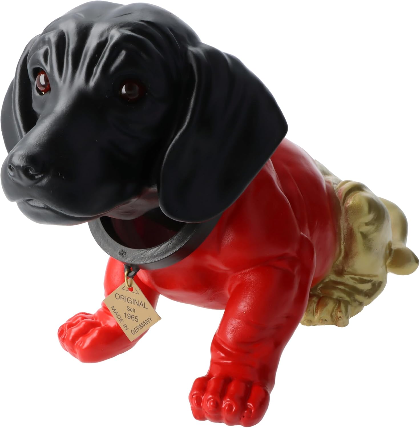 La grande statuetta originale, ora in nero, rosso e oro, probabilmente la decorazione più iconica dello scaffale posteriore accanto al rotolo di carta igienica