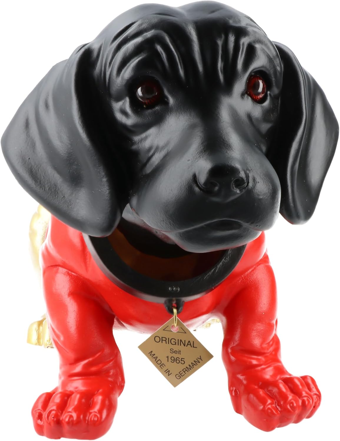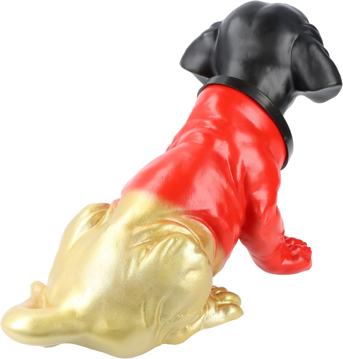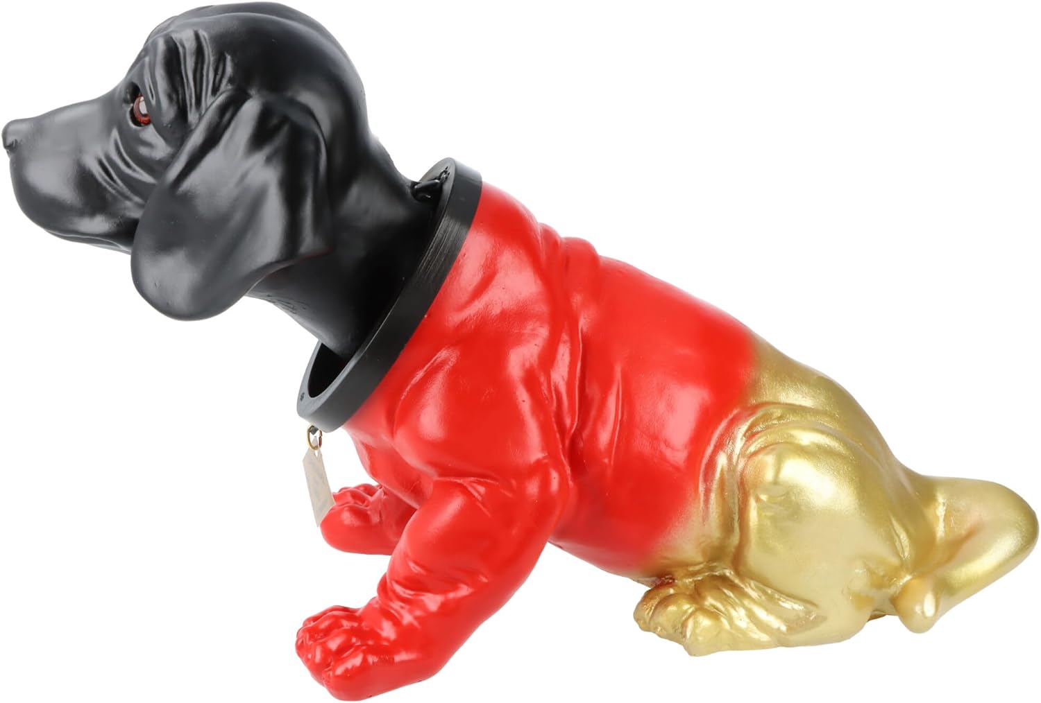 La grande statuetta originale, ora in nero, rosso e oro, probabilmente la decorazione più iconica dello scaffale posteriore accanto al rotolo di carta igienica