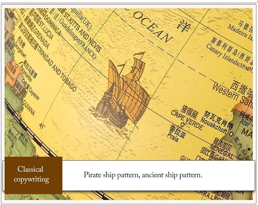 Significato interessante e didattico: la nostra Terra è dotata di informazioni sempre aggiornate, incoraggiando i bambini curiosi a esplorare il mondo scientifico con le mani e con gli occhi. Ultima versione: il nostro stile antico mostra gli ultimi confini nazionali di ogni continente e non mostra i confini delle città e di altri paesi interessanti. Stabile e durevole: con una staffa, una sfera di plastica ingegneristica di alta qualità, con sfere colorate in metallo ramato. La rotazione fluida consente spiegazioni e spiegazioni semplici. Questo robusto globo terrestre è stato completamente assemblato e preparato per offrire un'esperienza di apprendimento straordinaria! Copywriting classico: modello di nave pirata, modello di nave antica, oceano decorato con vela antica. Il diametro della palla è di 25 cm/9,8 pollici e l'intera altezza è di 30 cm/12 pollici Decorazione pratica: usa questo globo terrestre per espandere il tuo campo visivo e migliorare la tua comprensione della geografia della terra! Offre un modo interessante e conveniente per imparare l'educazione geografica a casa, in classe o in ufficio. Usalo come un'esposizione sorprendente su una libreria o una scrivania.