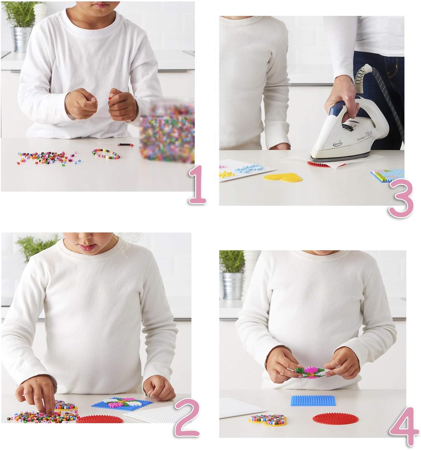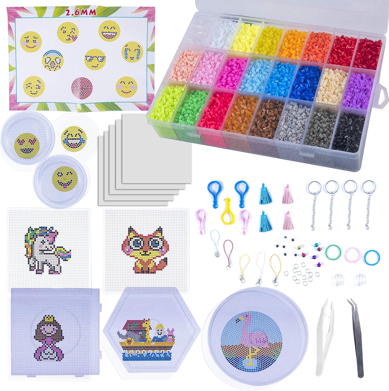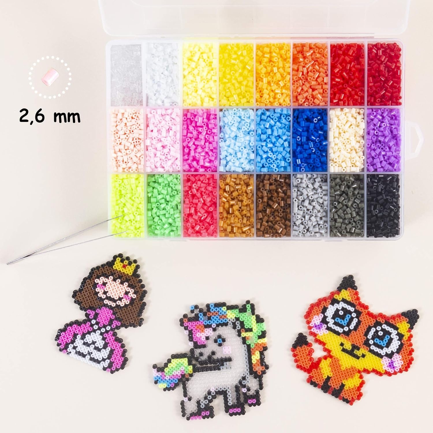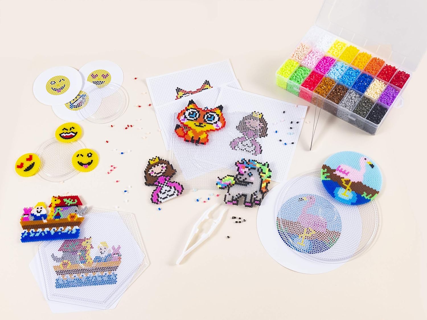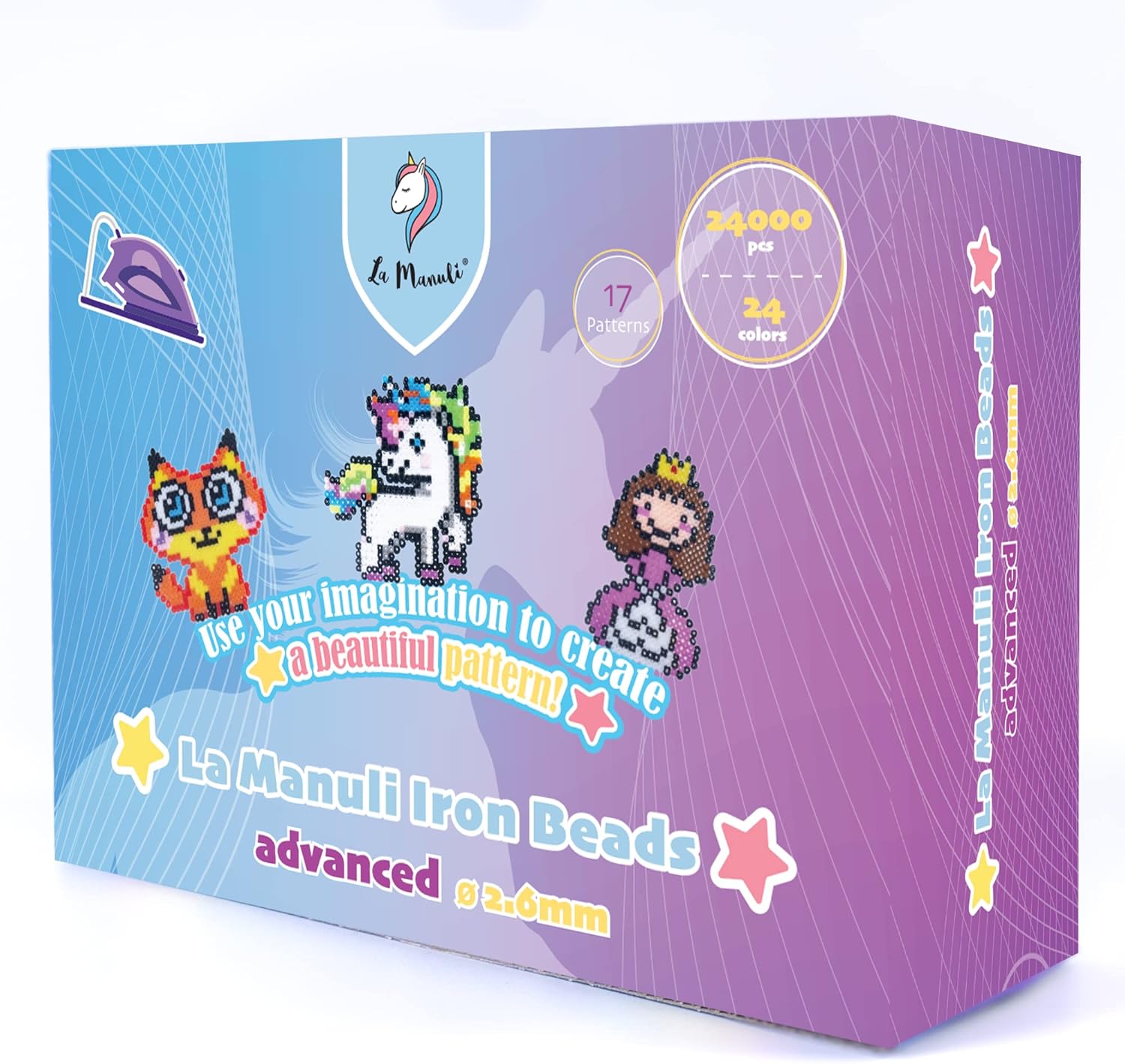 Coffret tutto-in-uno: Il kit La Manuli contiene 24.000 mini perline fusibili da 2,6 mm in 24 colori diversi, perfetto per creare motivi divertenti e dettagliati come emoticon, animali e personaggi, tra cui un fenicottero o una principessa Modelli vari e creativi: Il set include modelli divertenti come 12 emoji, una stella, una volpe e animali su una barca, ideali per incoraggiare i bambini a esprimere la loro creatività attraverso l'arte e il fai da te Accessori completi inclusi: Il kit comprende 5 basi trasparenti, 2 pinze per una manipolazione precisa, 5 fogli da stirare, 7 anelli portachiavi e 10 pendenti per creare i tuoi gioielli o portachiavi. Il tutto è organizzato in una pratica scatola di stoccaggio Stimola creatività e coordinazione: Giocare con le perline da stirare aiuta a sviluppare la coordinazione occhio-mano, la percezione dei colori e la creatività nei bambini, unendo divertimento e apprendimento per bambini e adulti Regalo perfetto per ogni occasione: Questo kit di perline da stirare è il regalo ideale per Natale, compleanni, feste o attività creative, offrendo ai bambini la possibilità di creare opere d'arte uniche con famiglia o amici