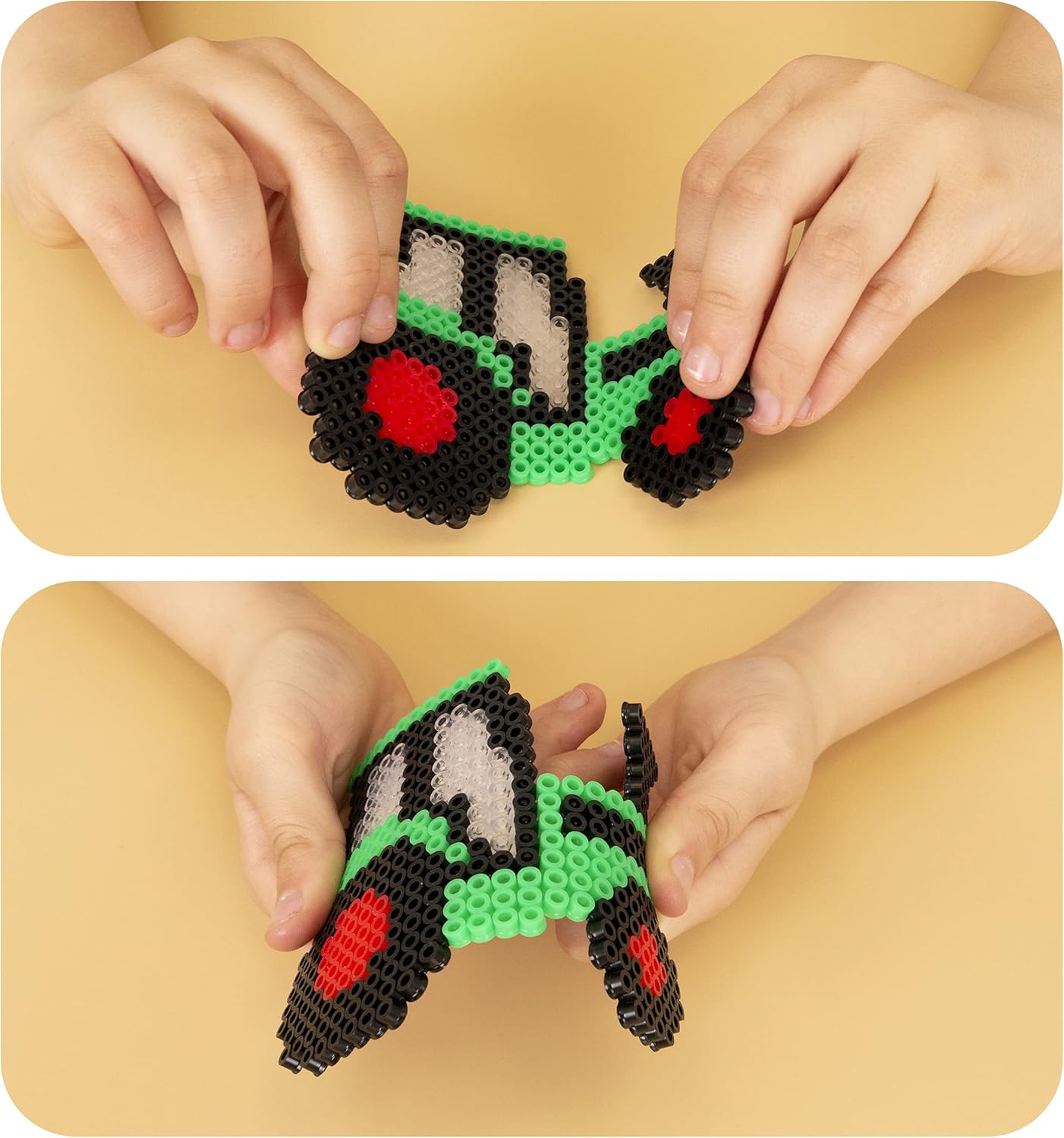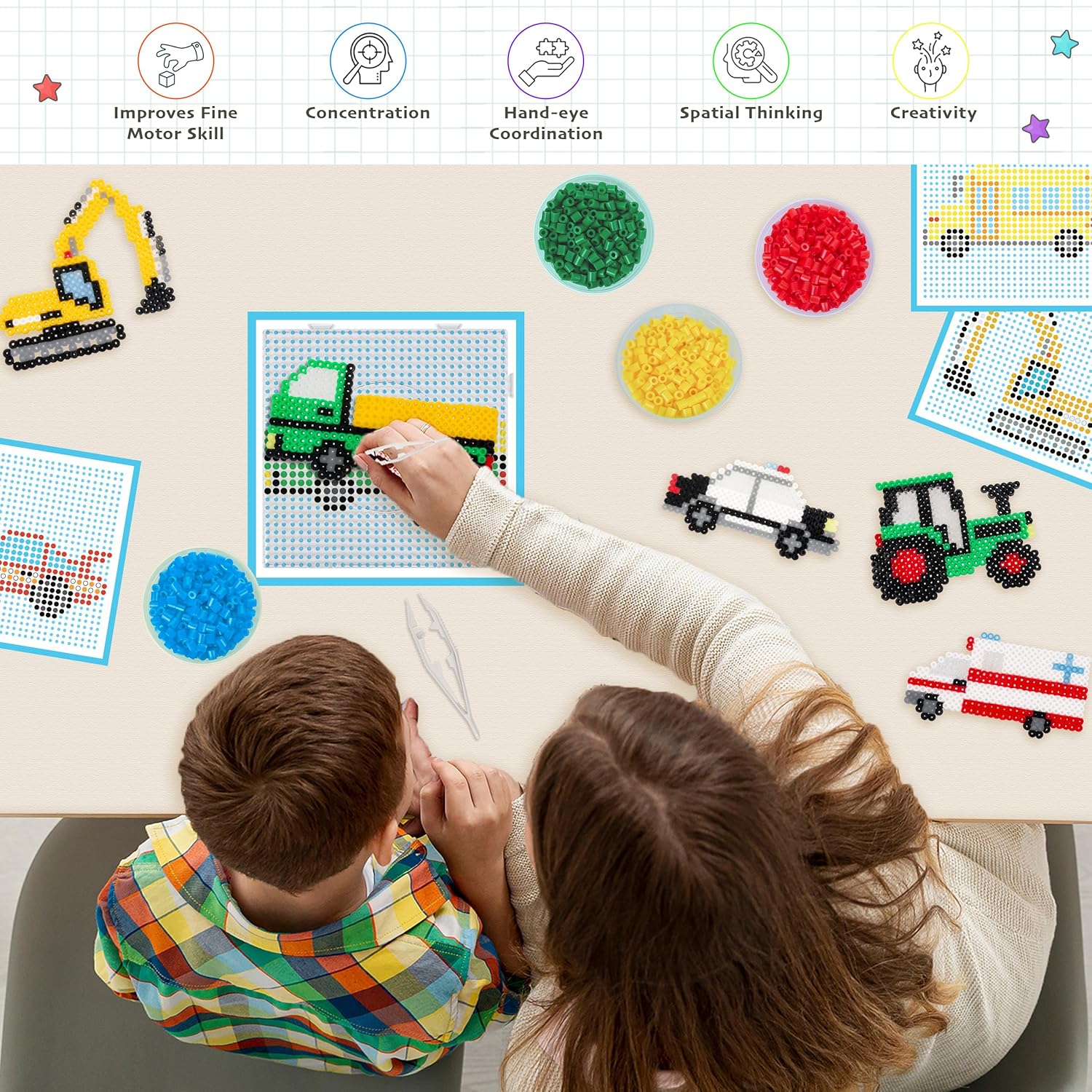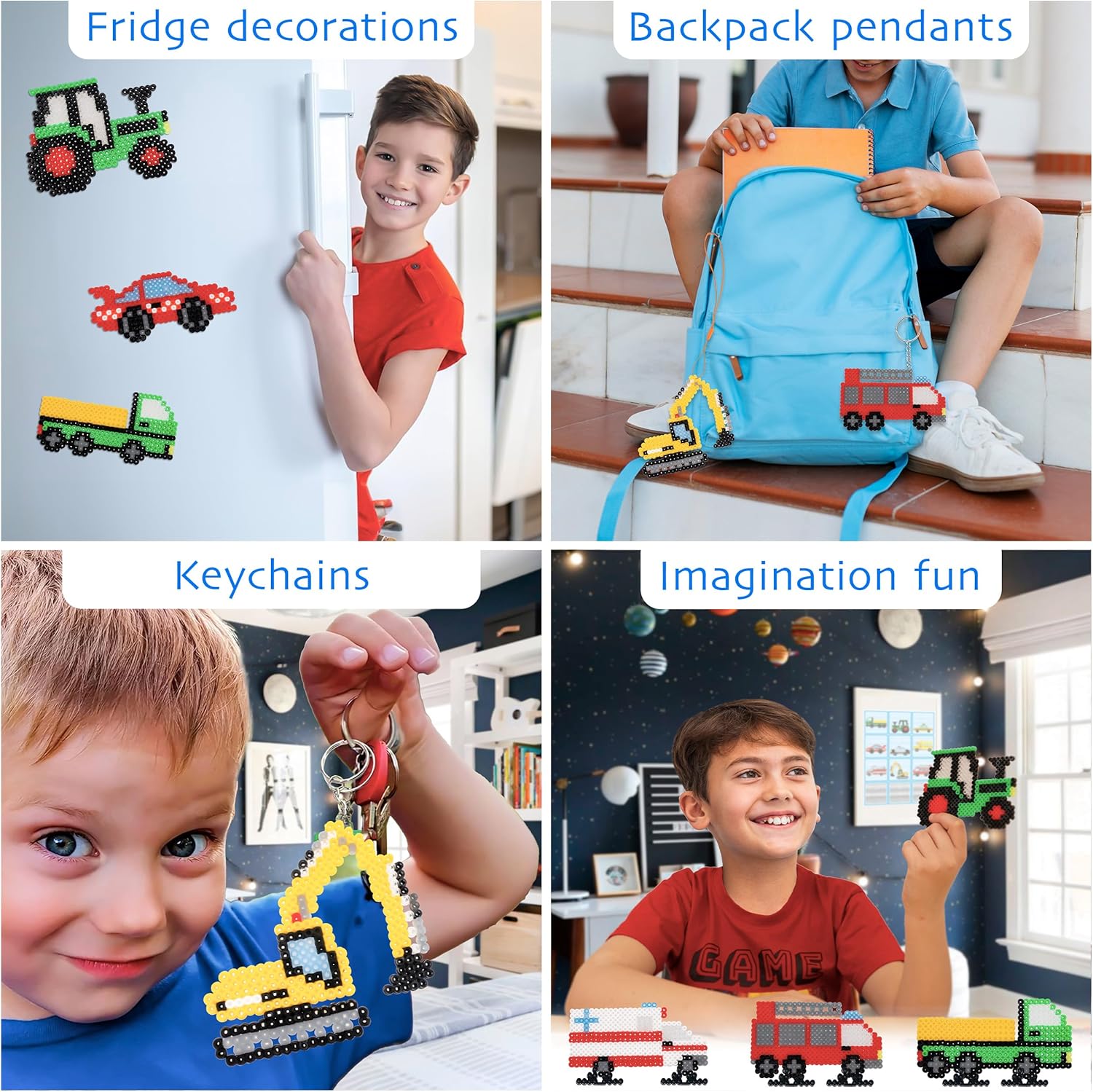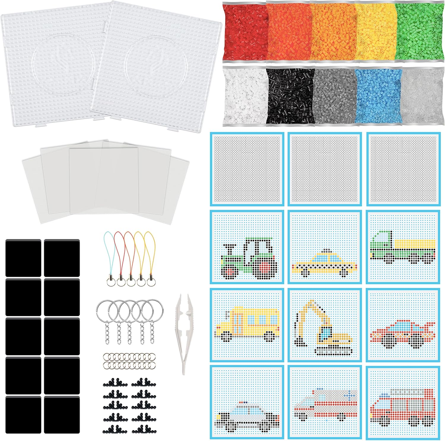 Coffret tutto-in-uno: Il set contiene 6000 perline da stirare da 5 mm in 10 colori, con 12 modelli di veicoli, 2 basi trasparenti, 1 pinza e vari accessori come portachiavi e magneti Crea veicoli colorati: I bambini possono assemblare veicoli come trattori, camion e auto della polizia, trasformandoli in decorazioni per il frigorifero o portachiavi per lo zaino Stimola l'immaginazione e la creatività: Il kit permette ai bambini di dare libero sfogo alla loro fantasia creando auto, animali o forme, migliorando la coordinazione occhio-mano e le abilità creative Facile da usare: Basta disporre le perline sulla base trasparente, coprirle con carta da forno, stirarle per fissarle e rivelare il motivo. Un gioco creativo e semplice da realizzare Idea regalo perfetta: Confezionato in una scatola elegante, questo kit è un regalo ideale per bambini dai 6 ai 12 anni, perfetto per compleanni, Natale o altre occasioni speciali