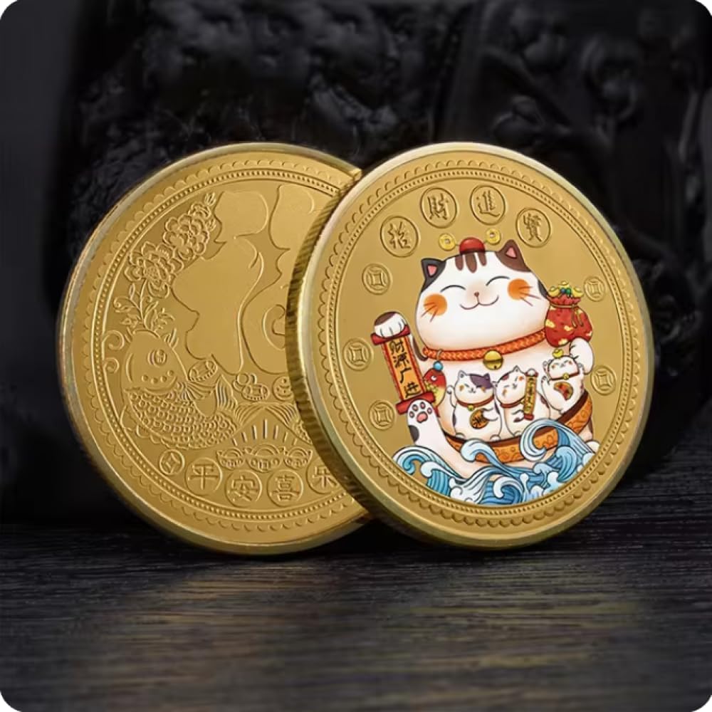 La mascotte cinese del gatto fortunato porta ricchezza e tesori. Monete souvenir da collezione in metallo placcato oro
