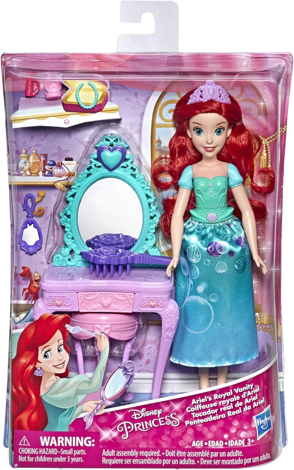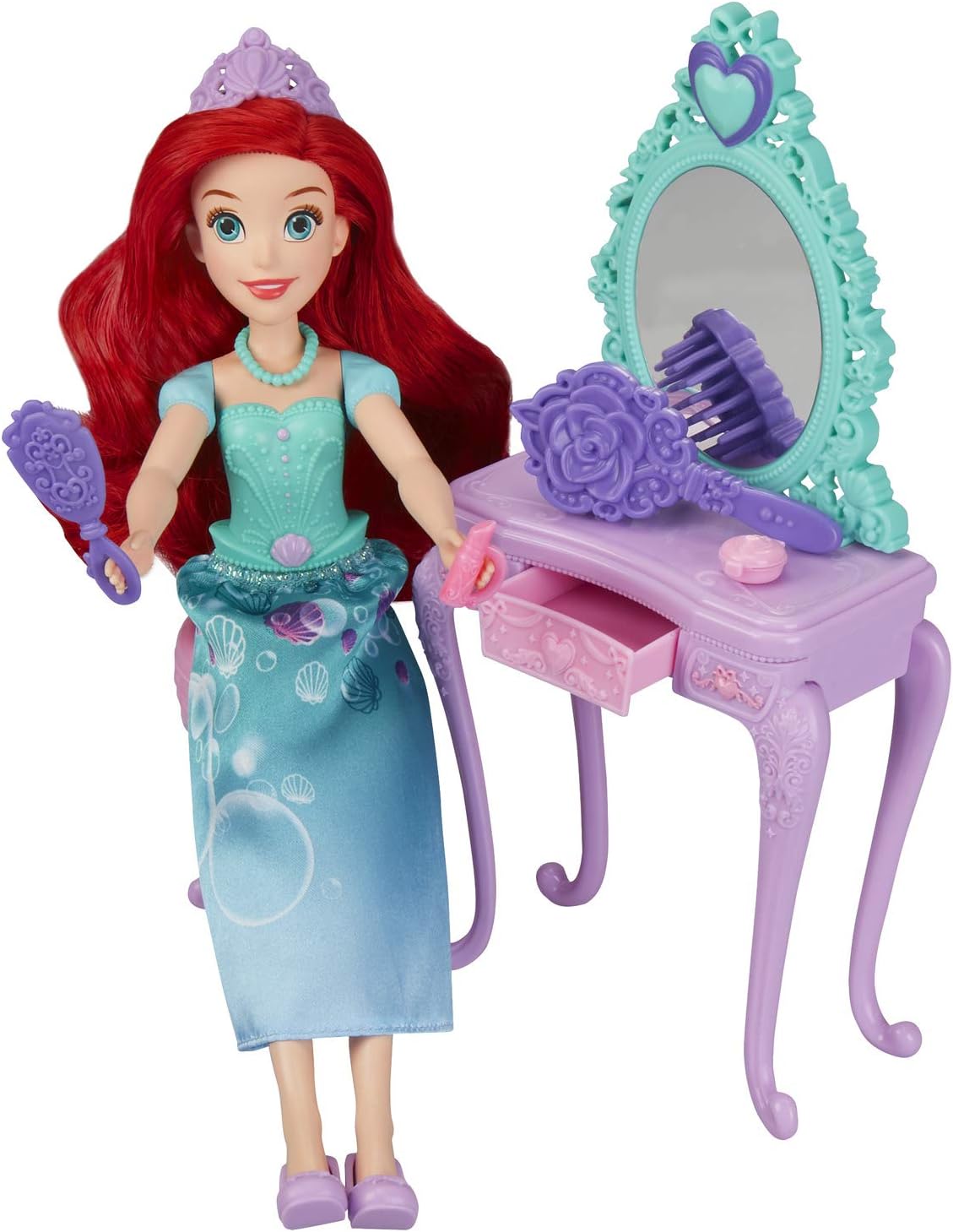 Il set include la bambola Ariel e una toletta con sedia e 6 accessori. La bambola viene fornita con una gonna in tessuto ispirata all'iconico stile cinematografico di Ariel. I bambini possono fingere di aiutare Ariel a prepararsi per un ballo reale o una festa in giardino. Include bambola, gonna, toletta, sedia, 6 accessori e un paio di scarpe. Dai 3 anni.