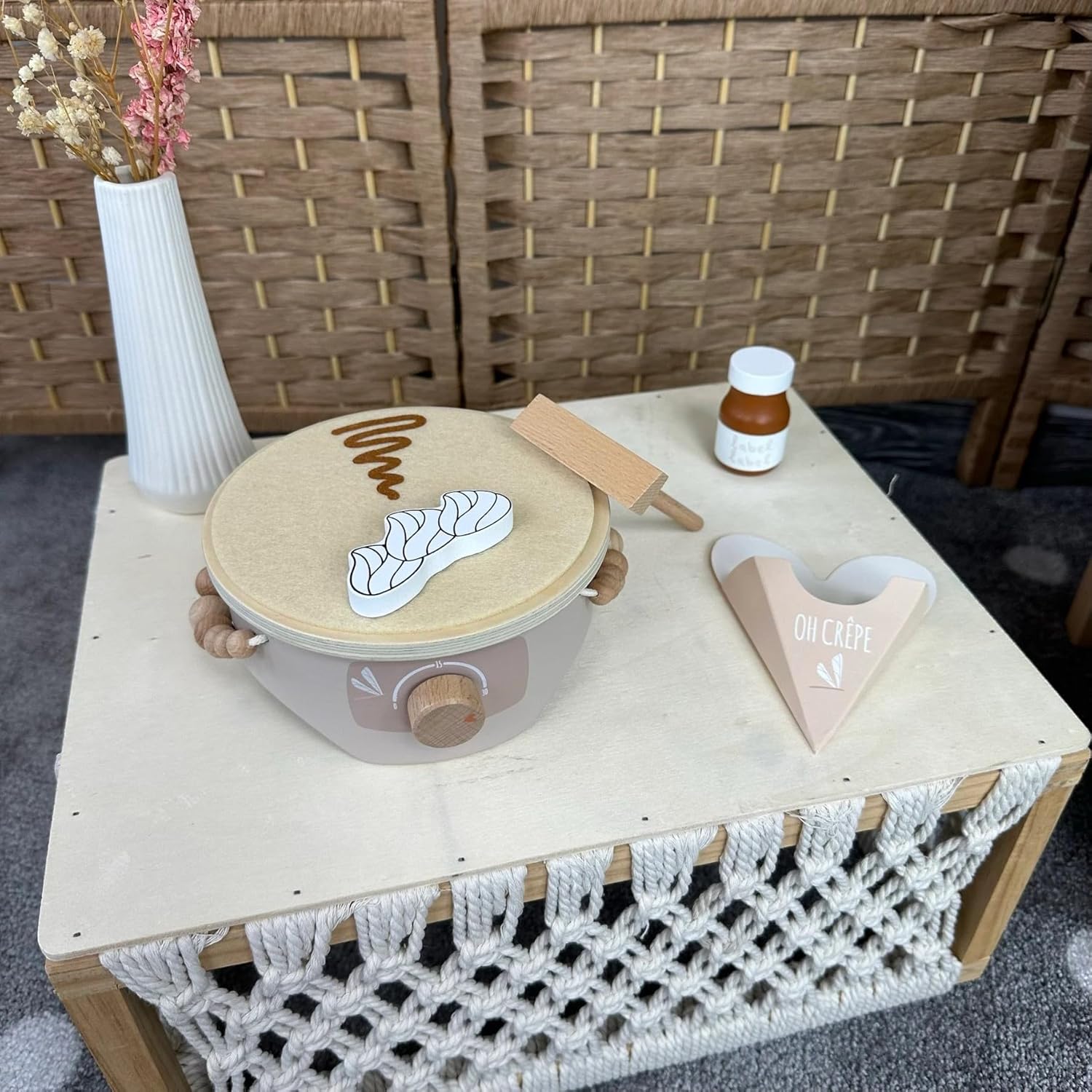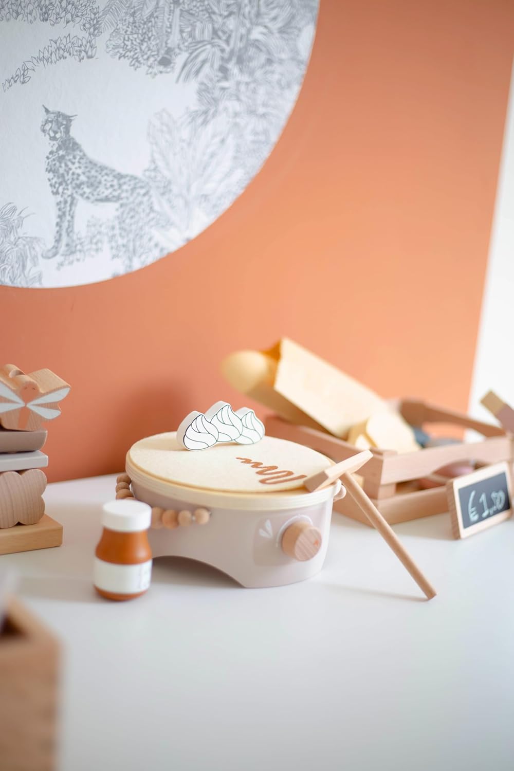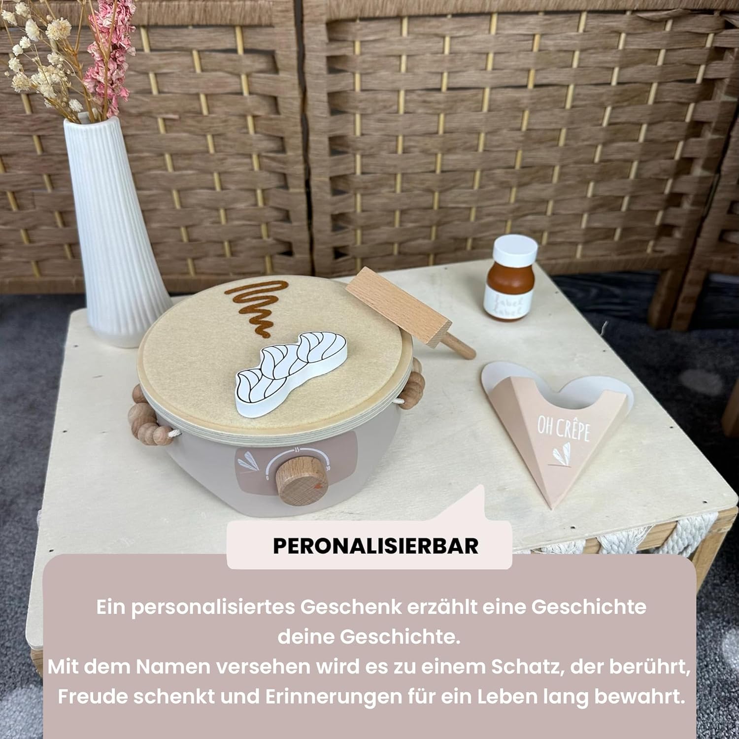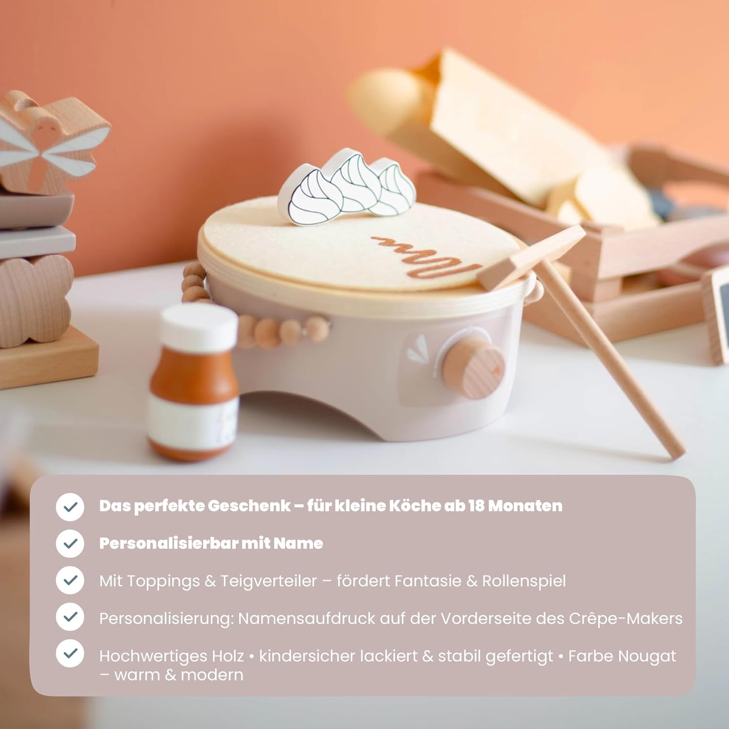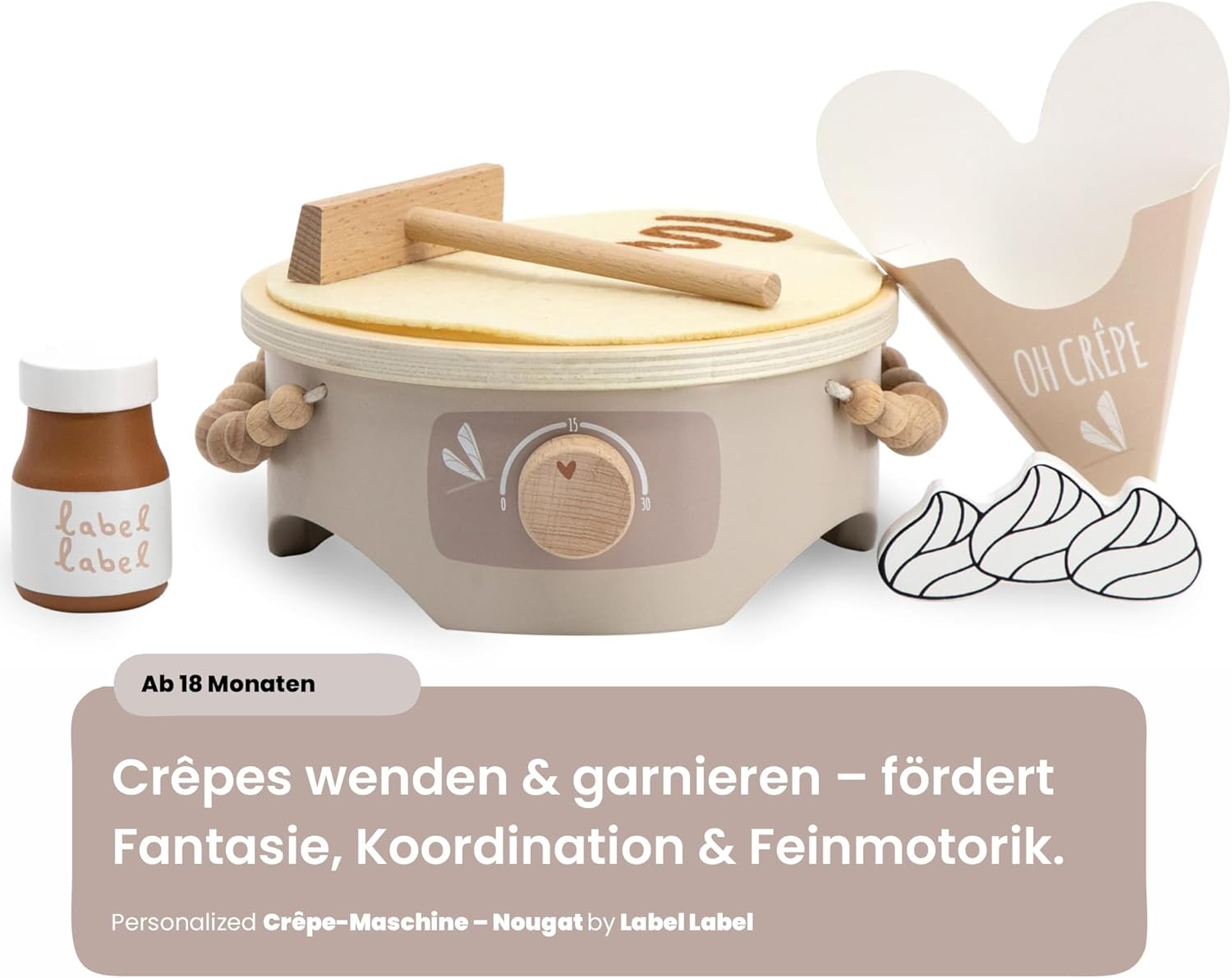Ciao, bello che tu sia lì Siete alla ricerca di un regalo che voglia di giocare insieme – e allo stesso tempo abbellire la cameretta dei bambini? L'Label Crepe Maker (Torrone) porta la sensazione di caffè allo scaffale dei giochi: le calde tonalità di torrone incontrano accenti naturali in legno, dettagli curati e accessori, che ispirano sempre piccoli chef a nuovi "ordini". Con la stampa del nome (stampato) il set diventa il pezzo preferito inconfondibile, perfetto per nascita, battesimo o per il (primo) compleanno e attirerà l'attenzione su ogni tavolo regalo. Perché questo regalo entusiasma Imparare giocando: svoltare, girare, servire: allena le abilità motorie, la coordinazione occhio-mano, la lingua ("ordini di ordine") e il primo gioco di ruolo/regole. La fantasia incontra la vita quotidiana: i bambini giocano a momenti noti del caffetteria, che aumenta la fiducia in se stessi e incoraggia le abilità sociali durante il "servizio" di familiari e amici. Estetica calma: la combinazione di colori torrone sembra calda e confortevole, il legno è piacevole al tatto e un suono delicato, ideale per un angolo di gioco rilassante. Ordine facile: dopo aver giocato, ogni pezzo trova il suo posto: il round successivo è a una sola maniglia. Ben fatto, costruito per molti anni di gioco. Materiale e lavorazione: legno di alta qualità, levigato liscio, con vernici a base d'acqua adatte ai bambini; bordi arrotondati per mani piccole. Design e utilizzo: elementi tipici come piastra per crepe, padella, paletta e "topping" invitano a provare; parti facili da applicare e smontare frequentemente. Valore aggiunto nei dettagli: diversi rivestimenti stimolano l'ordinamento in base a forme/colori e promuovono il primo conteggio e il confronto. Farlo personalmente. Opzione: stampa nome (PRINTED) su un elemento in legno selezionato (ad es. parte anteriore della stazione o parte di servizio) – consigliato fino a circa 12 caratteri. Così diventa bello: tu dai il nome, lo posizioniamo e lo scaliamo armoniosamente con il design, chiaramente leggibile e integrato con stile. Uso pratico: meno confusione tra playdates, gruppi di gattonare o famiglie fratelli; come regalo diventa un pezzo unico. Perché i bambini (e tu) lo amano Il gioco di ruolo "come i grandi" rafforza il linguaggio, l'empatia e la pianificazione ("Chi ottiene quale crepe? "). Le sequenze di gioco brevi e ripetibili si adattano perfettamente alla vita quotidiana in famiglia: cinque minuti di "caffè" tra spuntino pomeridiano e rituale serale. Durevole e di alta qualità: i giocattoli in legno sono robusti, possono essere trasmessi e rimangono visivamente belli, meno oggetti usa e getta, più resistenza. Personalizza oggi, veloce in casa tua Scegliere il nome, facciamo il resto: un elegante set di crepe in toni caldi di torrone, che sembra bello, piace essere giocato e incantato sullo scaffale come sul tavolo da gioco. Ordina ora e crea ricordi personali dai piccoli momenti di gioco. Facts Block Prodotto: Label Label Crepe Maker (Nougat), personalizzabile con nome stampato Dimensioni: formato compatto adatto ai bambini (vedi immagini del prodotto). Età consigliata: a partire da circa 12-18 mesi (sotto supervisione) Materiale: legno, vernici a base d'acqua; bordi arrotondati Contenuto: stazione per crepe, padella, paletta e vari condimenti (a seconda della variante del set). Manutenzione: pulire con un panno asciutto o leggermente umido; conservare in luogo asciutto. Personalizzazione: stampa del nome fino a circa 12 caratteri; posizionamento a seconda della variante/design EAN: 8720663934734.