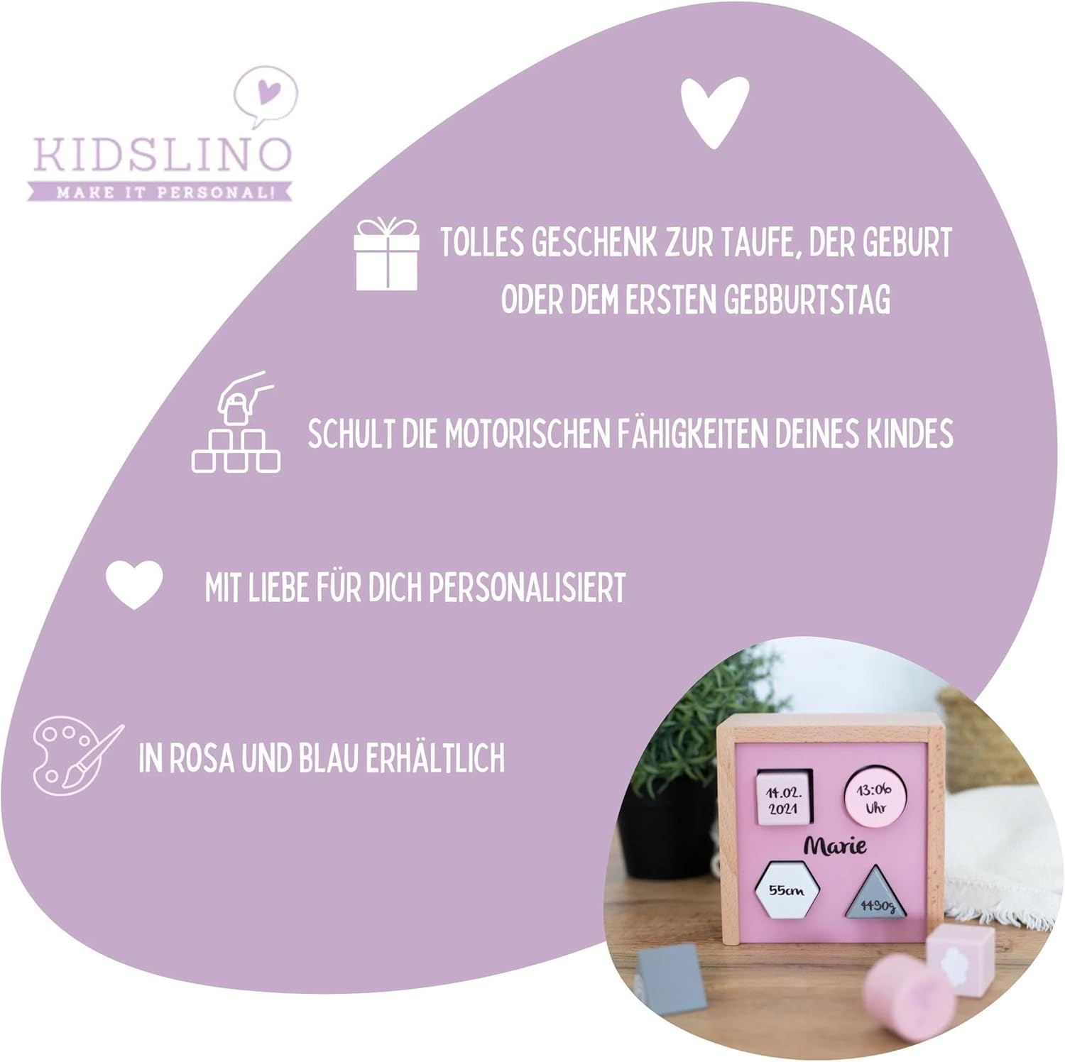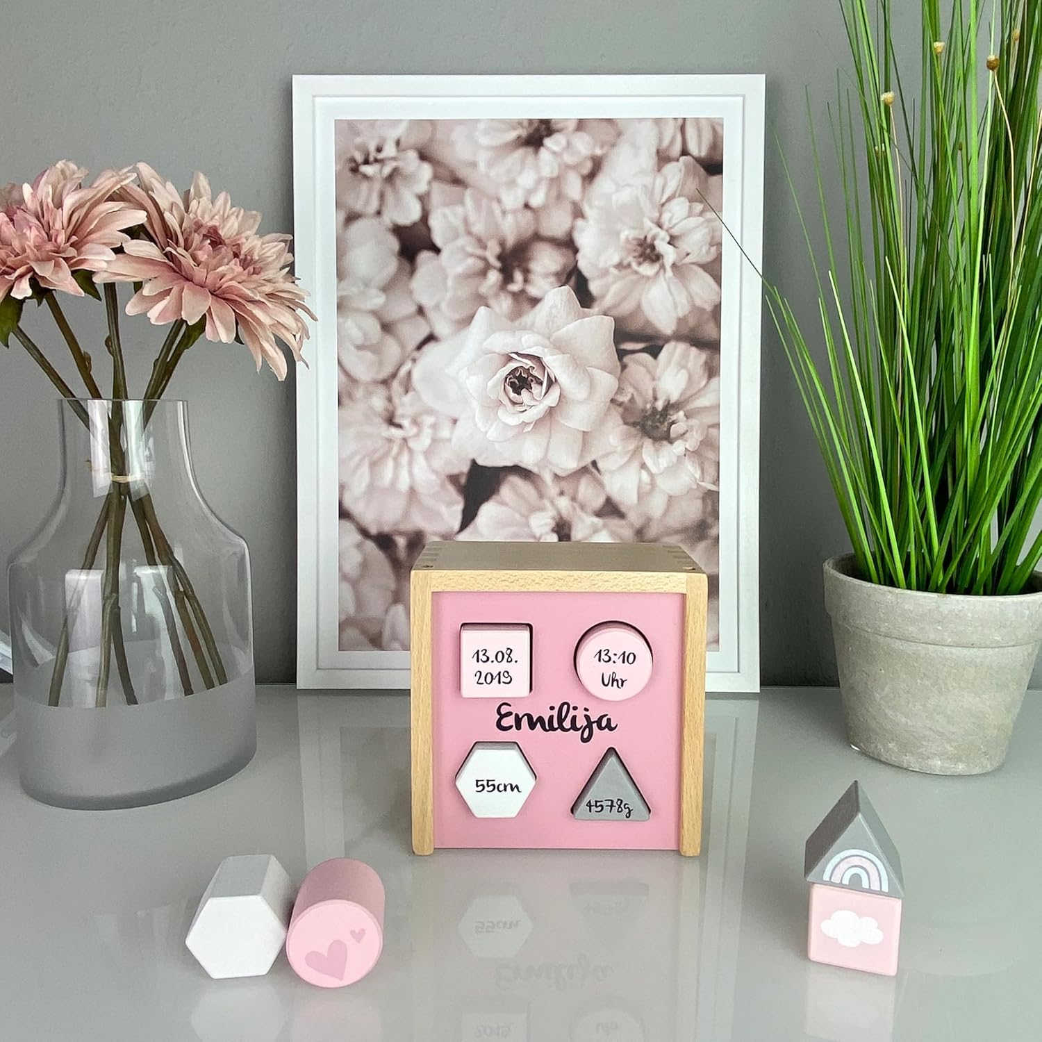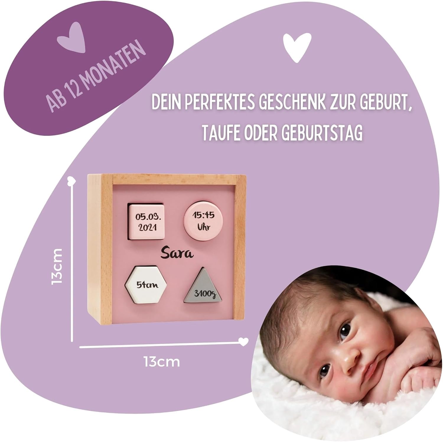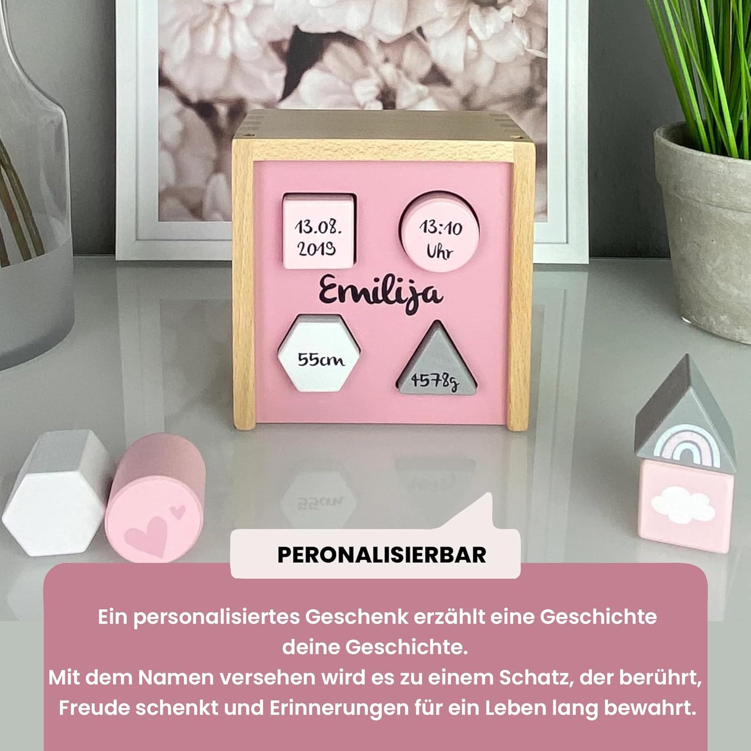 Impara giocosamente: incoraggia la coordinazione occhio-mano, le abilità motorie e il pensiero logico durante la selezione di forme e colori. Personalizzato con il nome stampato: rende la scatola un ricordo unico. Perfetto come regalo personalizzato. Legno di alta qualità: resistente, durevole e sostenibile. Verniciatura a base d'acqua a prova di bambino secondo gli standard UE. Regalo speciale: ideale per nascita, battesimo o 1° compleanno. Un regalo amorevole e personalizzato per i più piccoli. Adatto a partire dai 12 mesi, perfetto per le mani dei bambini piccoli. Giocattolo sicuro che è divertente e supporta lo sviluppo. Design moderno: in delicate tonalità rosa, elegante e senza tempo. Si adatta perfettamente a qualsiasi cameretta.