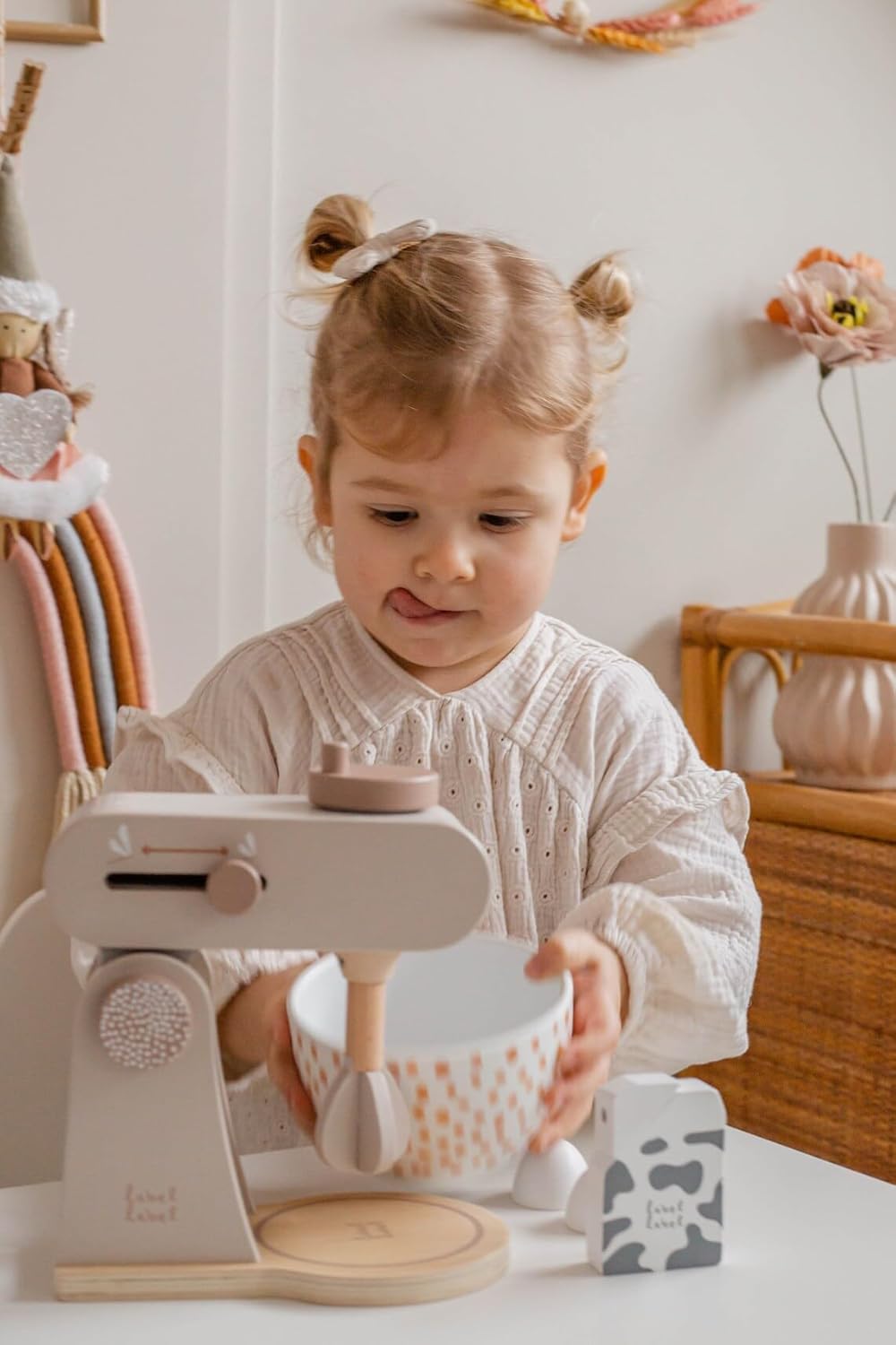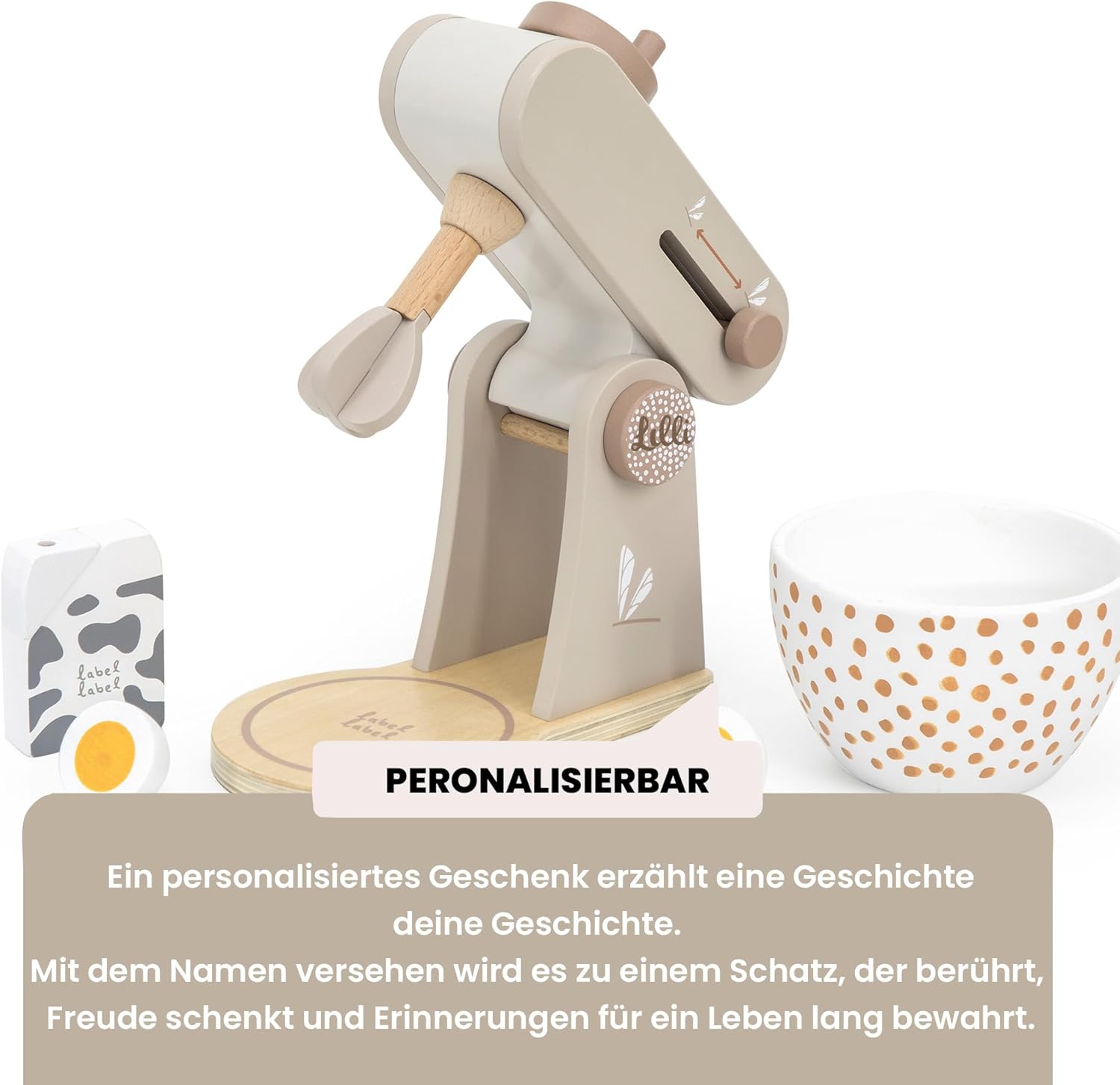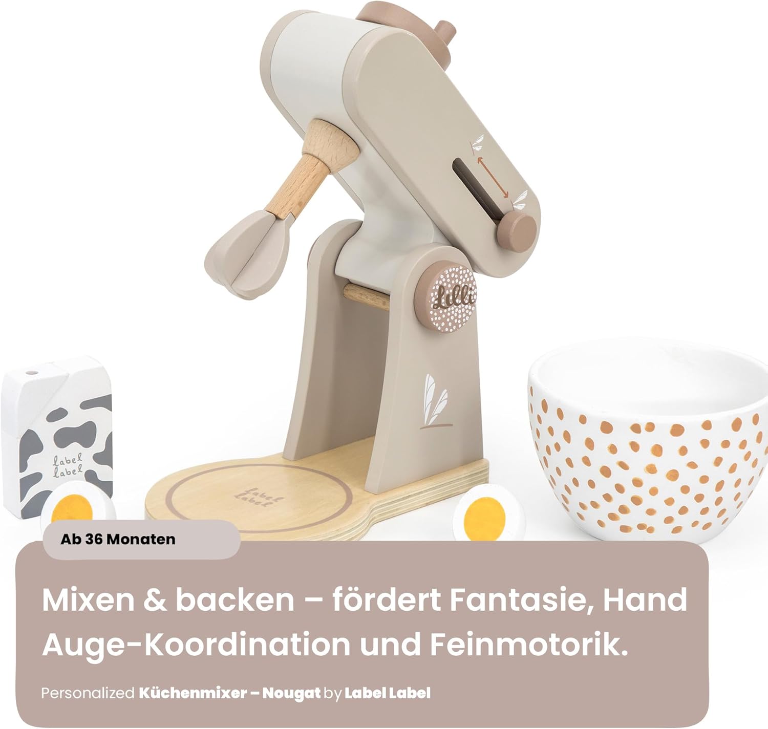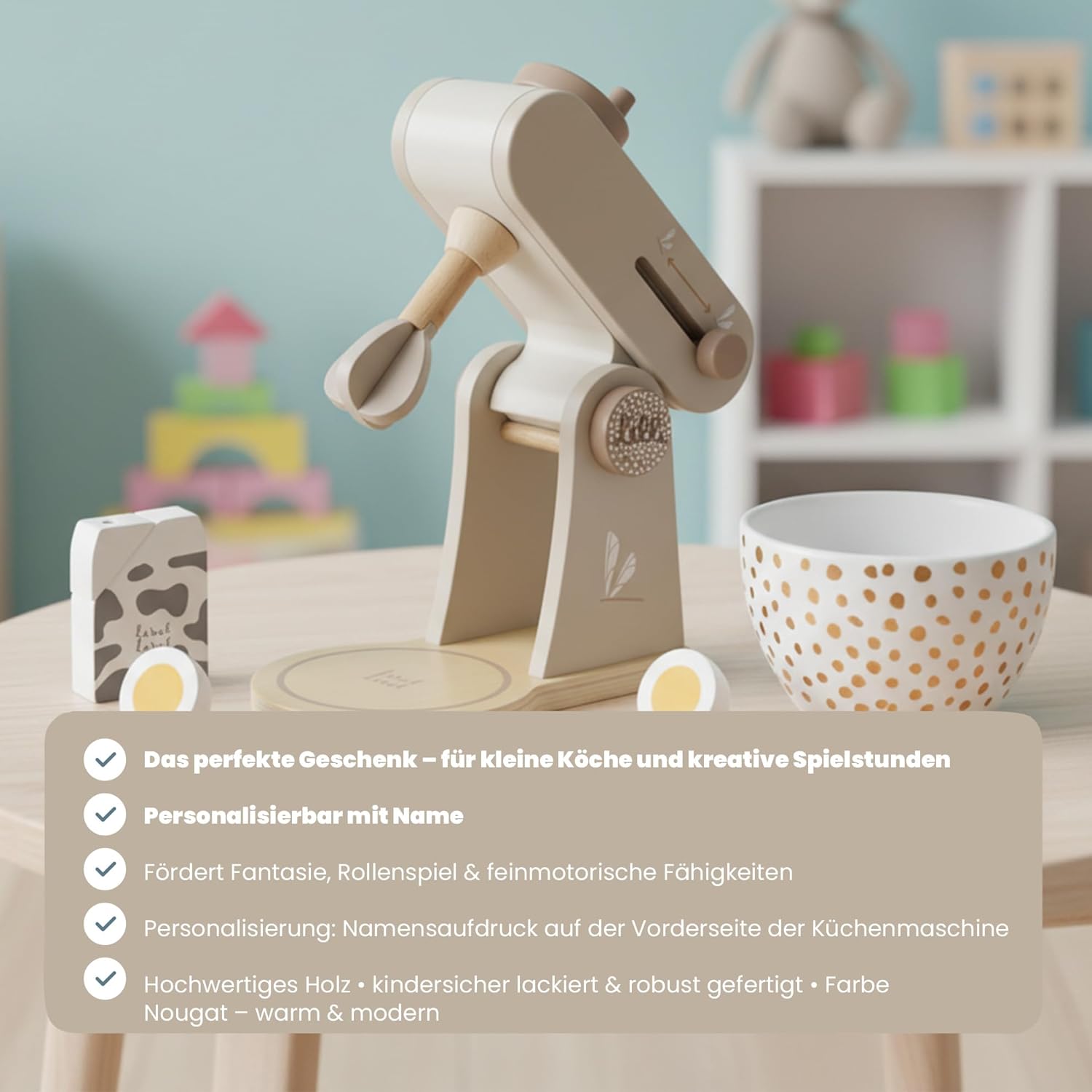 Descrizione prodotto Ciao, bello che tu sia lì Siete alla ricerca di un regalo che voglia di giocare insieme – e allo stesso tempo abbellire la cameretta dei bambini? La macchina da cucina in legno Label Label – Torrone (personalizzabile) porta la grande cucina nelle mani dei bambini: calde tonalità naturali, dettagli curati e accessori che ispirano sempre i piccoli chef a nuove idee di ricetta. I bambini ruotano, dosano e "mescolano" come i grandi, senza schermo e al loro ritmo. Con il nome stampato (stampato) il robot da cucina diventa il pezzo preferito e un ricordo che rimane – ideale per nascita, battesimo o compleanno. Perché questo regalo entusiasma Imparare giocando: ruotare la manopola, spostare la leva, inserire la ciotola: allena le abilità motorie, la coordinazione occhio-mano e la prima risoluzione dei problemi. Fantasia & Linguaggio: "Pesare gli ingredienti", "Mescolare la pasta", "Cuocere torte" – I dialoghi di ruolo promuovono il vocabolario, l'empatia e la pianificazione comune ("Chi mescola? Chi ha servito? "). Estetica tranquilla: la combinazione di colori torrone è calda e confortevole, il legno è comodo da tenere in mano e suona silenziosamente, perfetto per un angolo di gioco rilassante. Ordine facile: dopo aver giocato ciotola, agitatore e "ingredienti" trovano il loro posto – questo mantiene la cucina ordinata e invita al turno successivo. Ben fatto, costruito per molti anni di gioco. Materiale e lavorazione: legno di alta qualità, levigato e rifinito con colori a base d'acqua adatti ai bambini; bordi arrotondati per mani piccole. Design e utilizzo: elementi tipici come braccio di agitazione, manopola/"selezione del livello" e ciotola rimovibile invitano a provare; parti maneggevoli per montaggio e smontaggio frequenti. Accessori con valore aggiunto: diversi "ingredienti" (ad es. Come farina, zucchero, uovo) stimolano la selezione, il conteggio e il confronto: gli ordini e le piccole routine vengono praticati in modo giocoso ("prima ingredienti, poi mescola"). Farlo personalmente. Opzione: stampa nome (PRINTED) su un elemento in legno selezionato (ad es. parte anteriore della macchina o parte di servizio) – consigliato fino a circa 12 caratteri. Così diventa bello: tu dai il nome, lo posizioniamo e lo scaliamo armoniosamente con il design, chiaramente leggibile e integrato con stile. Uso pratico: meno confusione tra playdates, gruppi di gattonare o famiglie fratelli; come regalo diventa un pezzo unico. Perché i bambini (e tu) lo amano Il gioco di ruolo vicino a tutti i giorni rafforza la fiducia in se stessi, il senso del linguaggio e le abilità sociali, dalla chiamata agli ingredienti al "tavolo della famiglia". Sequenze brevi e ripetibili si adattano perfettamente al ritmo della famiglia – cinque minuti di "pasticceria" tra snack e rituale serale. Durevole e di alta qualità: i giocattoli in legno sono robusti, possono essere trasmessi e rimangono visivamente belli, meno oggetti usa e getta, più resistenza. Personalizza oggi, veloce in casa tua Scegliere il nome, facciamo il resto: un'elegante macchina da cucina in legno che ha un bell'aspetto, ama essere giocata e incantata sullo scaffale come sul tavolo da gioco. Ordina ora e crea ricordi personali dai piccoli momenti di gioco. Facts Block Prodotto: Label Label - Macchina da cucina in legno – Torrone, personalizzabile con nome stampato Dimensioni: formato compatto adatto ai bambini (vedi immagini del prodotto). Età consigliata: a partire da circa 18 mesi (sotto supervisione) Materiale: legno, vernici a base d'acqua; bordi arrotondati Contenuto: robot da cucina con braccio di agitazione e manopola, ciotola e accessori corrispondenti (a seconda della variante del set). Manutenzione: pulire con un panno asciutto o leggermente umido; conservare in luogo asciutto. Personalizzazione: stampa del nome fino a circa 12 caratteri; posizionamento a seconda della variante/design EAN: 8720663937087. Avviso di sicurezza Da utilizzare sotto la supervisione di un adulto.