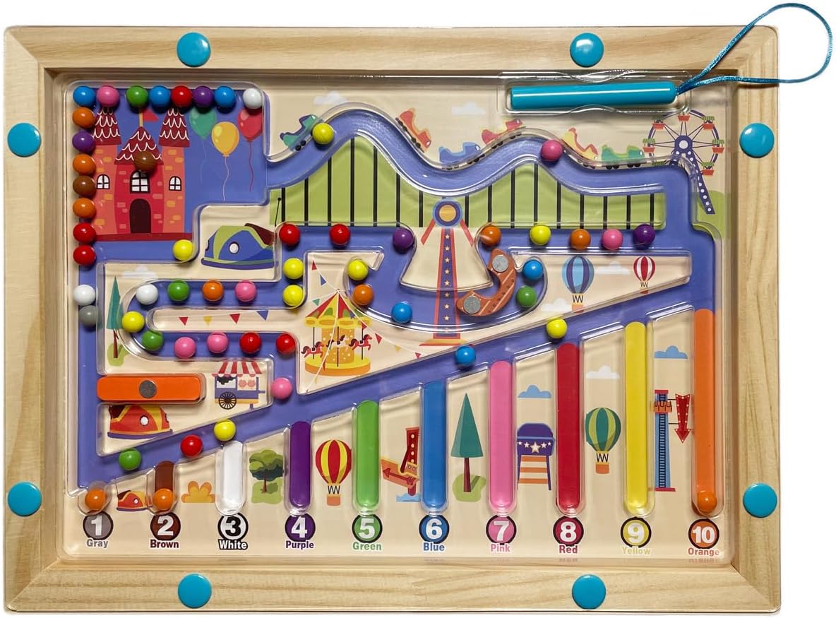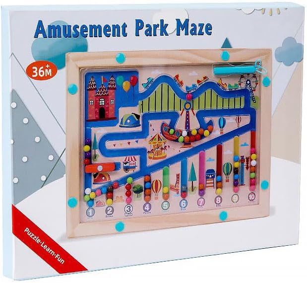Interessante gioco di abbinamento di colori e numeri. Questo labirinto magnetico di colori e numeri è ideale per bambini dai 3 anni in su. L'asta magnetica può essere facilmente spostata sulla superficie in vetro acrilico per risolvere il gioco dei colori e dei numeri. Prezioso giocattolo educativo. Questa lavagna magnetica aiuta i bambini a imparare i colori e i numeri, a sviluppare le capacità di riconoscimento e conteggio dei numeri, a migliorare la concentrazione e le capacità motorie e a tenerli occupati per ore. Calda interazione genitore-figlio. Accompagna il tuo bambino durante emozionanti sessioni di gioco con la lavagna colorata magnetica, ideale per trascorrere del tempo insieme lontano dagli schermi. In questo modo potrete prendervi una pausa dalla vita di tutti i giorni e godervi momenti preziosi insieme. Costruzione robusta. Il labirinto di colori magnetico è realizzato in legno spesso e verniciato con vernice atossica a base d'acqua. Bordi e angoli arrotondati e lisci e 8 chiodi garantiscono stabilità e sicurezza per le mani dei bambini piccoli. Ottimo regalo. Questo labirinto di colori magnetici è un regalo perfetto per Natale, Halloween, Capodanno, compleanni, vacanze e altre occasioni. È ideale per l'uso in casa o all'aperto.