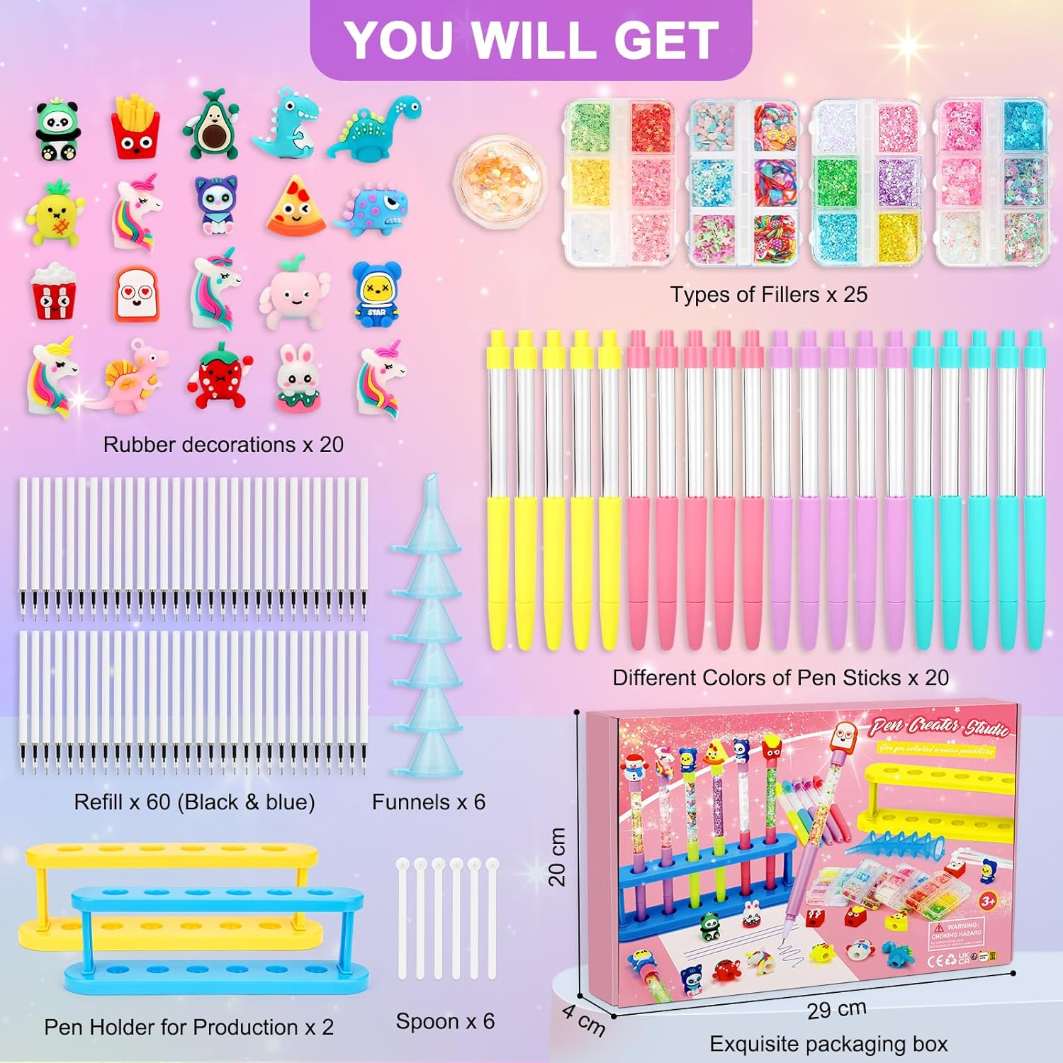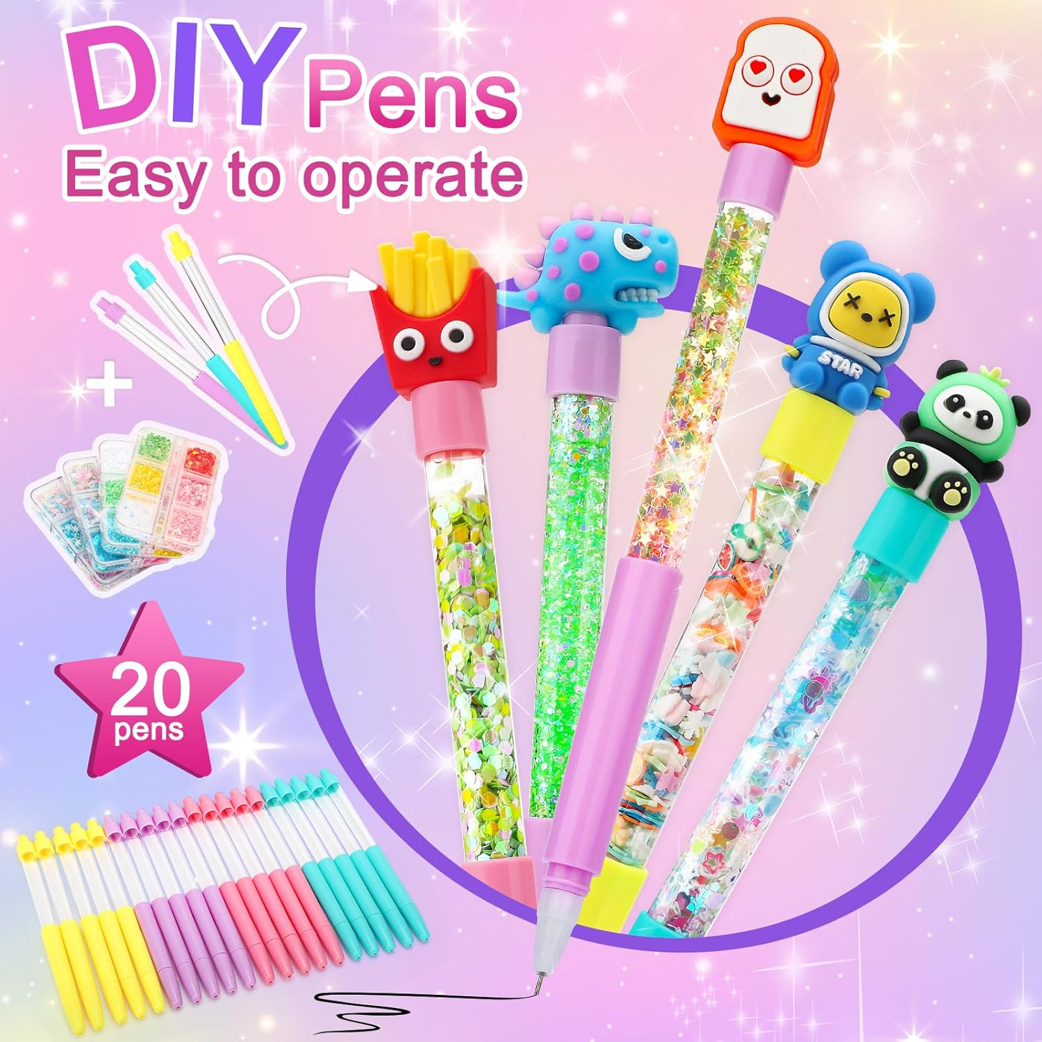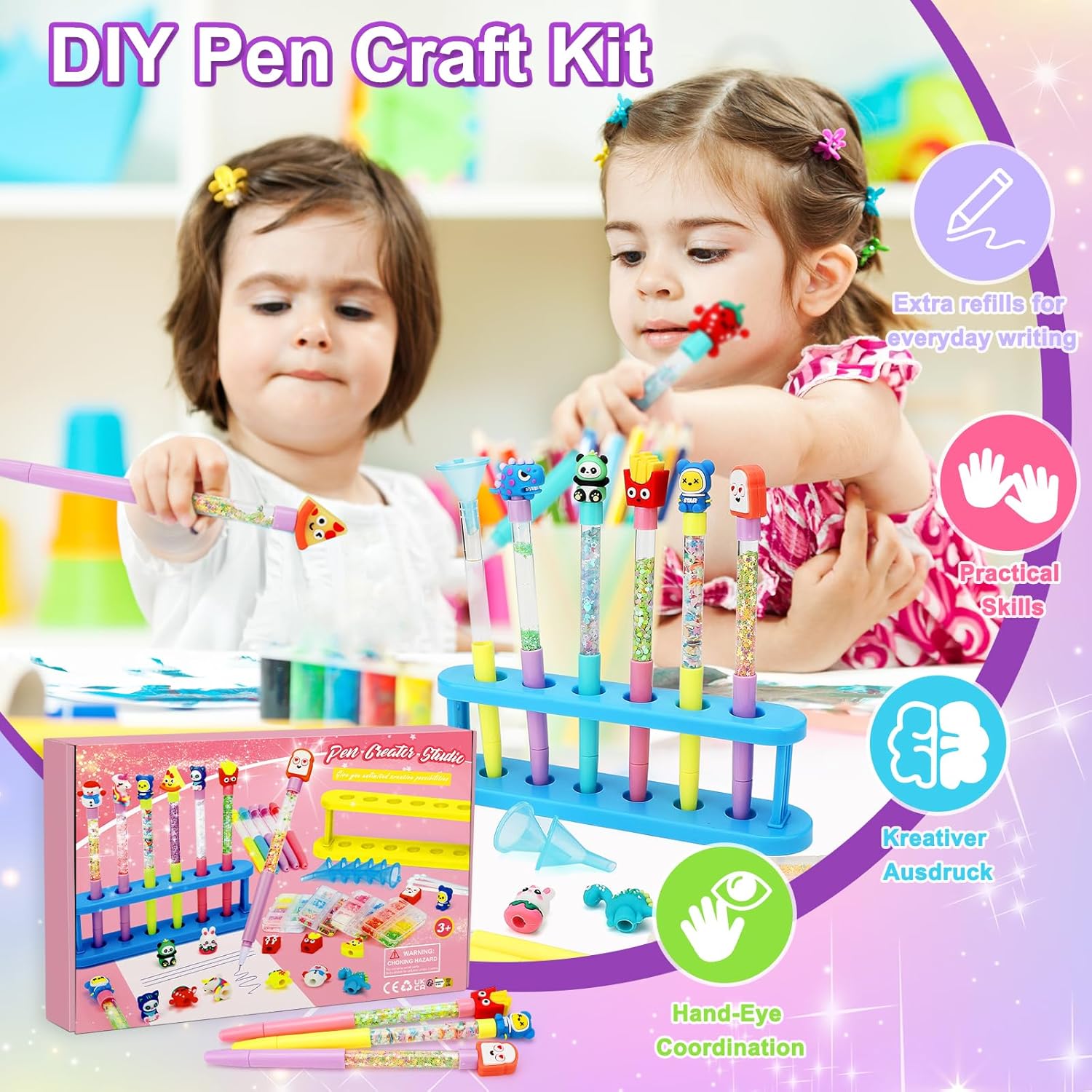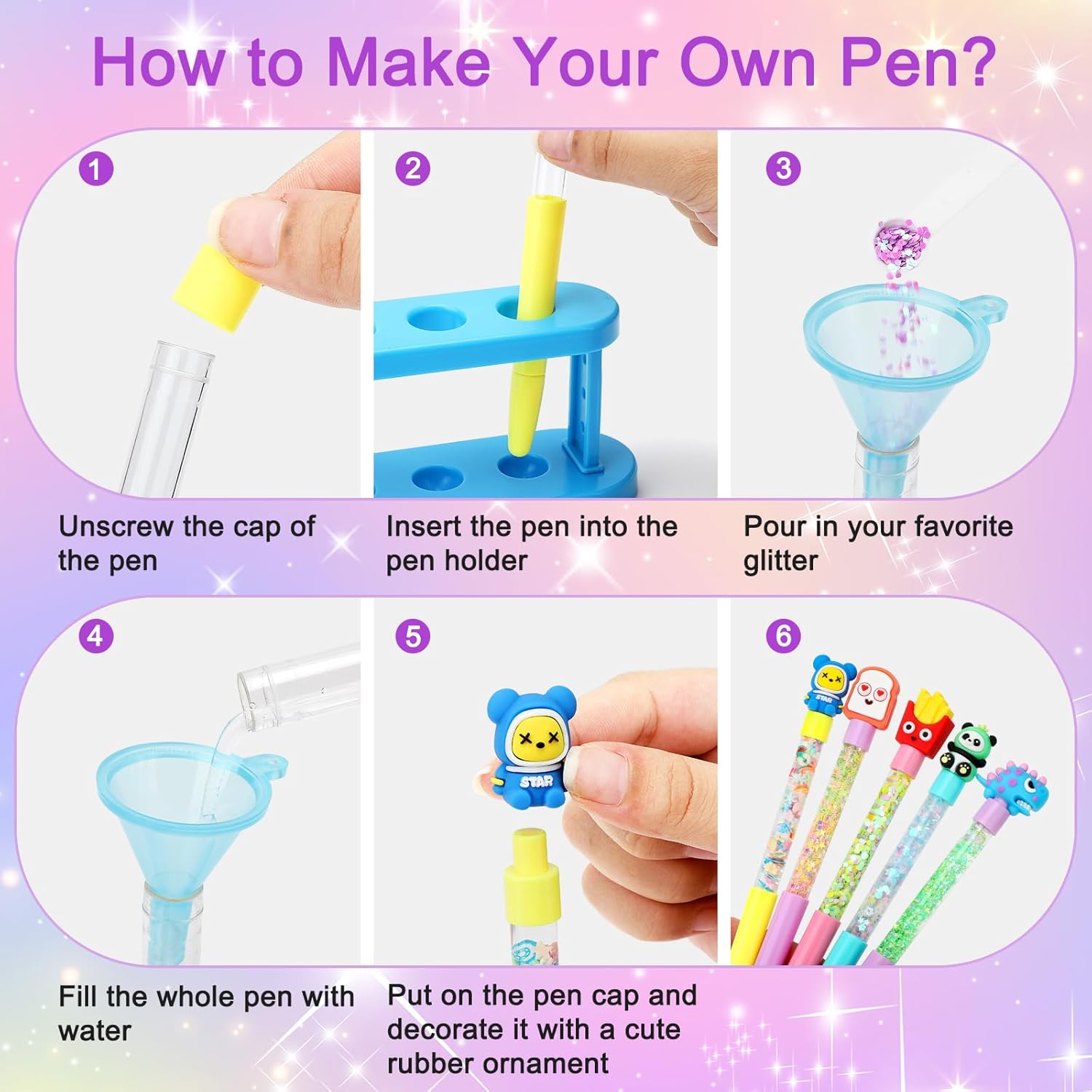 Lavoretti Creativi per Bambini - Il laboratorio delle penne contiene 20 penne (incluse 60 ricariche), due portapenne, 6 imbuti, 6 cucchiai, 25 paillettes, accessori ricchi per portare una creatività illimitata e sorprendente, adatti per giochi bambina 6-12 anni. Laboratorio Degli Evidenziatori - Con amore, abbiamo scelto 20 deliziosi cappelli e 25 scintillanti paillettes per far volare la fantasia dei bambini per per creare penne personalizzate. Fino a 20 bambini possono usarlo insieme, ideale per feste e laboratori creativi. Idee Regalo Bambino - Regali scintillanti, belle confezioni e un'ampia gamma di accessori fanno laboratorio delle penne il regalo creativo ideale per le bambine. Se siete alla ricerca di un regalo unico che diverta e ispiri, questo è quello che fa per voi. Giochi Creativi Bambina di età superiore ai 5 anni - I lavori manuali sviluppano abilità, creatività e perseveranza. I lavoretti creativi per bambini rafforzano l'autostima e le relazioni genitori-figli attraverso attività divertenti Regalo Bambina di alta qualità: La confezione del laboratorio delle penne contiene 20 penne, il guscio della penna è in plastica, il refill è a scrittura liscia, sicuro e ad asciugatura rapida, la linea è liscia e accattivante, la scrittura non sarà sporca o sporca le ricariche, 60 ricariche di ricambio possono essere utilizzate per lungo tempo.