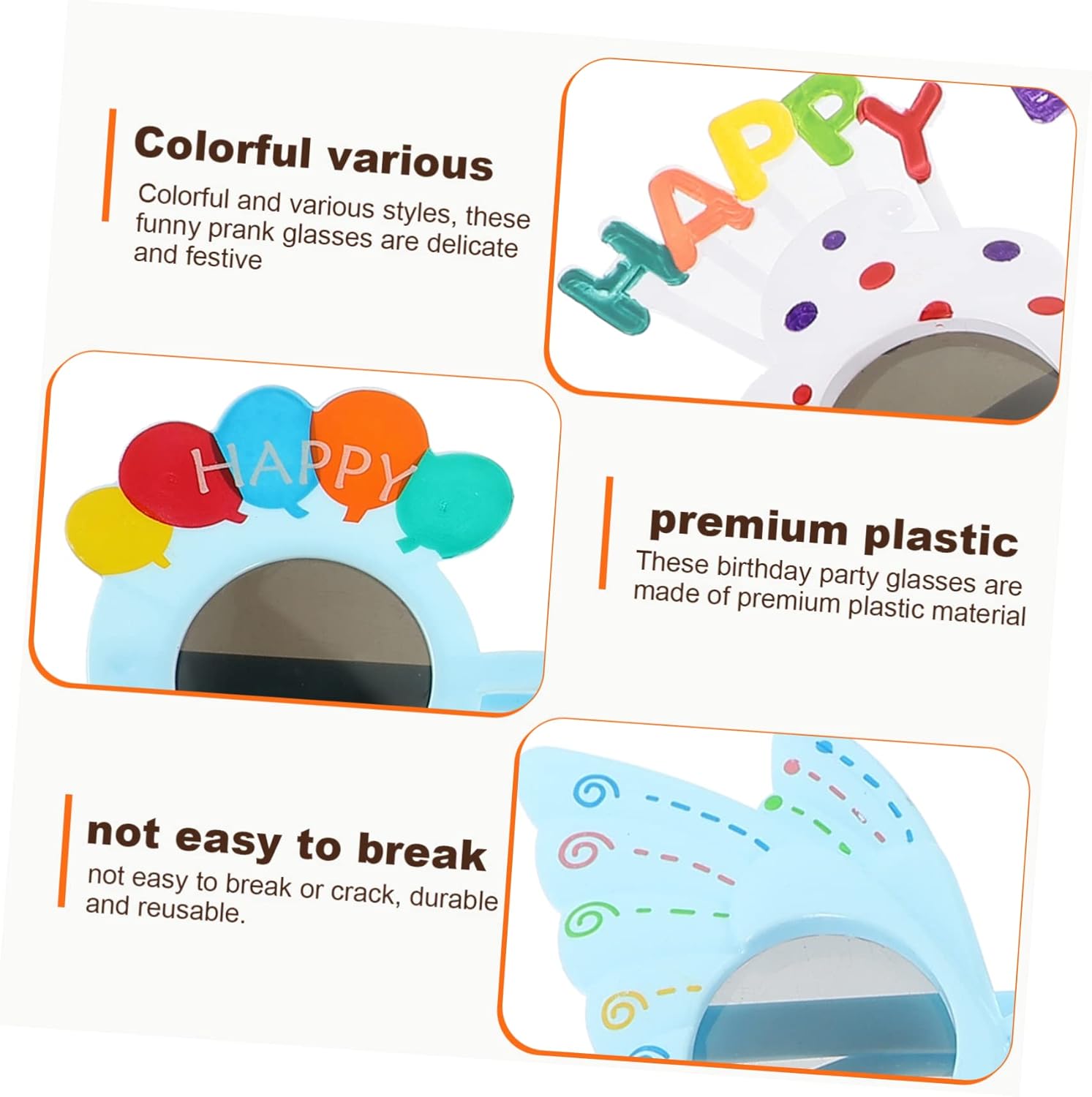 dei pacchetti 4 bicchieri da compleanno Caratteristiche -Materiale: decorazione di bicchieri di plastica per compleanno -Dimensioni: 16,00X10,00X1,00 cm/6,29X3,93X0,39 pollici divertenti per adulti -Colore: per feste di compleanno in colori assortiti - Questi bicchieri da compleanno sono creativi e colori vivaci, eleganti e particolari, sono degli splendidi bicchieri da usare come oggetti di scena fotografici per le feste di compleanno. - Un bel per la tua famiglia o i tuoi amici, condividi una gioia e stupiscili ancora di più, scatta foto più distintive con creativi. - Perfetti per feste di compleanno, matrimoni, feste di Natale, rave party, feste luminose, ecc. da festa. - Realizzati con materiali affidabili, questi da sole sono sicuri e durano a lungo, perfetti per le feste di compleanno. - Dimensioni compatte e peso leggero, portatili, facili da indossare e riporre, per offrirti un sacco di praticità e divertenti per le feste. Descrizione della merce divertenti per compleanno Questi da sole per compleanno realizzati con materiali sicuri e leggeri sono unici, con un design creativo, sono adatti per feste di famiglia o festival da indossare. per feste di compleanno Non si piegheranno o deformeranno facilmente, sono duri e resistenti allo sbiadimento, non facili da rompere, leggeri e di dimensioni compatte, possono essere portati in e indossati comodamente