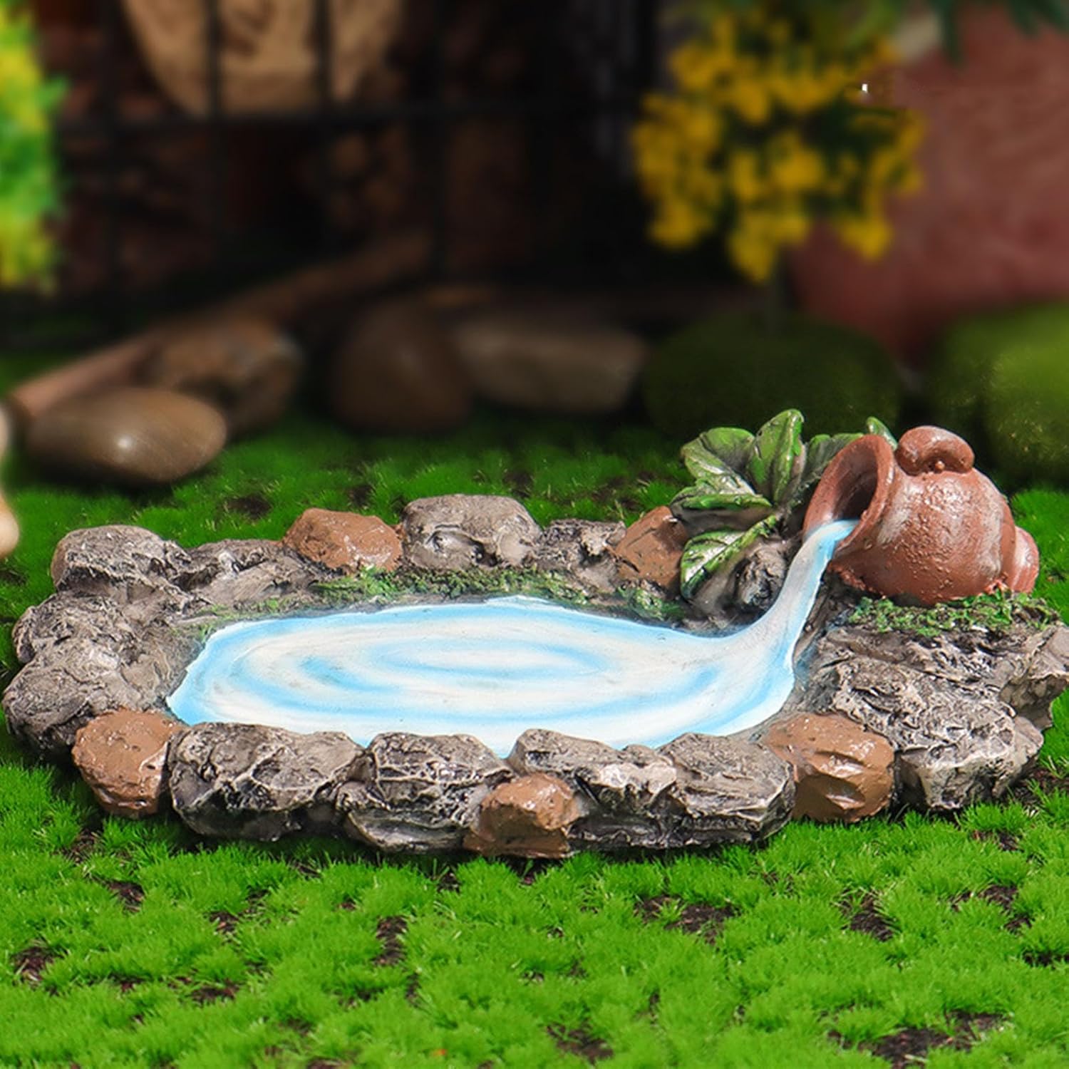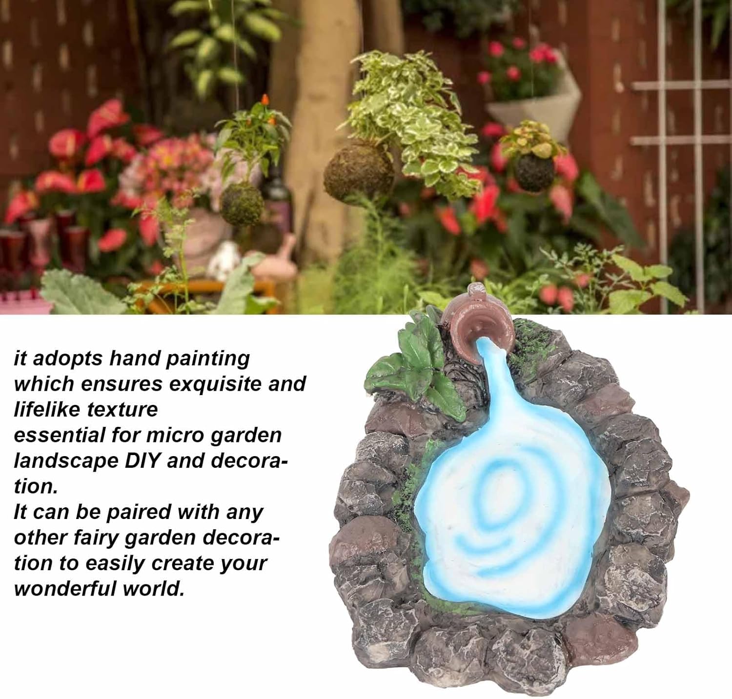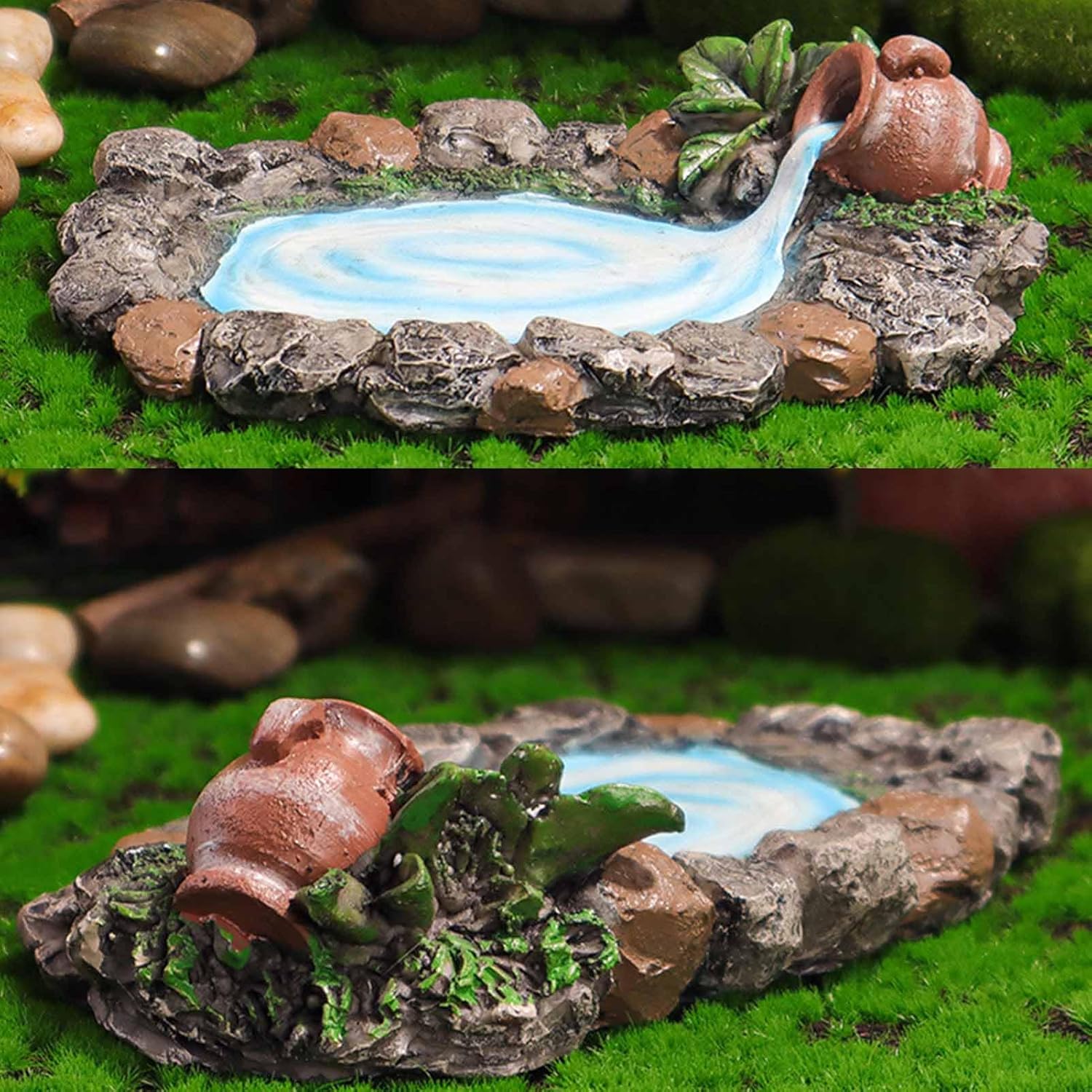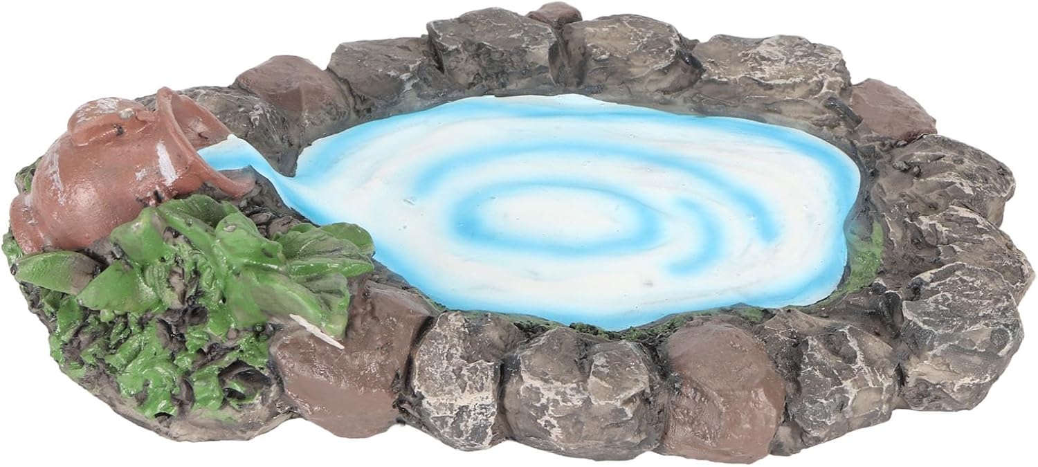 Dipinto a mano: questo laghetto roccioso da giardino fatato adotta la pittura a mano che garantisce una consistenza squisita e realistica, l'acqua e scorre costantemente nello stagno dal vaso. dettagli: questo laghetto in miniatura presenta anche pietre dettagliate con piante ed erba ai lati, essenziali per il fai-da-te e la decorazione del micro giardino. Ampia applicazione: questo laghetto roccioso da giardino in miniatura è adatto per mini giardini, terrazze, decorazioni da tavolo, ecc. Può essere abbinato a qualsiasi decorazione da giardino fatato per creare facilmente il tuo mondo meraviglioso. Materiale: questo laghetto in pietra in miniatura è realizzato in materiale di resina sintetica di alta qualità, resistente e non facile da rompere e sbiadire. ideale: questo laghetto da giardino fatato è un'ottima scelta quando vuoi dimostrare il tuo amore ad amici e familiari appassionati di giardini fatati.