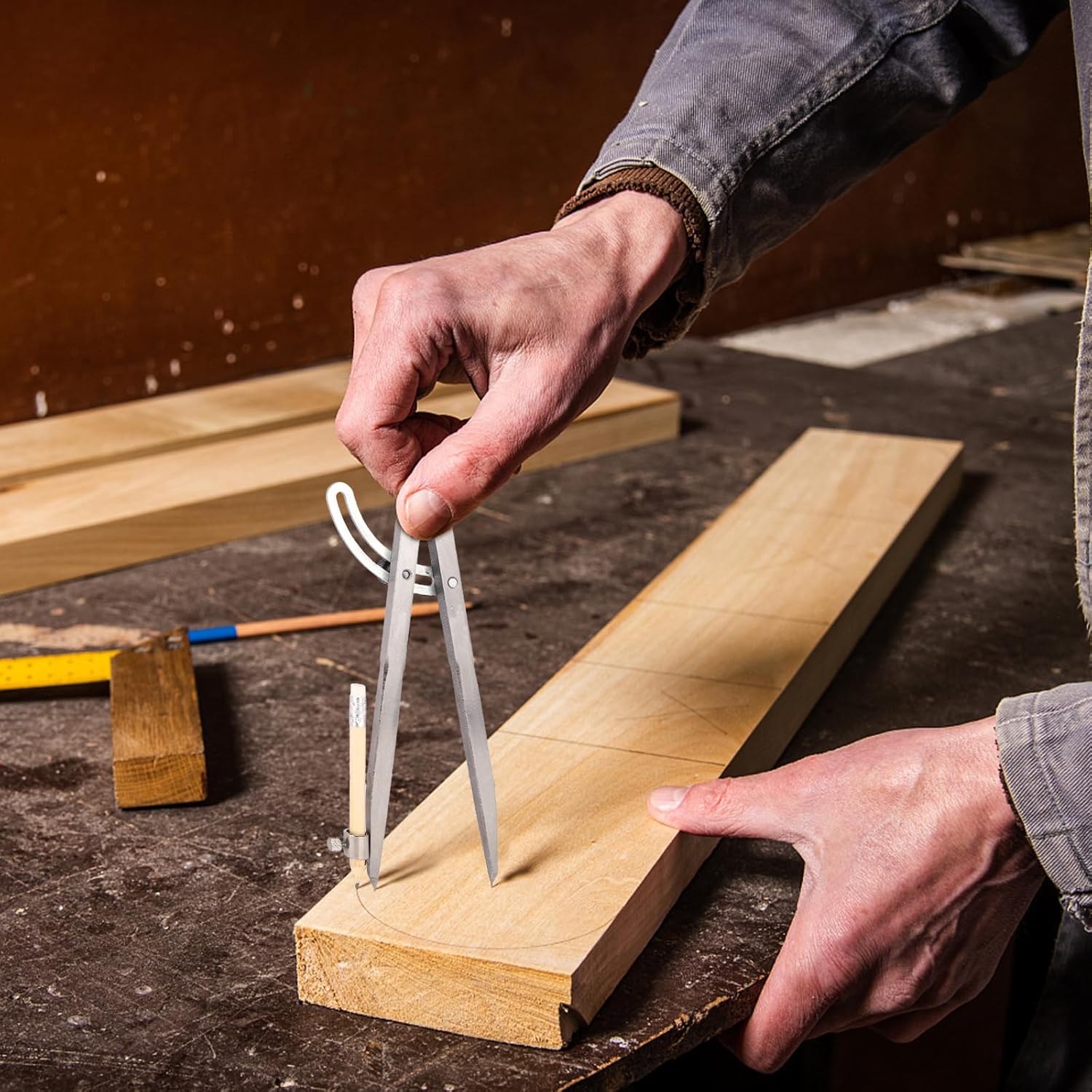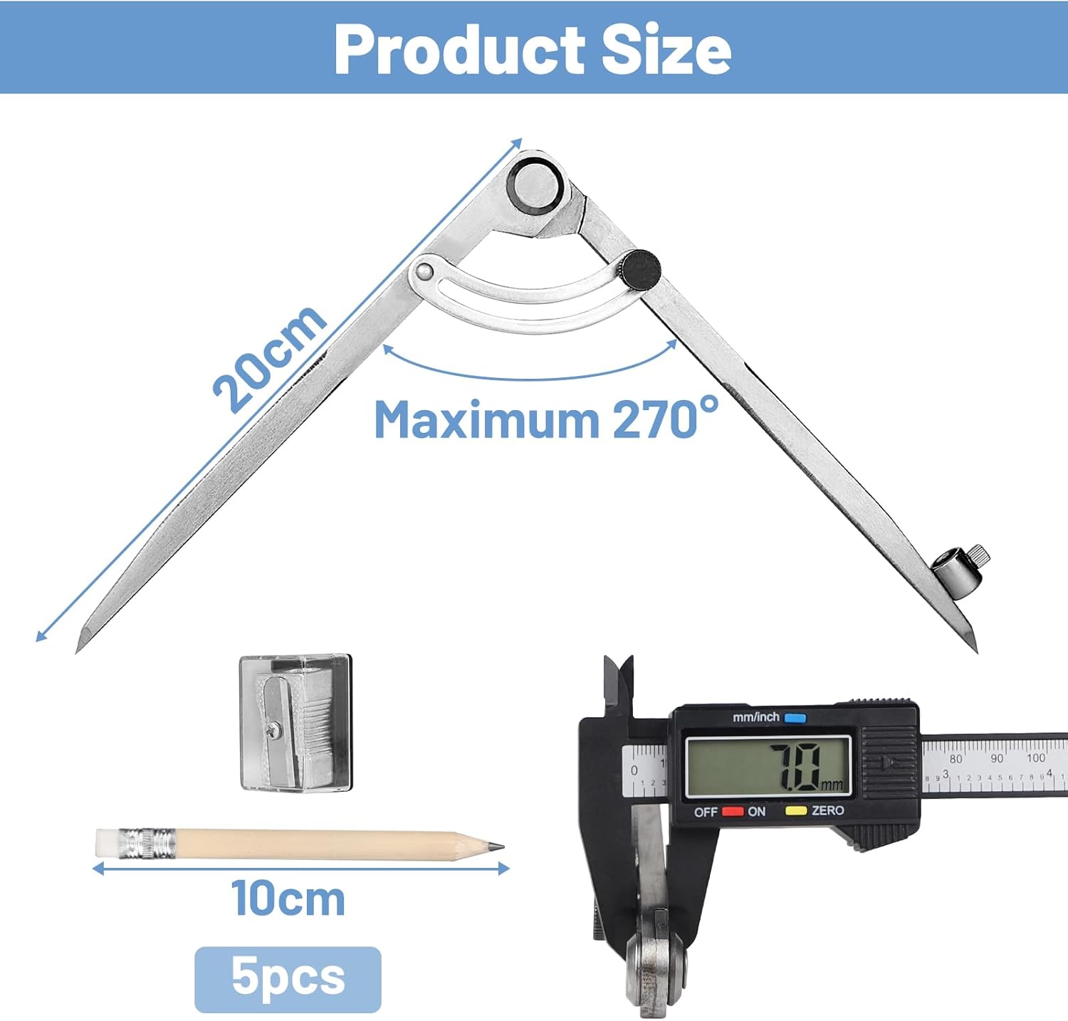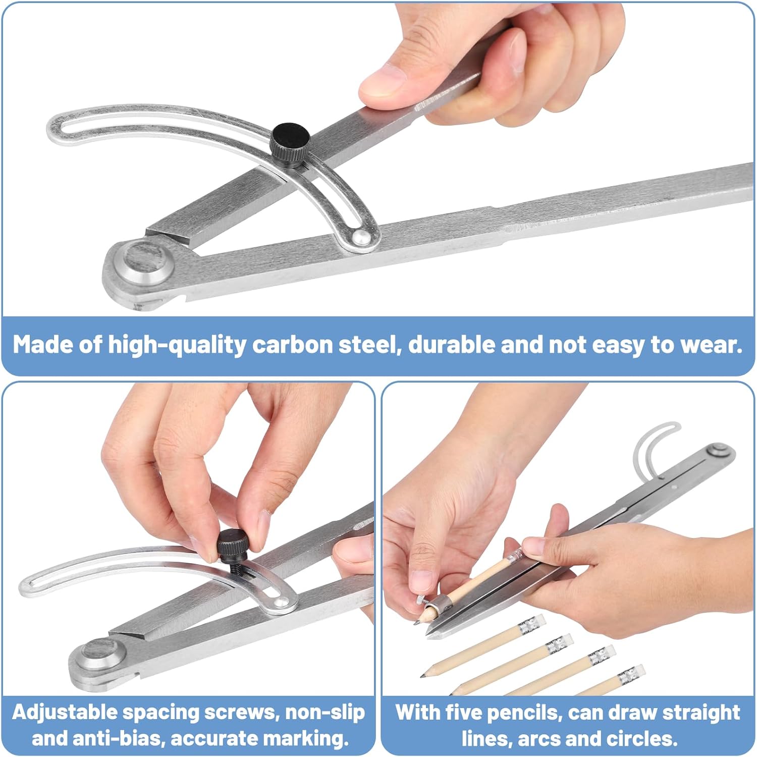 ✅ 【Disegno preciso】: questo contatore della bussola ha un diametro di 20 cm/30 cm. Disegna facilmente cerchi da 1/2" a 20" / da 1/2" a 30" di diametro. Disegno preciso, misurazione semplice di diametri, angoli e disegno di cerchi/archi. ✅ 【DESIGN DI BLOCCAGGIO】: il calibro circolare della matita adotta un design di bloccaggio che consente di regolare rapidamente le dimensioni del disegno regolando la posizione della vite di regolazione. Non si regola né scivola durante misurazioni ripetute e quando si disegnano cerchi. Ideale per disegni tecnici che richiedono precisione assoluta. ✅ 【MATERIALE DI QUALITÀ】: la bussola geometrica è realizzata in acciaio al carbonio di alta qualità, ben realizzata e resistente. Quello che vedi è quello che ottieni ✅ Calibro rotondo multifunzione: questo calibro rotondo è dotato di alette di bloccaggio e portapenne. Può essere utilizzato per la marcatura meccanica, la marcatura della pelle e il fai-da-te. Ideale per la lavorazione del legno, carpenteria, lavorazione dei metalli, lavorazione del cuoio e altri settori artigianali. ✅【CONTENUTO DELLA CONSEGNA】: calibro circolare con diametro di 20 cm/30 cm, 5 matite con gomma, un temperamatite. Puoi usarlo direttamente per disegnare modelli. Non è necessario acquistare nient'altro in aggiunta.