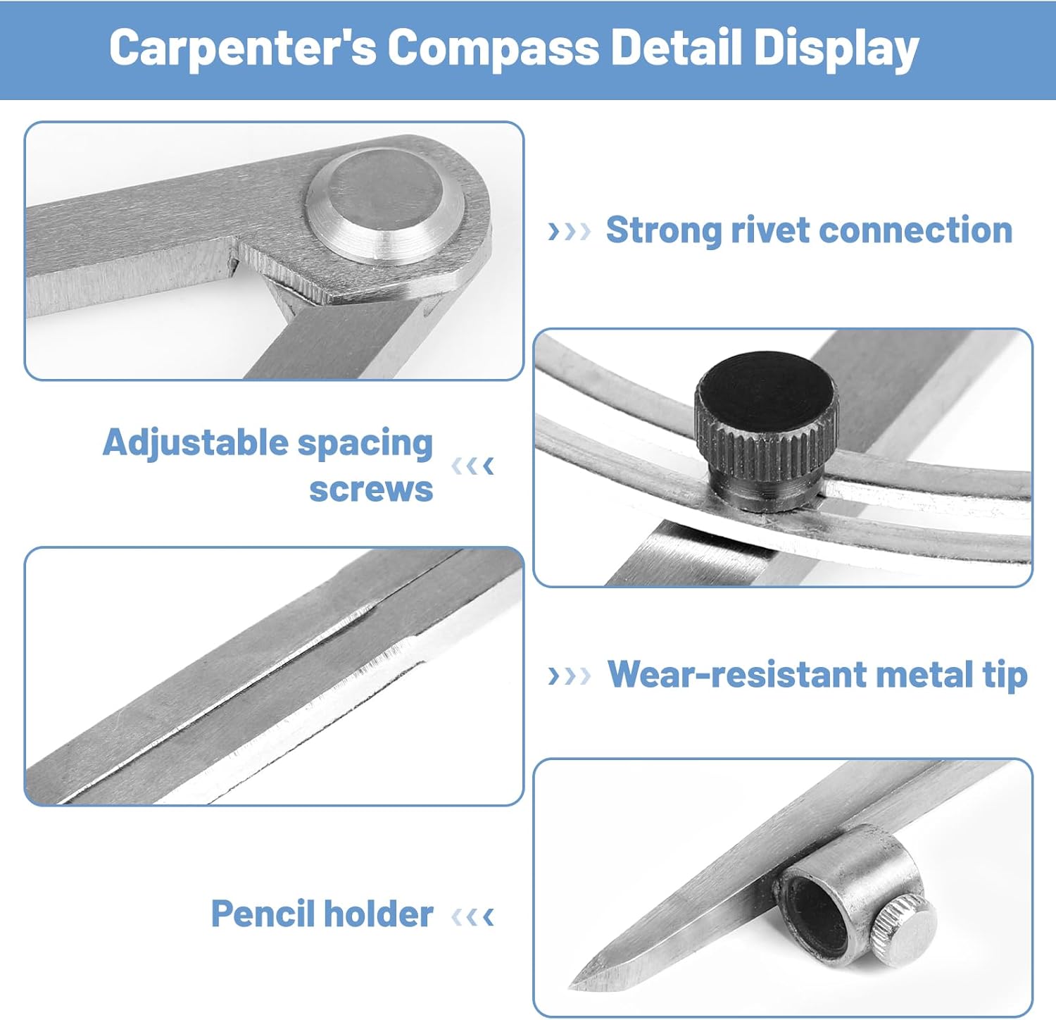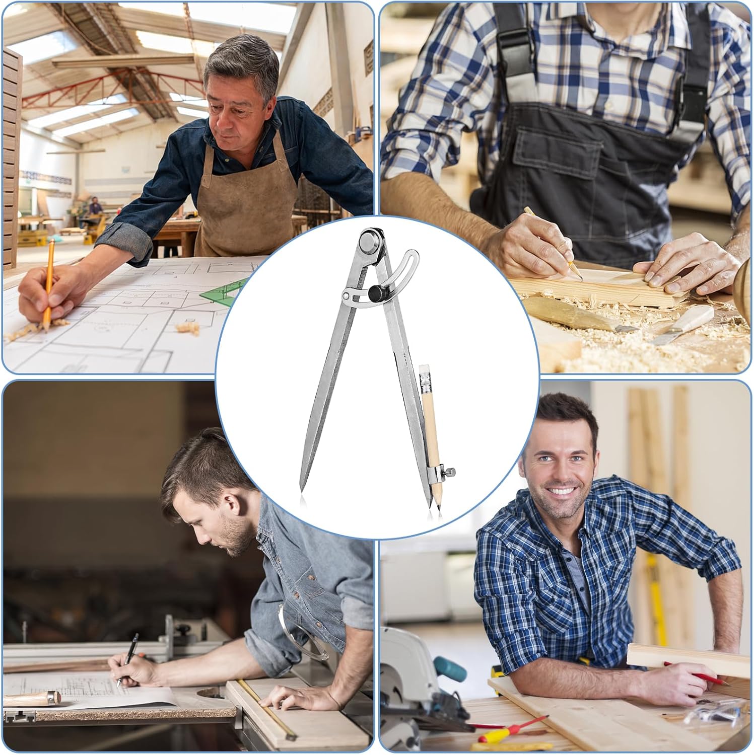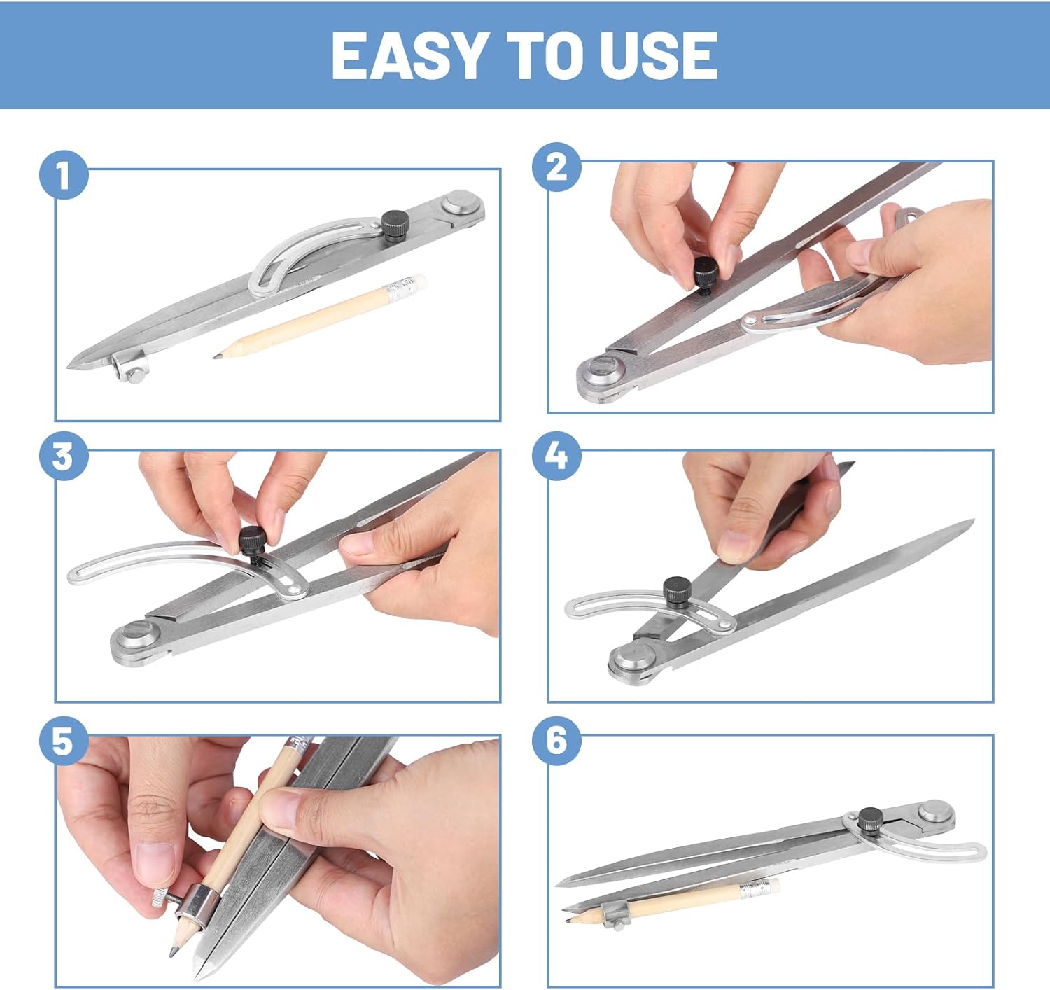 ✅ 【Disegno preciso】: questo contatore della bussola ha un diametro di 20 cm/30 cm. Disegna facilmente cerchi da 1/2" a 20" / da 1/2" a 30" di diametro. Disegno preciso, misurazione semplice di diametri, angoli e disegno di cerchi/archi. ✅ 【DESIGN DI BLOCCAGGIO】: il calibro circolare della matita adotta un design di bloccaggio che consente di regolare rapidamente le dimensioni del disegno regolando la posizione della vite di regolazione. Non si regola né scivola durante misurazioni ripetute e quando si disegnano cerchi. Ideale per disegni tecnici che richiedono precisione assoluta. ✅ 【MATERIALE DI QUALITÀ】: la bussola geometrica è realizzata in acciaio al carbonio di alta qualità, ben realizzata e resistente. Quello che vedi è quello che ottieni ✅ Calibro rotondo multifunzione: questo calibro rotondo è dotato di alette di bloccaggio e portapenne. Può essere utilizzato per la marcatura meccanica, la marcatura della pelle e il fai-da-te. Ideale per la lavorazione del legno, carpenteria, lavorazione dei metalli, lavorazione del cuoio e altri settori artigianali. ✅【CONTENUTO DELLA CONSEGNA】: calibro circolare con diametro di 20 cm/30 cm, 5 matite con gomma, un temperamatite. Puoi usarlo direttamente per disegnare modelli. Non è necessario acquistare nient'altro in aggiunta.