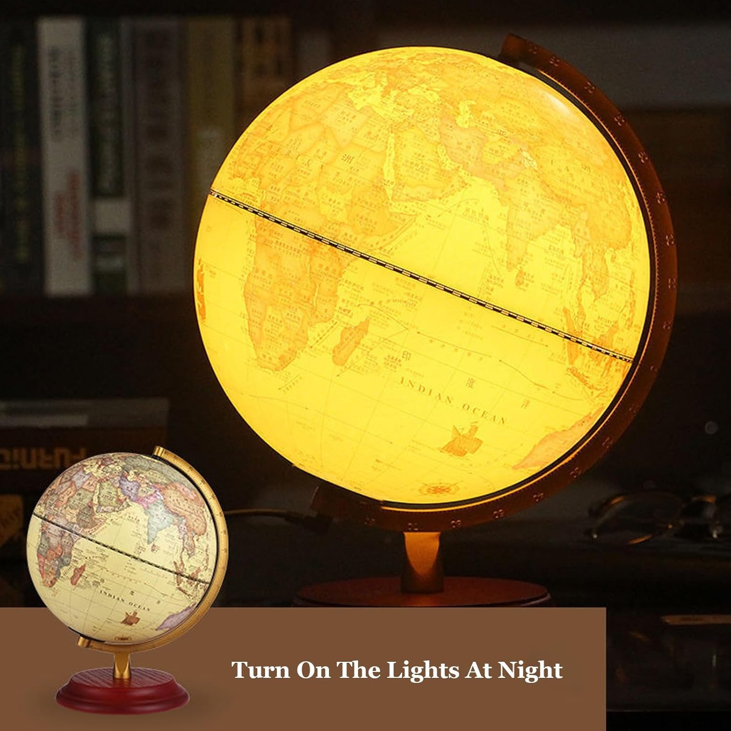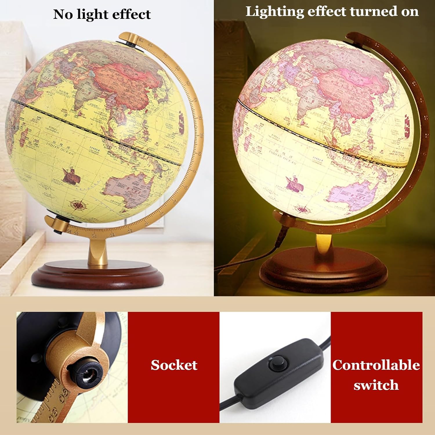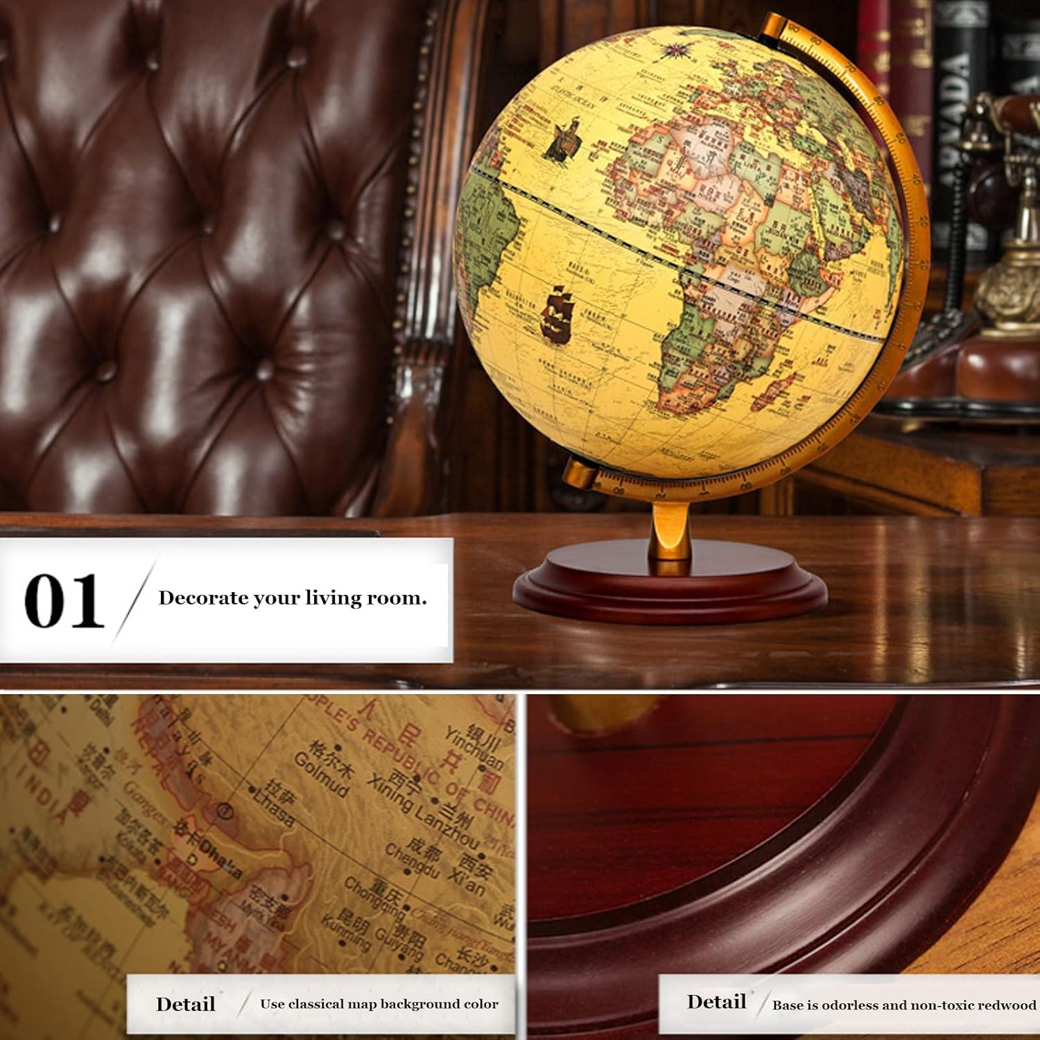 Immergiti nella geografia con questo mappamondo con etichette in inglese, che offre uno standard internazionale e mostra cinque volte più città, per una visualizzazione completa e coinvolgente. - Regala conoscenza e decorazioni con questo mappamondo da tavolo, perfetto per sviluppare competenze linguistiche, cognitive e geografiche, che lo rendono un regalo di Natale ideale per amici o genitori. - Il mappamondo è realizzato in materiale ABS di alta qualità, con stampa Word dettagliata e un robusto supporto in legno/metallo, per garantire un'esperienza lussuosa e appagante. - Arricchisci le tue conoscenze geografiche con questo esclusivo mappamondo in stile antico, dotato di illuminazione a LED per identificare facilmente paesi, confini politici, capitali e molto altro. - Questo mappamondo di alta gamma è caratterizzato da una precisione eccezionale e da materiali di prima qualità, che lo rendono un'aggiunta straordinaria a qualsiasi arredamento per la casa o l'ufficio, oppure un regalo premuroso per gli amanti dell'arredamento.
