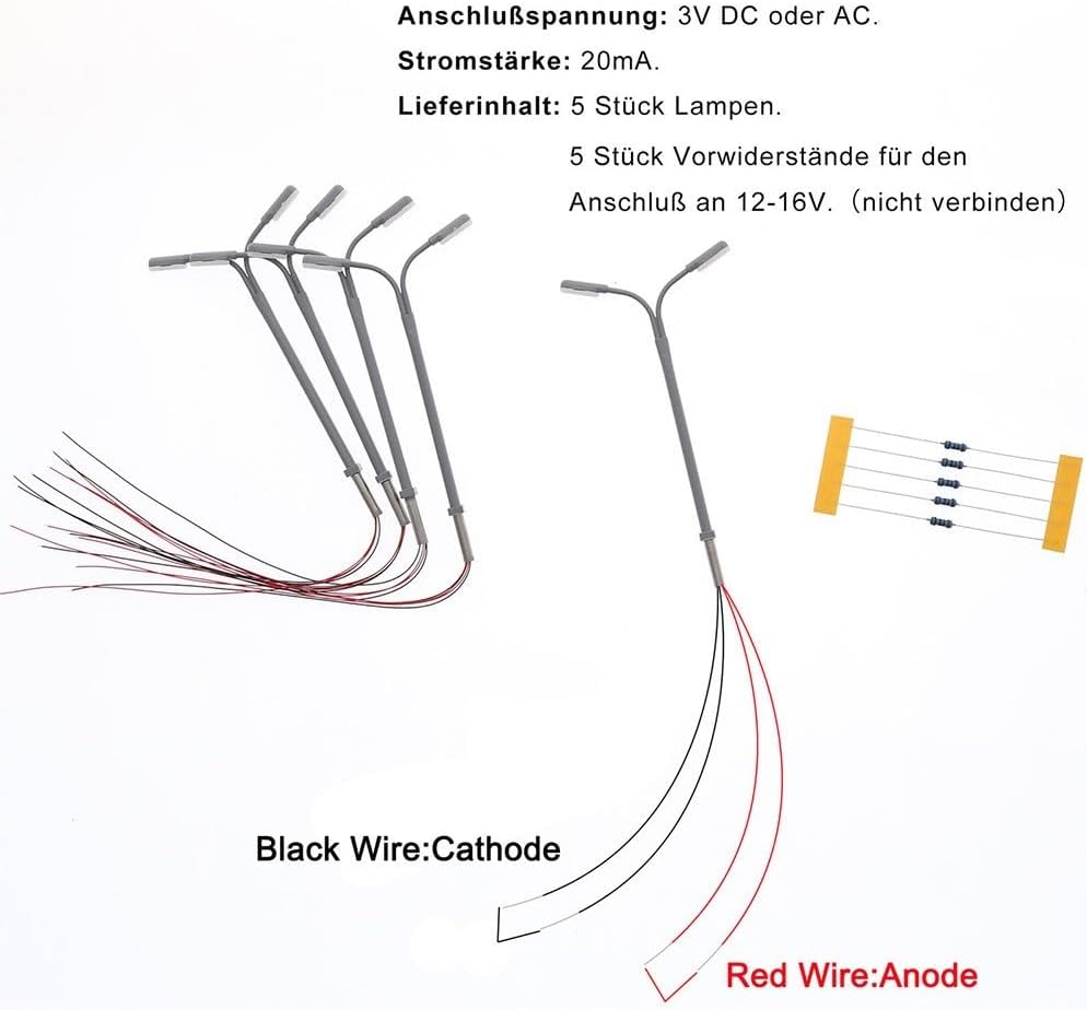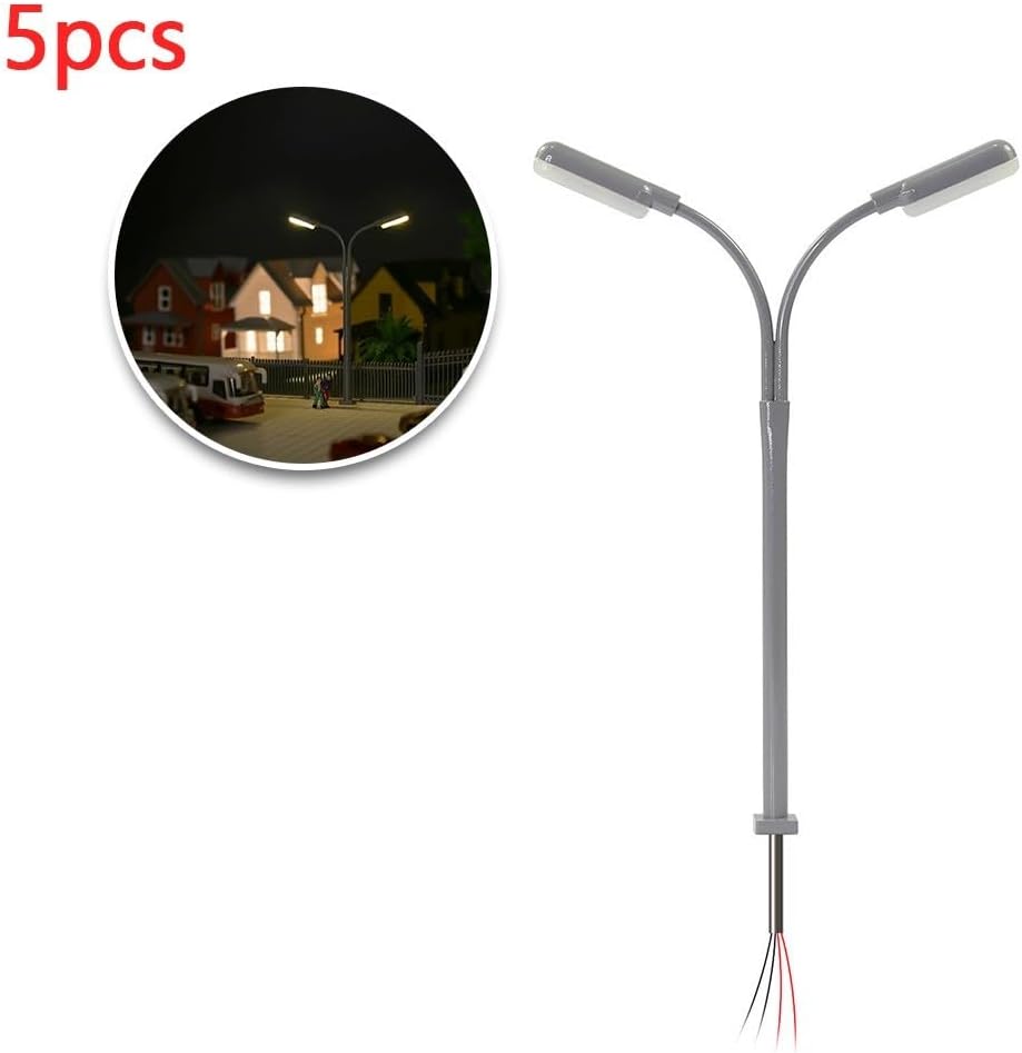 【Lampione Stradale a LED Scartamento N 1:160】Il modello di lampione stradale è composto da 5 lampioni a LED in scala N 1:160, perfetti per migliorare l'abbellimento del layout del tuo edificio. 【Requisito di tensione 3 V】 Queste lampadine a LED sono progettate specificamente per tensioni 3 V. Si consiglia di non utilizzarli direttamente con 12V o 16V per evitare possibili danni al LED. 【Corrente operativa 20 mA】 Per garantire prestazioni ottimali, si consiglia di applicare una corrente operativa corretta di 20 mA a ciascun LED. Ciò garantisce un'illuminazione stabile e uniforme. 【Include resistori in serie per il collegamento a 12-16 V】 Per coloro che utilizzano un trasformatore da 12-16 V, il nostro prodotto viene fornito con resistori in serie che possono essere facilmente collegati per garantire la compatibilità ed evitare problemi di tensione. 【Specifiche dettagliate del prodotto】 Queste lampade sono in condizioni pari al nuovo e adatte per la scala N con una scala di 1:160. Possono essere collegati a una fonte di alimentazione 3 V CC o CA. La corrente richiesta è 20mA. Sono incluse resistenze in serie per il collegamento a 12-16 V ed è necessario collegare la resistenza inclusa alla linea di alimentazione se si utilizza un trasformatore da 12-16 V. Le lampade sono realizzate in tubolare d'acciaio e dispongono di LED luminosi.