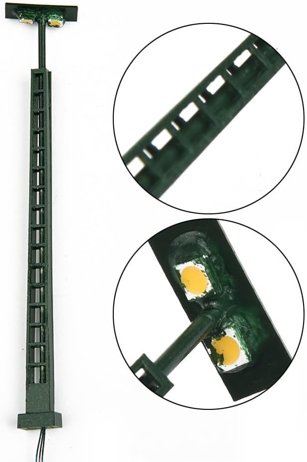 【Luci modellistiche ferroviarie】 Queste luci a traliccio sono appositamente progettate per modellismo ferroviario. Sono realizzati con LED e sono perfetti per effetti di luce realistici. 【Adatto per layout a scartamento N】 Queste luci sono progettate per layout a scartamento N, con una scala di 1:160. Sono adatti per tensioni di alimentazione di 3V ed è importante utilizzare la corretta corrente di funzionamento di 20mA per ciascun LED. 【Utilizzo sicuro】 Per evitare danni al LED, non utilizzare queste luci direttamente su 12V o 16V. Tuttavia, sono incluse resistenze in serie per il collegamento a 12-16 V in modo da poterle utilizzare con l'apposito trasformatore. 【Materiale】 Le luci a palo reticolare sono realizzate in metallo, che garantisce durata e stabilità. Hanno una lunga durata e offrono una sorgente luminosa affidabile con tecnologia LED.