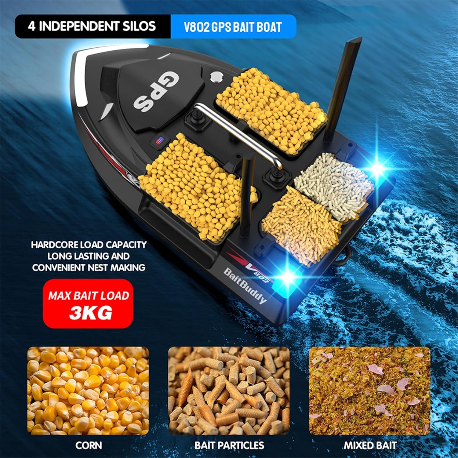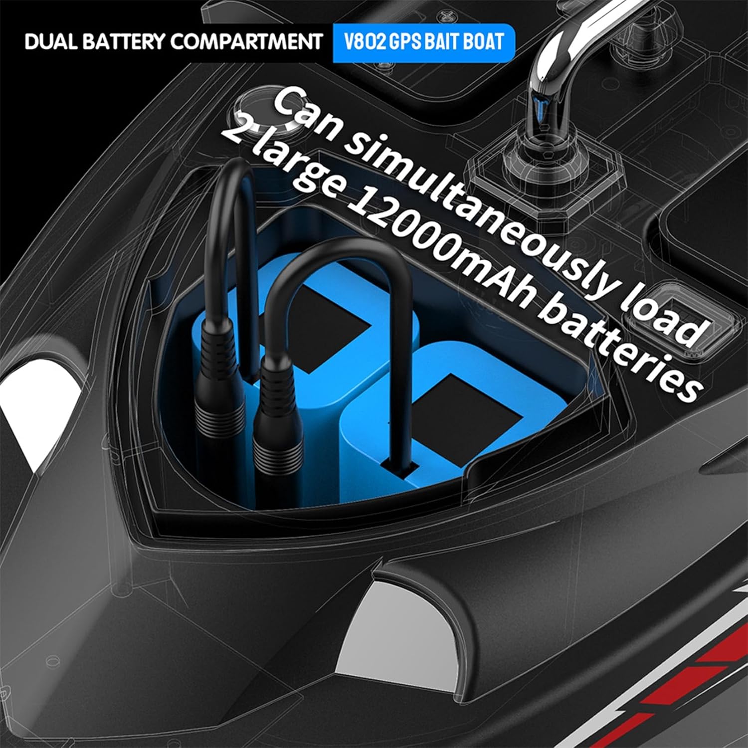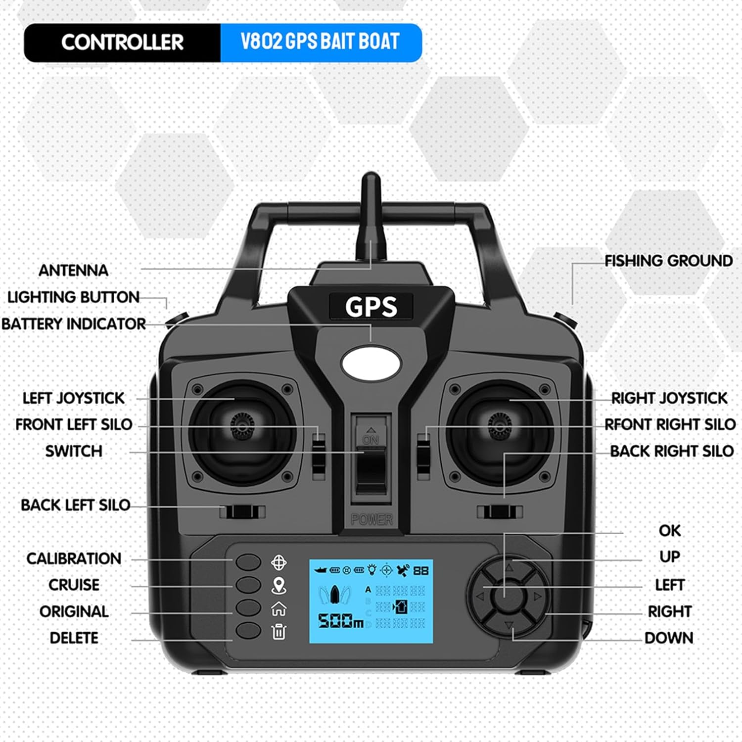Il design migliorato con due antenne garantisce una trasmissione del segnale più stabile e un'elevata resistenza alle interferenze. Ciò consente una portata estremamente ampia del telecomando fino a 500 metri (senza altri forti fattori di interferenza). Quattro contenitori di mangime sono controllati in modo indipendente per garantire un rilascio preciso dell'esca e quindi soddisfare le diverse esigenze di pesca. Supporta curve avanti, indietro, sinistra e destra, offrendo un funzionamento flessibile e adattabile alle diverse condizioni dell'acqua. Il design a doppio cavo di alimentazione garantisce un'alimentazione ininterrotta con due batterie per una maggiore durata della batteria (questo modello viene fornito con una sola batteria; si prega di acquistare più batterie separatamente). Un allarme automatico di batteria scarica impedisce interruzioni del funzionamento. La mangiatoia è dotata di luci di navigazione notturna luminose per una navigazione notturna più sicura. Un indicatore di direzione posteriore indica chiaramente la direzione di marcia. Due modalità di illuminazione (luce fissa/lampeggiante) si adattano a diverse condizioni ambientali. Il mangiatoia supporta quattro zone di pesca e 160 posti di pesca e soddisfa così le diverse esigenze di pesca. La trasmissione a distanza in tempo reale consente di misurare le distanze in acqua.
