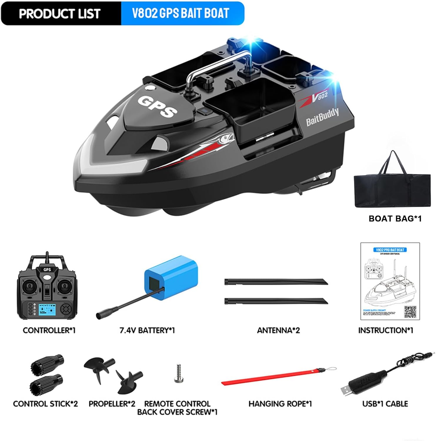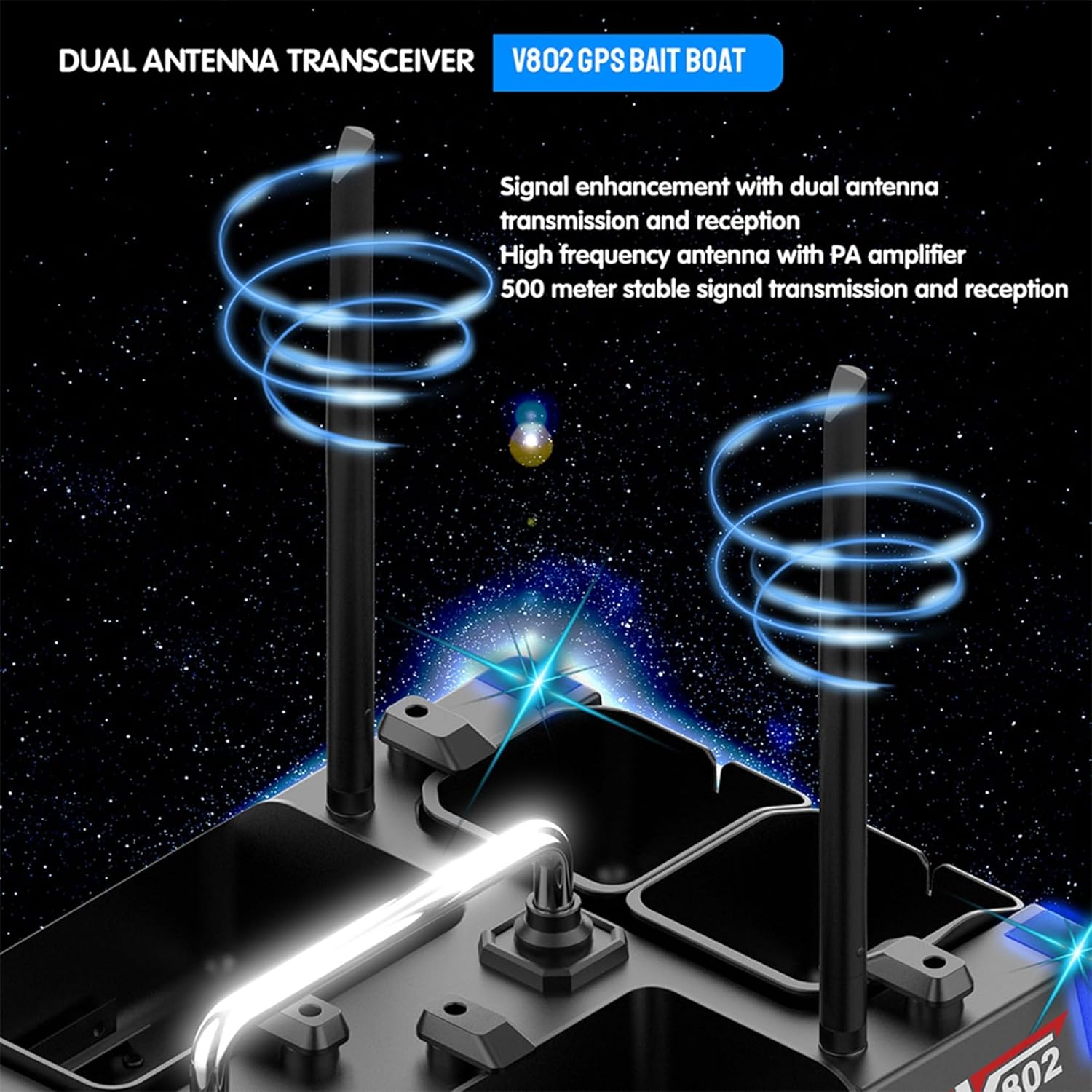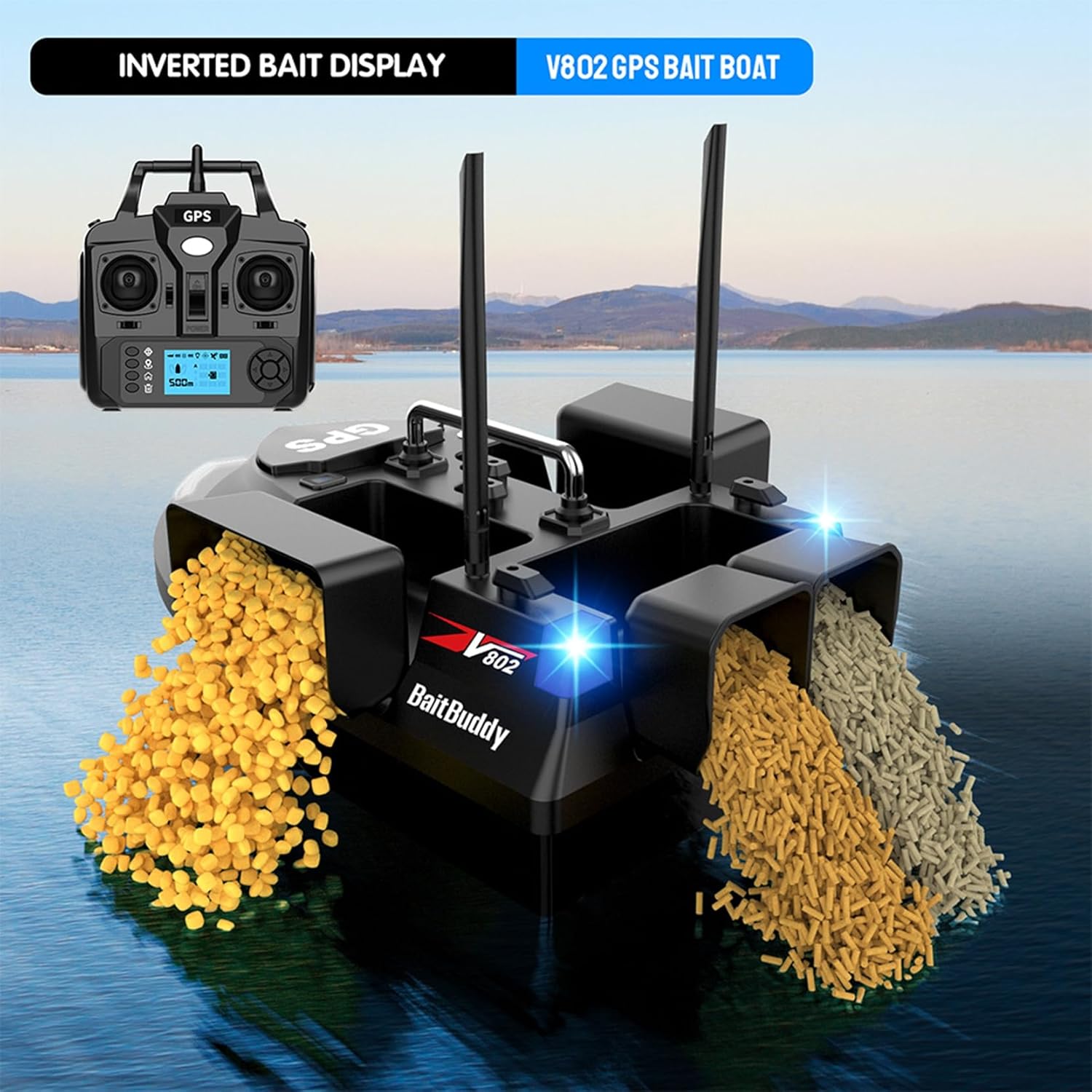 Il design migliorato con due antenne garantisce una trasmissione del segnale più stabile e un'elevata resistenza alle interferenze. Ciò consente una portata estremamente ampia del telecomando fino a 500 metri (senza altri forti fattori di interferenza). Quattro contenitori di mangime sono controllati in modo indipendente per garantire un rilascio preciso dell'esca e quindi soddisfare le diverse esigenze di pesca. Supporta curve avanti, indietro, sinistra e destra, offrendo un funzionamento flessibile e adattabile alle diverse condizioni dell'acqua. Il design a doppio cavo di alimentazione garantisce un'alimentazione ininterrotta con due batterie per una maggiore durata della batteria (questo modello viene fornito con una sola batteria; si prega di acquistare più batterie separatamente). Un allarme automatico di batteria scarica impedisce interruzioni del funzionamento. La mangiatoia è dotata di luci di navigazione notturna luminose per una navigazione notturna più sicura. Un indicatore di direzione posteriore indica chiaramente la direzione di marcia. Due modalità di illuminazione (luce fissa/lampeggiante) si adattano a diverse condizioni ambientali. Il mangiatoia supporta quattro zone di pesca e 160 posti di pesca e soddisfa così le diverse esigenze di pesca. La trasmissione a distanza in tempo reale consente di misurare le distanze in acqua.