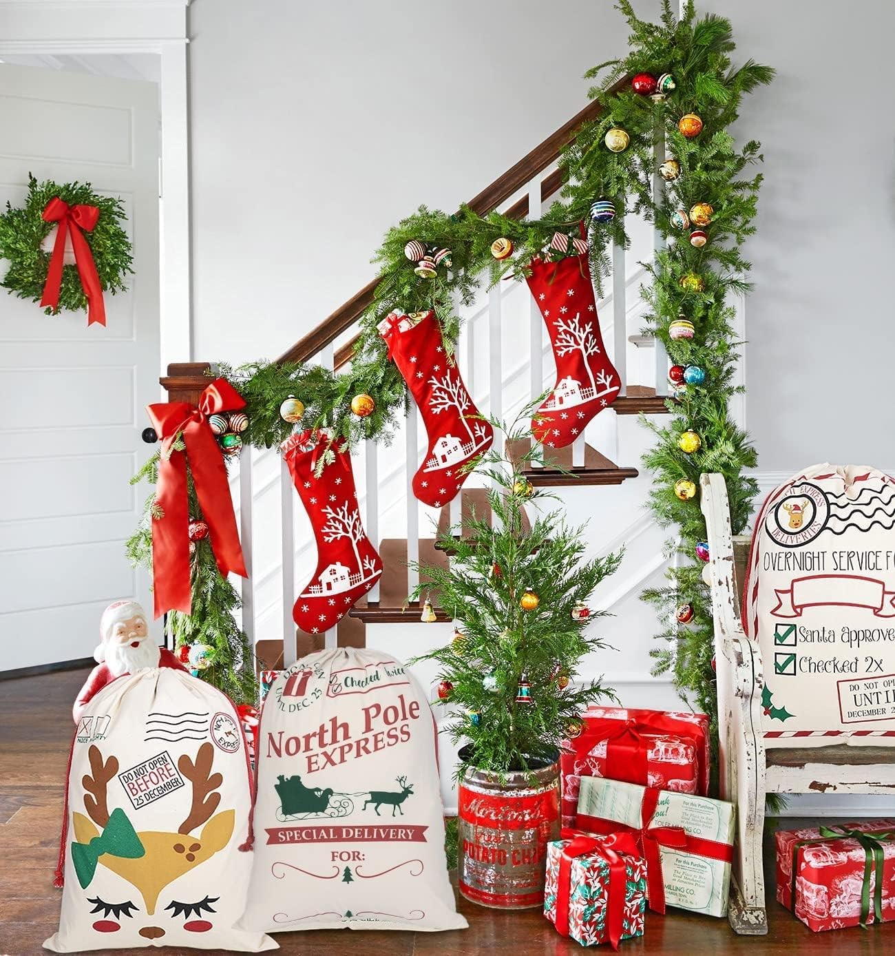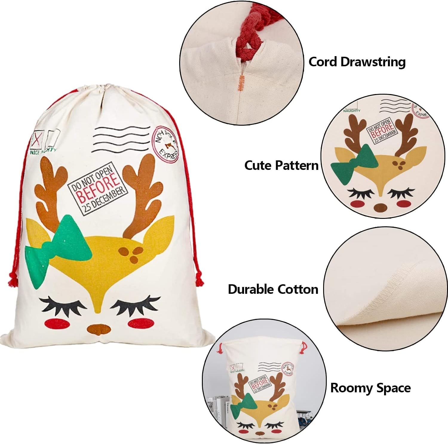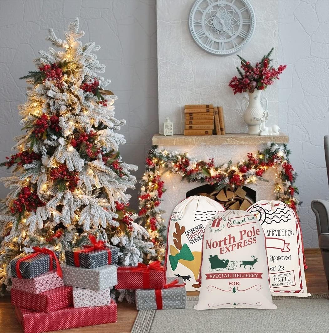 [Alta qualità] Realizzata in tela di cotone al 100%, morbida e confortevole, resistente e durevole, cuciture rinforzate sui bordi, non facile da rompere, facile da pulire, può essere riutilizzata per molti anni [Cordino] Ogni borsa è dotata di un cordoncino, facile da aprire e chiudere, non è necessaria alcuna cinghia aggiuntiva, consente di risparmiare tempo, la capacità generale è di circa 110 libbre [Motivo natalizio] 3 diverse borse natalizie in stile alce, è possibile utilizzare il nome della persona nello spazio vuoto sul fondo della borsa utilizzando pennarello, filo o tessuto per cucire, stampare o goffrare, ecc. [Dimensioni] Dimensioni extra large: 50 x 70 cm, può facilmente avvolgere regali di grandi dimensioni o contenere più piccoli oggetti, il motivo non sbiadisce facilmente, adatto al lavaggio a mano e in lavatrice [Applicabile] Adatto sotto l'albero di Natale, ideale per riporre caramelle, gioielli, anelli, orecchini, regali, mele, biscotti e altri regali più grandi all'interno