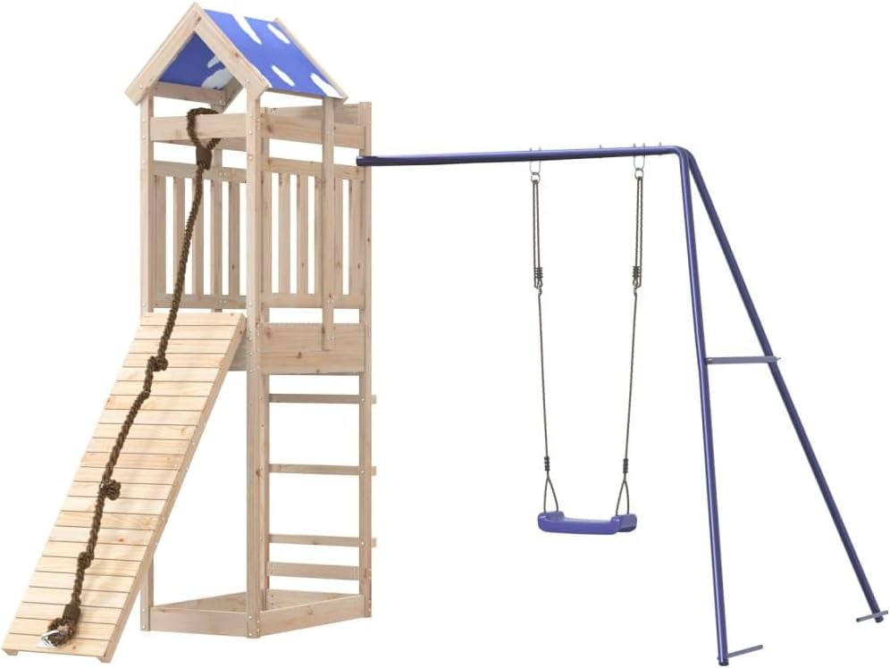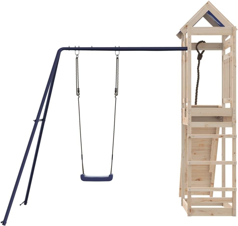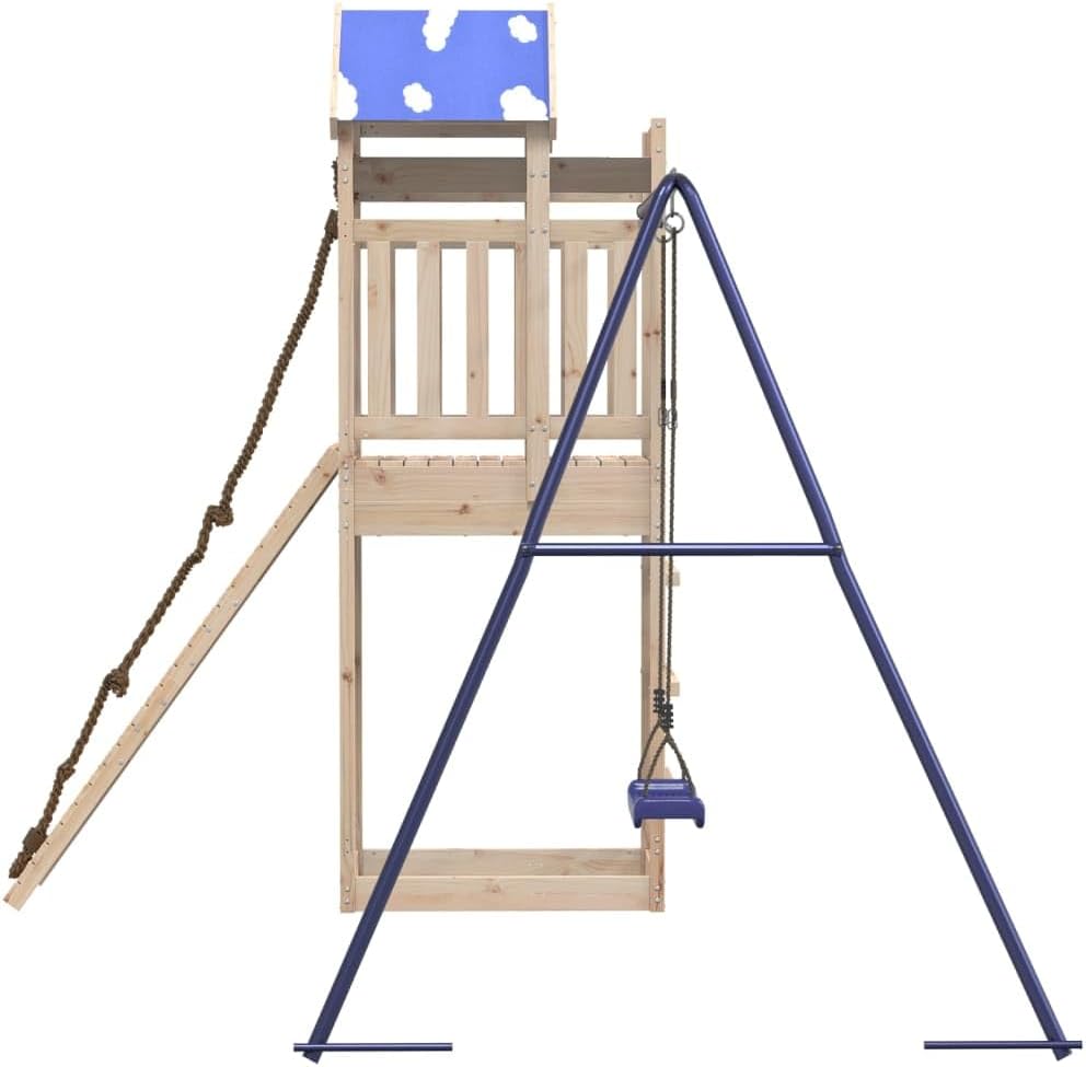 Materiale durevole: Questo parco giochi da giardino è realizzato in legno massello di pino. Il legno massello di pino è noto per la sua resistenza e durata. Le sue venature dritte e i suoi nodi caratteristici contribuiscono al suo fascino rustico. Telaio robusto in legno: La struttura in legno della casetta da giardino garantisce robustezza e stabilità. Inoltre, le gambe a forma di "A" dell'altalena per Bam bini consentono l'equilibrio.