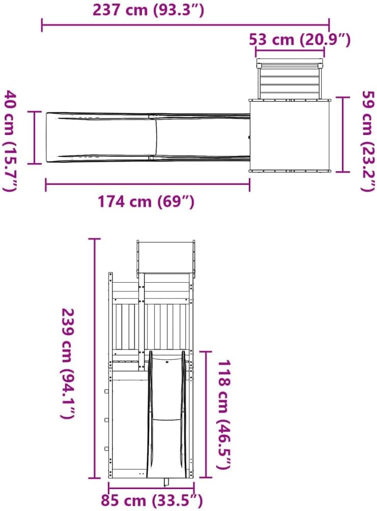 Materiale durevole: Questo parco giochi da giardino è realizzato in legno massello di pino. Il legno massello di pino è noto per la sua resistenza e durata. Le sue venature dritte e i suoi nodi caratteristici contribuiscono al suo fascino rustico. Telaio robusto in legno: La struttura in legno della casetta da giardino garantisce robustezza e stabilità. Centri multiattività: La struttura da arrampicata è dotata di una piattaforma di 118 cm di altezza e si distingue per lo scivolo a onde e la sabbiera.