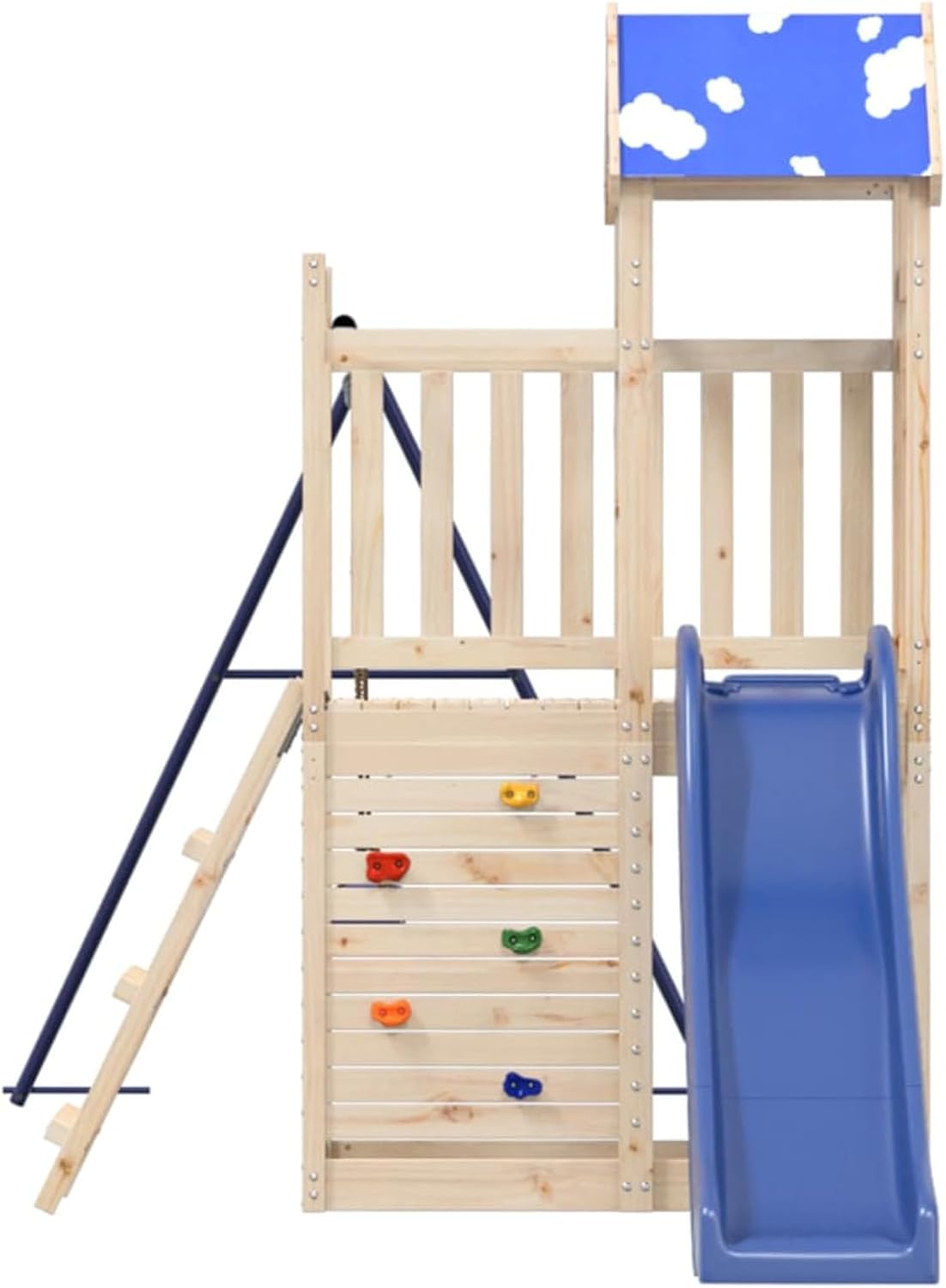 Materiale durevole: Questo parco giochi da giardino è realizzato in legno massello di pino. Il legno massello di pino è noto per la sua resistenza e durata. Le sue venature dritte e i suoi nodi caratteristici contribuiscono al suo fascino rustico. Telaio robusto in legno: La struttura in legno della casetta da giardino garantisce robustezza e stabilità. Inoltre, le gambe a forma di "A" dell'altalena per Bam bini consentono l'equilibrio.