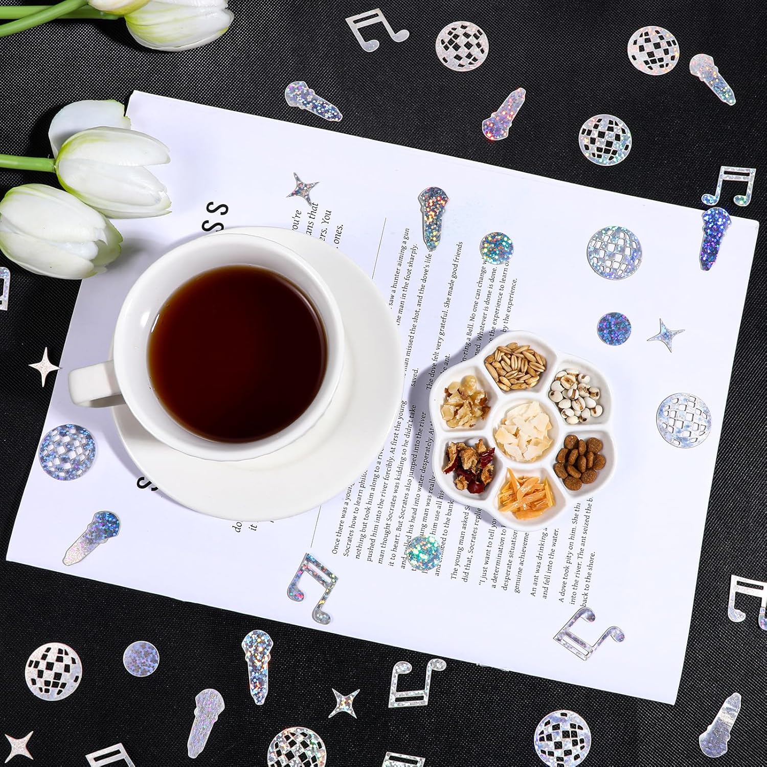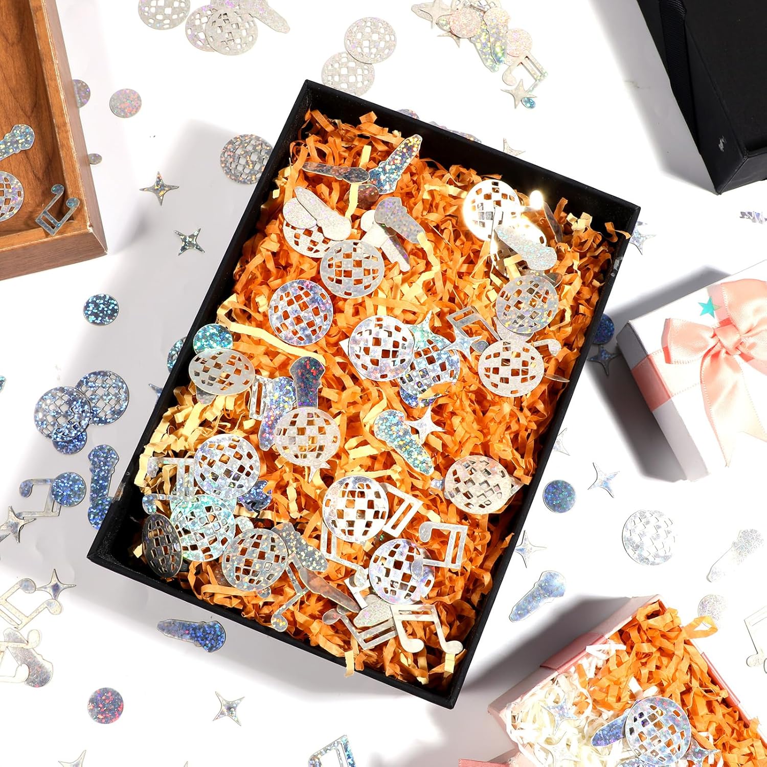 Contenuto della confezione: riceverete 200 palline decorative da discoteca, per feste in totale 5 diversi tipi di coriandoli di carta: coriandoli astrali, coriandoli a forma di disco, coriandoli e microfoni e 2 fogli di colla da 5 mm (1 foglio con 100 pezzi) Materiali di alta qualità: i coriandoli da discoteca da tavolo sono realizzati in carta laser a doppia faccia. sono robusti e durevoli, non facili da rompere, indelebili, riutilizzabili e brillano alla luce della lampada. I coriandoli da tavolo da discoteca non sono commestibili e servono solo come decorazione per feste Facile da usare: distribuire uniformemente i coriandoli da discoteca sul tavolo o in qualsiasi luogo. Puoi trasformare istantaneamente qualsiasi stanza in un ambiente festoso e vivace. L'applicazione senza sforzo richiede uno sforzo minimo, ma crea un effetto sorprendente e accattivante Decorazione unica: i coriandoli a sfera da discoteca aggiungono un tocco di glamour e brillantezza a qualsiasi tavola. La sua superficie riflettente fornisce un effetto iridescente che cattura immediatamente l'attenzione. Danno una sensazione estetica, valorizzano perfettamente ogni elemento artistico e rendono indimenticabili foto di festa Ampiamente usato: la decorazione per feste in discoteca è ideale per diverse occasioni come feste, matrimoni, compleanni, celebrazioni e vari eventi a tema. Si può anche attaccare alla parete, su palloncini, buste, biglietti d'invito, ecc. o come riempitivo in scatole, bottiglie, sacchetti regalo o piñatas