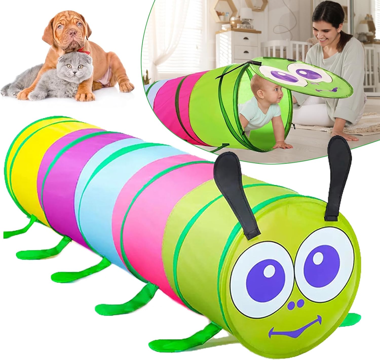[Alta qualità] Realizzato in poliestere di alta qualità, morbido e confortevole, non facile da strappare e rompere, in linea con le linee guida sulla sicurezza dei giocattoli; All'estremità del filo viene aggiunto un cappuccio di gomma e il primo anello del tubo di gomma è sigillato per evitare che il filo penetri nel tessuto, sicuro per i bambini [Avventura nel tunnel] Può strisciare, inseguire, nascondersi e cercare nel tunnel di gioco color arcobaleno, non solo esercitare l'abilità fisica di gattonare del bambino, ma anche allenare la capacità di giudicare la direzione; Possono essere posizionati ostacoli sicuri come cuscini e giocattoli di peluche nella tenda, per creare il gioco della "perforazione del foro dell'ostacolo". [Facile da usare] Con un design pop-up, puoi ottenere una bellissima tenda a tunnel quando apri la borsa, senza bisogno di attrezzi; Viene fornito con una borsa leggera con cerniera per riporlo e trasferirlo facilmente (Nota: lasciare spazio quando si apre il tunnel della giungla per evitare di colpire il bambino quando spunta fuori) [Dimensioni] Lunghezza: 180 cm, diametro: 46 cm, il tunnel può essere piegato in molte forme interessanti per promuovere il gioco creativo o collegare la casetta all'aperto ad altri cubi da gioco o tende da gioco, scivoli per bambini, ecc.; Facile da pulire, può essere facilmente pulito con un panno umido e sapone neutro [Applicabile] Goditi il divertimento dei tunnel per bambini interni ed esterni! È il miglior regalo per ragazzi e ragazze di 3 anni o più, perfetto per l'asilo nido, la scuola materna, l'asilo o per giocare in attività indoor e outdoor come cortile, parco o parco giochi ecc. Adatto anche per animali domestici, gatti, cani, ecc.