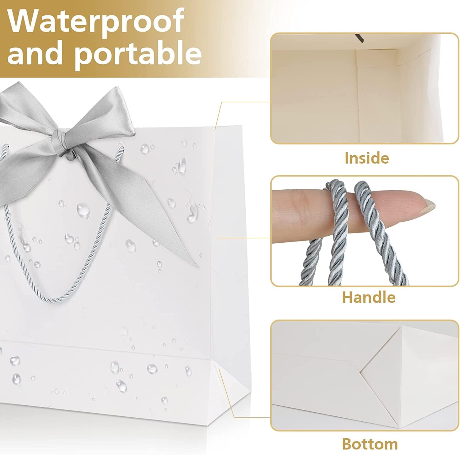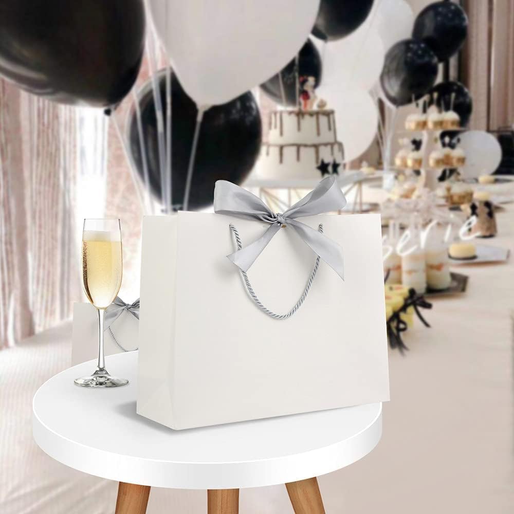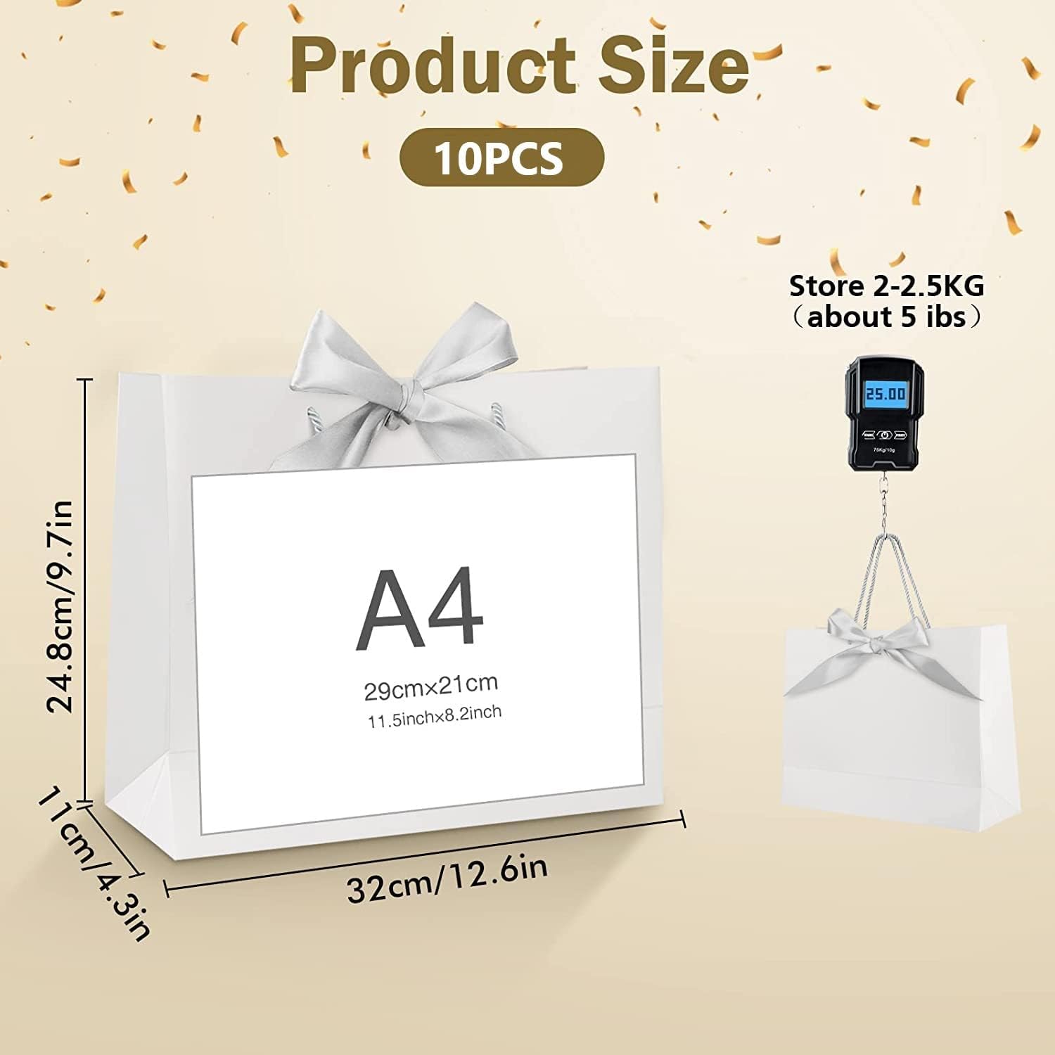 [Alta qualità] Realizzato in carta kraft di alta qualità, ecologico e riciclabile, non tossico e inodore, durevole e riutilizzabile, bordo rinforzato, non facile da rompere e deformare [Nastro a nastro] Ogni borsa viene fornita con un nastro argentato abbinato a un manico in nylon argentato, bello e unico, lussuoso e solenne, che aggiunge un'atmosfera elegante [Facile da usare] Fondo rinforzato, tiene i regali con cura; Il manico in corda argentata è robusto e può sostenere facilmente almeno 2,5 kg di peso. La superficie vuota può essere modellata fai-da-te. [Dimensioni] Ogni sacchetto per feste misura circa 32 x 25 x 11 cm, inclusi 10 sacchetti regalo in totale, può essere utilizzato per contenere piccoli regali delicati ed è la scelta migliore per confezionare regali. [Applicabile] Adatto a molte occasioni, come: matrimonio, festa di compleanno, San Valentino, Natale, Capodanno, baby shower, laurea, ecc., può essere utilizzato come sacchetto per bomboniere, sacchetto per la spesa, sacchetto per la vendita al dettaglio, sacchetto per la merce. ecc.