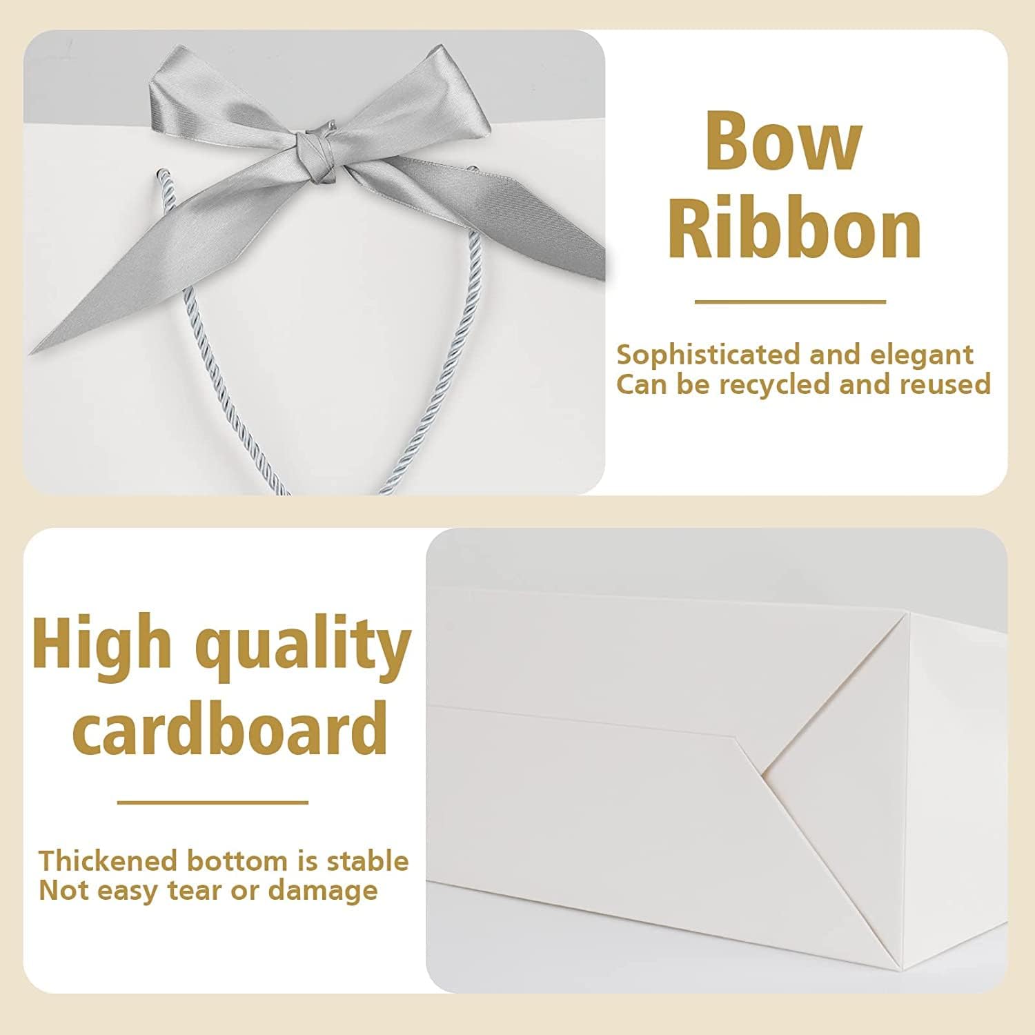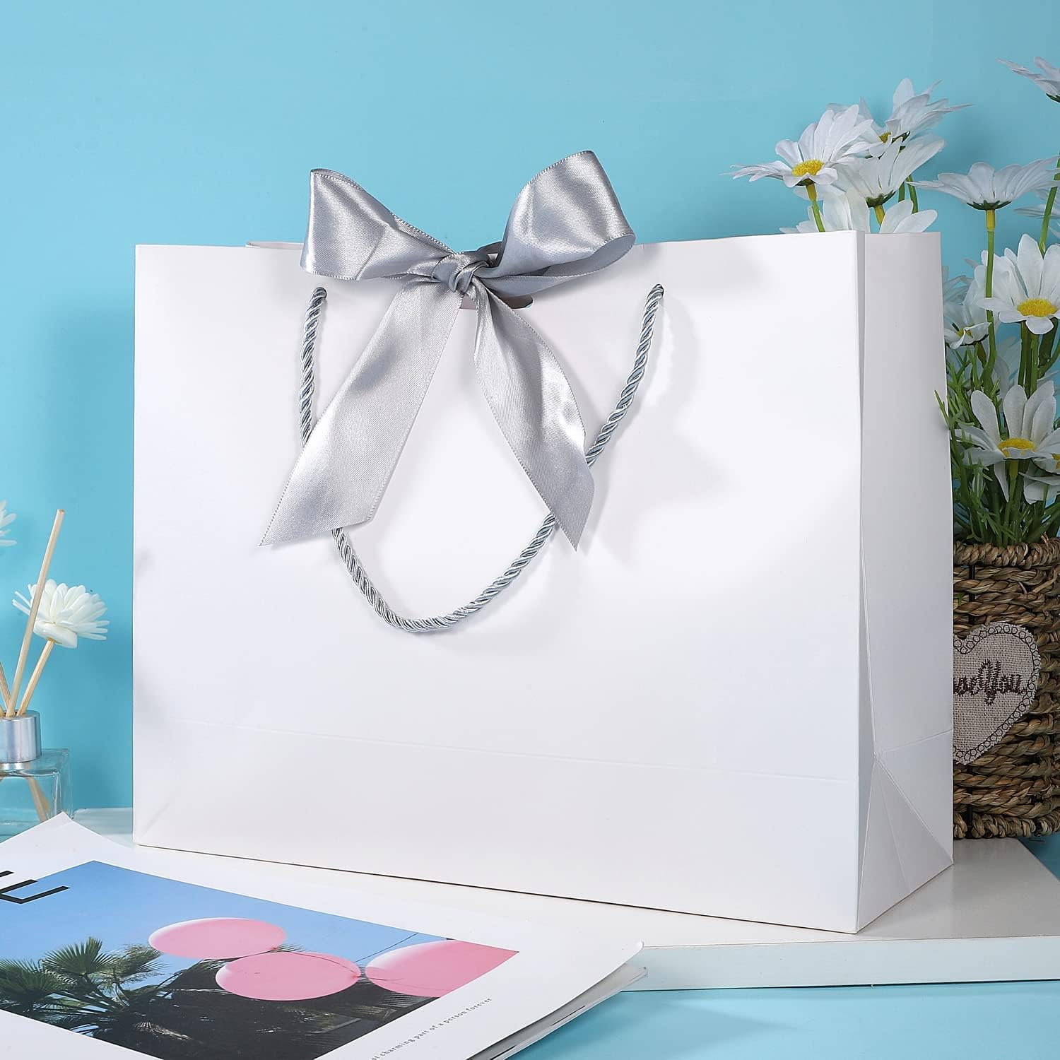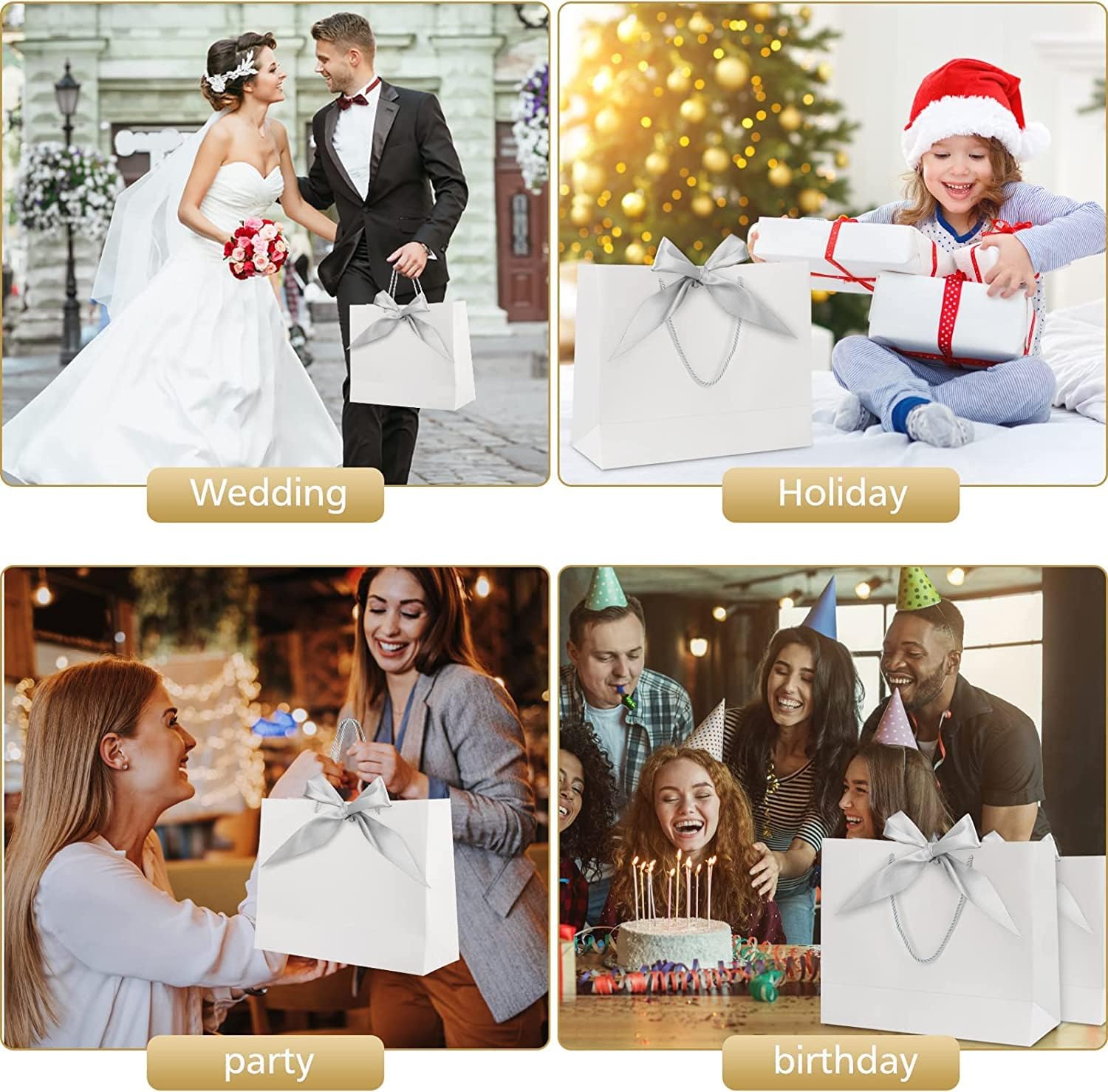 [Alta qualità] Realizzato in carta kraft di alta qualità, ecologico e riciclabile, non tossico e inodore, durevole e riutilizzabile, bordo rinforzato, non facile da rompere e deformare [Nastro a nastro] Ogni borsa viene fornita con un nastro argentato abbinato a un manico in nylon argentato, bello e unico, lussuoso e solenne, che aggiunge un'atmosfera elegante [Facile da usare] Fondo rinforzato, tiene i regali con cura; Il manico in corda argentata è robusto e può sostenere facilmente almeno 2,5 kg di peso. La superficie vuota può essere modellata fai-da-te. [Dimensioni] Ogni sacchetto per feste misura circa 32 x 25 x 11 cm, inclusi 10 sacchetti regalo in totale, può essere utilizzato per contenere piccoli regali delicati ed è la scelta migliore per confezionare regali. [Applicabile] Adatto a molte occasioni, come: matrimonio, festa di compleanno, San Valentino, Natale, Capodanno, baby shower, laurea, ecc., può essere utilizzato come sacchetto per bomboniere, sacchetto per la spesa, sacchetto per la vendita al dettaglio, sacchetto per la merce. ecc.