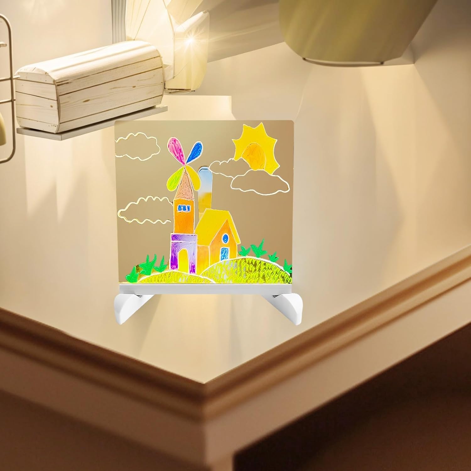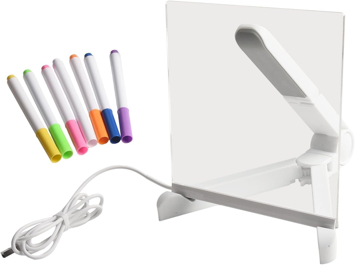 Opzioni di colore vivace: la lavagna colorata in acrilico a LED presenta una gamma di colori vivaci, perfetta per creare messaggi e disegni accattivanti che si distinguono in qualsiasi ambiente. Supporto regolabile: questa tavola include un supporto regolabile, che consente di posizionarla all'angolazione preferita per una visibilità ottimale, sia posizionata su una scrivania che appesa a una parete. Facile da pulire: la cancellazione a secco rende semplice aggiornare i tuoi messaggi o opere d'arte senza problemi, un look fresco ogni volta. Set completo: questo prodotto viene fornito con sette penne colorate, fornendo tutto il necessario per liberare la tua creatività ed esprimerti subito.