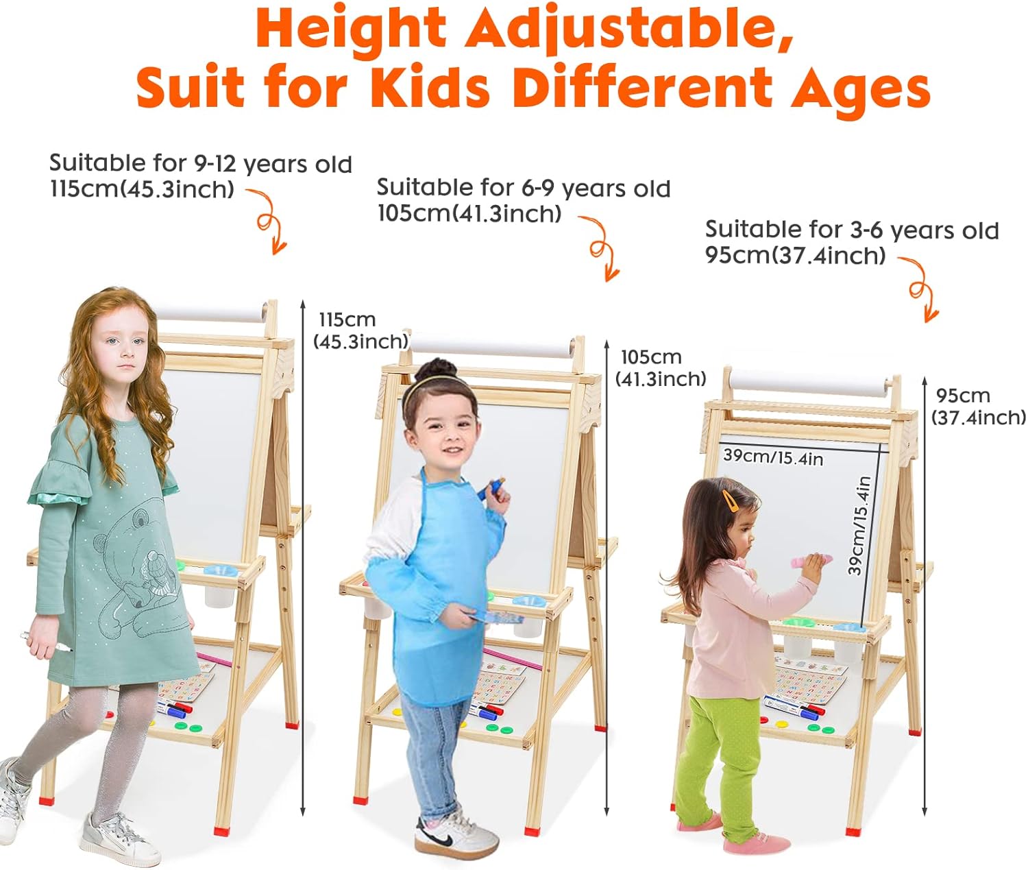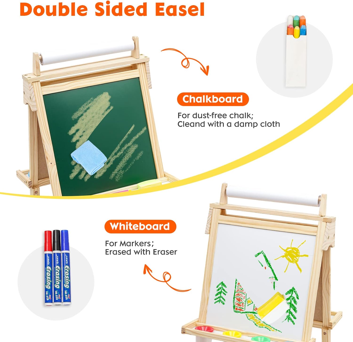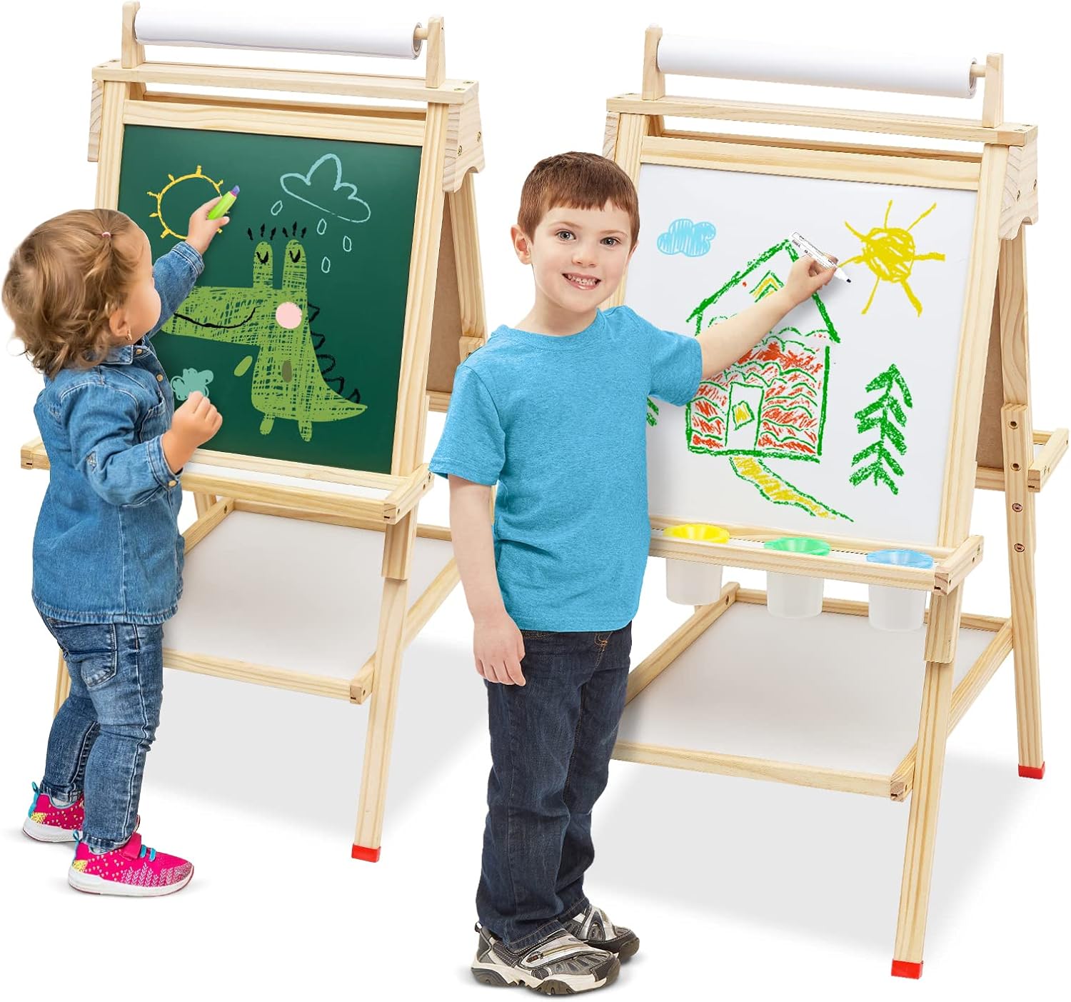 🎨【Cavalletto per bambini 3 in 1】: Questa lavagna per bambini in legno con rotolo di carta lavagna e lavagna a doppia faccia. Per scrivere, colorare e giocare, può stimolare l'immaginazione e la creatività dei bambini. 🎨【Lavagna con cavalletto regolabile in altezza】: Il cavalletto per bambini è regolabile da 56 cm a 110 cm, adatto a bambini di età compresa tra 2 e 9 anni e accompagna ogni fase della crescita dei bambini. Blocco per schizzi: 45 * 45 cm; Superficie scrivibile: 39 * 39 cm. 🎨【Lavagna in legno per bambini】: Realizzata in robusto legno di pino della Nuova Zelanda per una lunga durata. Facile da montare ed elevata stabilità. Nota bene: rimuovere la pellicola protettiva prima dell'uso. La superficie della tavola deve essere pulita con un panno umido, altrimenti non può essere pulita. 🎨【Ampia dotazione di accessori】: Include rotolo di carta, lavagna bifacciale e lavagna bianca, vassoio di stoccaggio, lettere, numeri e altri accessori. Rafforza la comprensione dei numeri e delle lettere da parte dei bambini e migliora le loro abilità pratiche e la coordinazione mano-cervello. 🎨【Regalo ideale】: Questo cavalletto per bambini offre ore di divertimento creativo ed è un perfetto regalo di Natale o un giocattolo educativo.