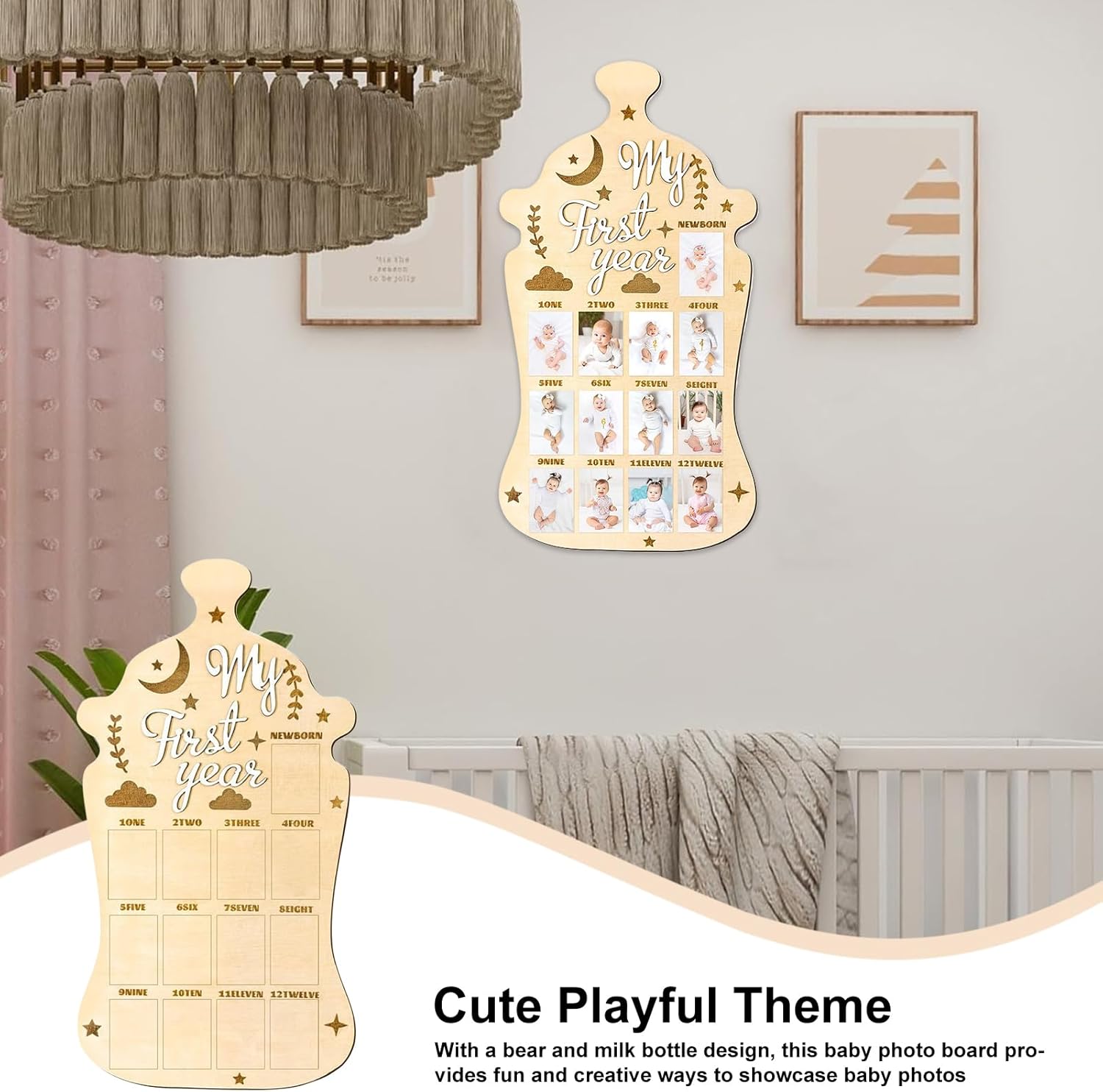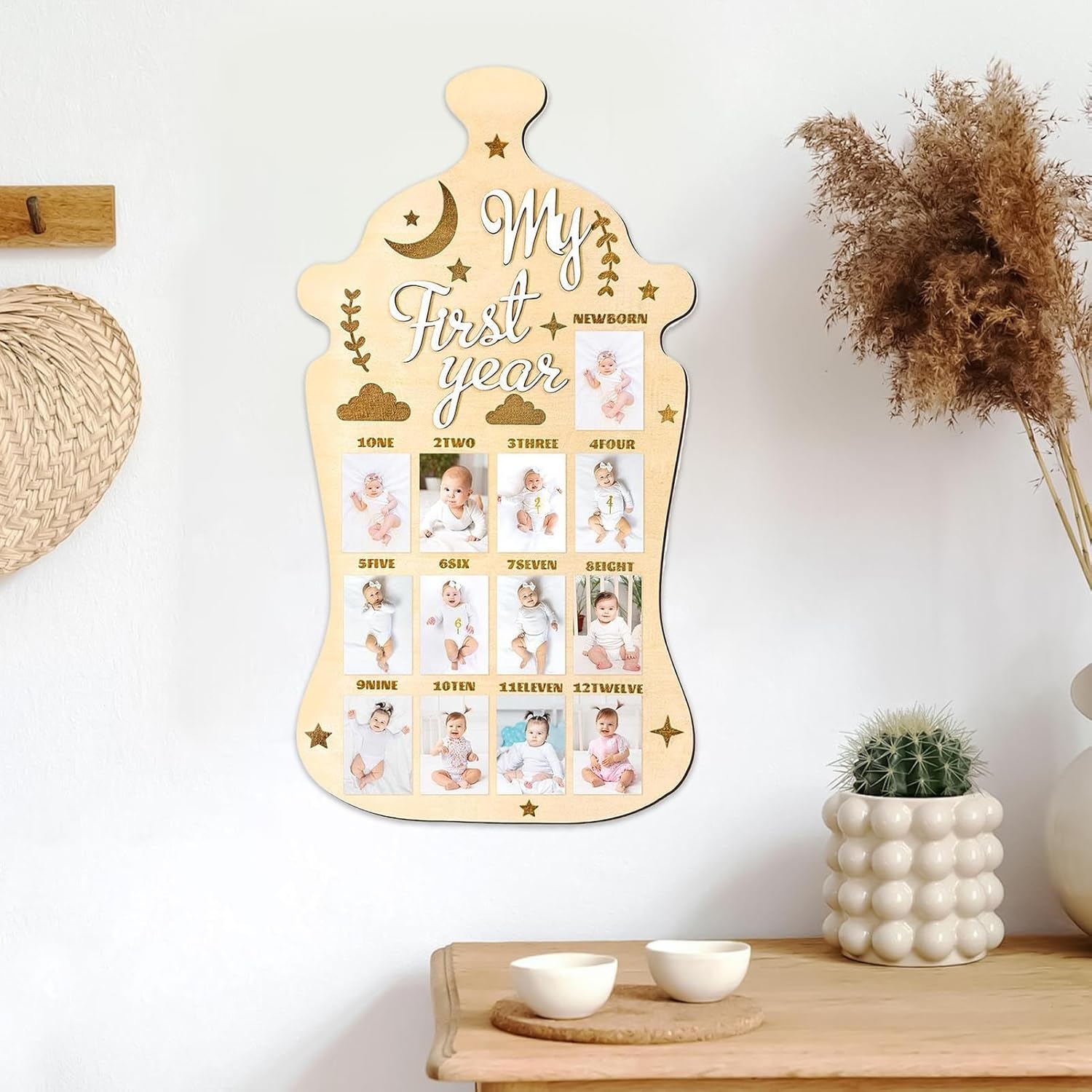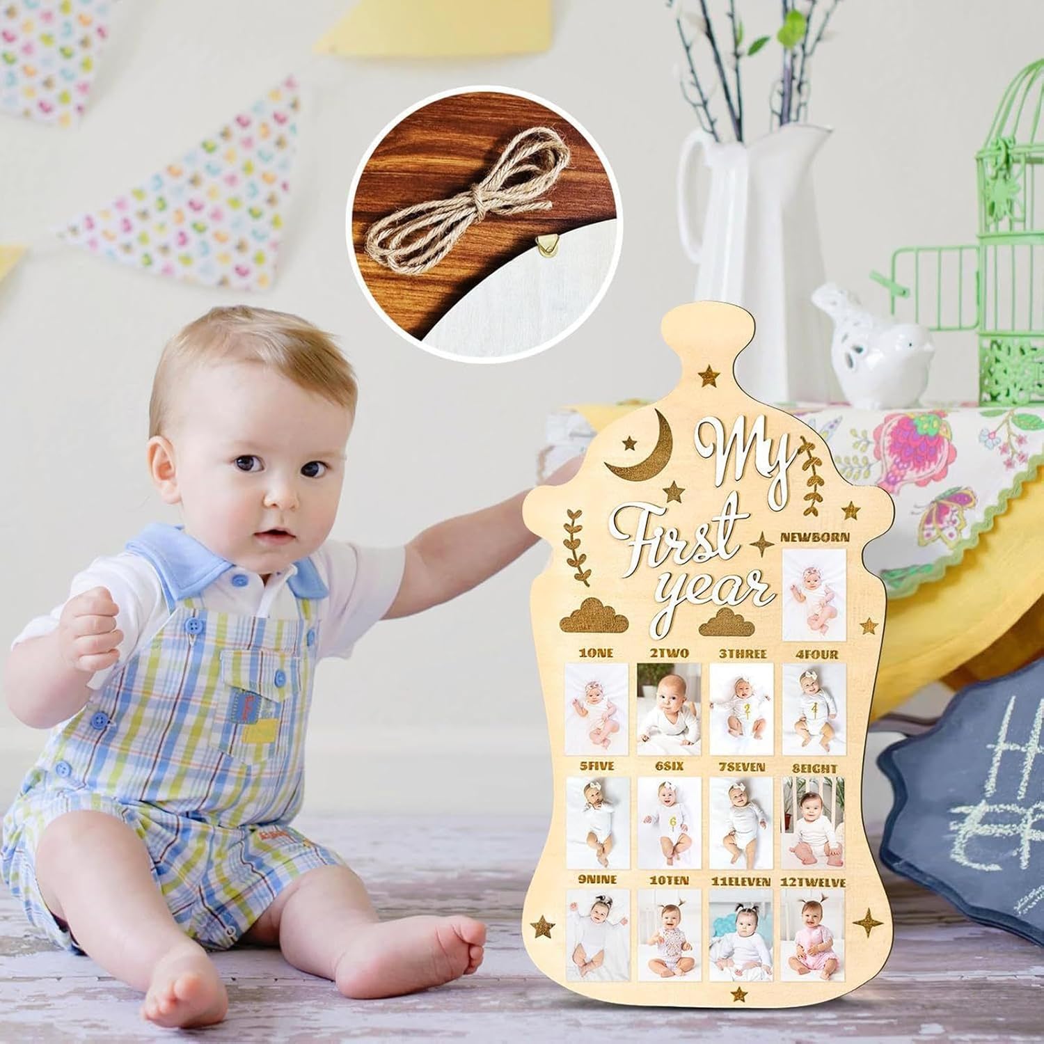 Custode della memoria mensile: evidenzia il viaggio del tuo bambino con la visualizzazione fotografica di 12 mesi progettata per tenere traccia delle fasi di crescita e celebrare ogni traguardo mostrando i momenti preziosi in modo organizzato e significativo. gancio Struttura affidabile: realizzata in robusto legno di pino, questa lavagna fotografica offre una soluzione sicura e durevole che mette in risalto materiali di alta qualità per esposizioni memorabili. Regalo memorabile: festeggia compleanni e vacanze con questa lavagna fotografica per bambini, un regalo eccellente per la famiglia e gli amici per custodire ricordi di occasioni speciali
