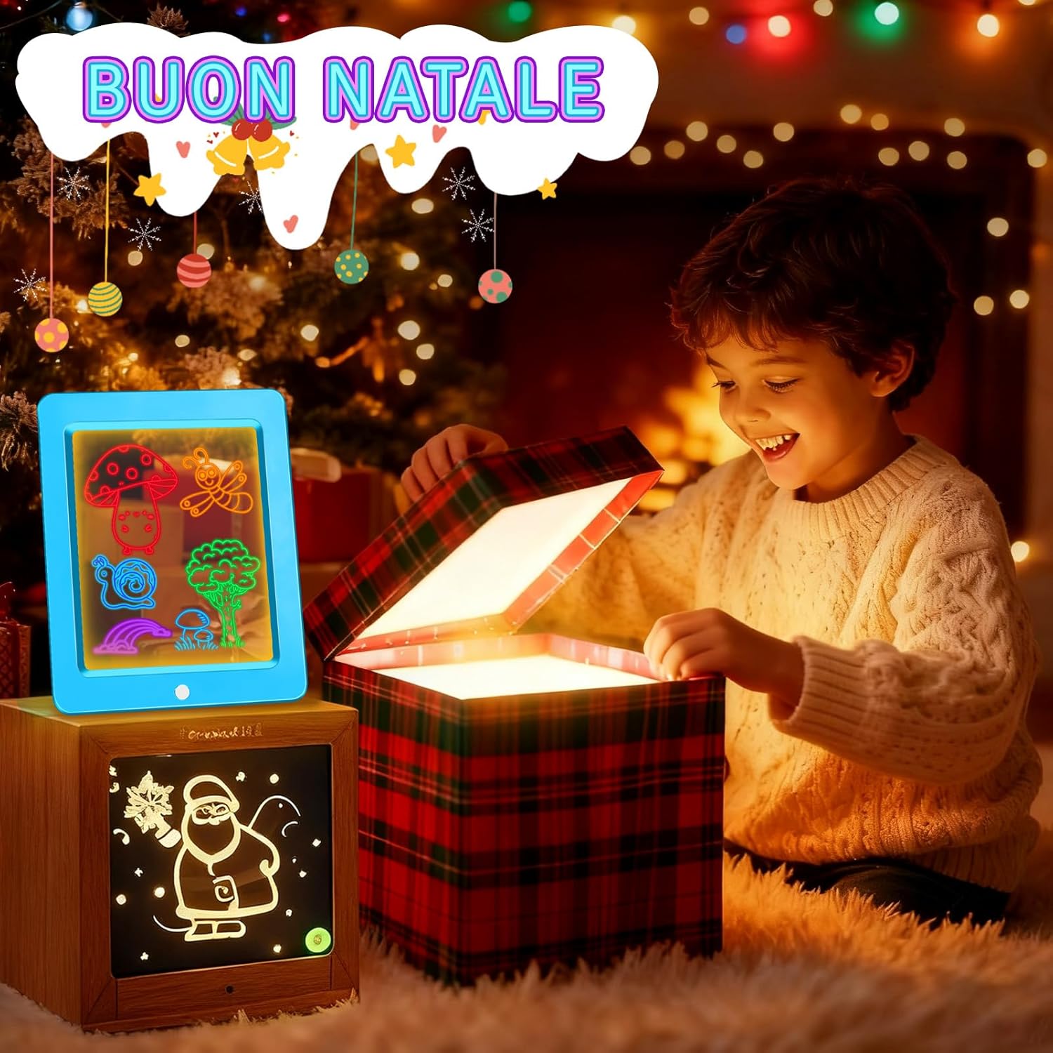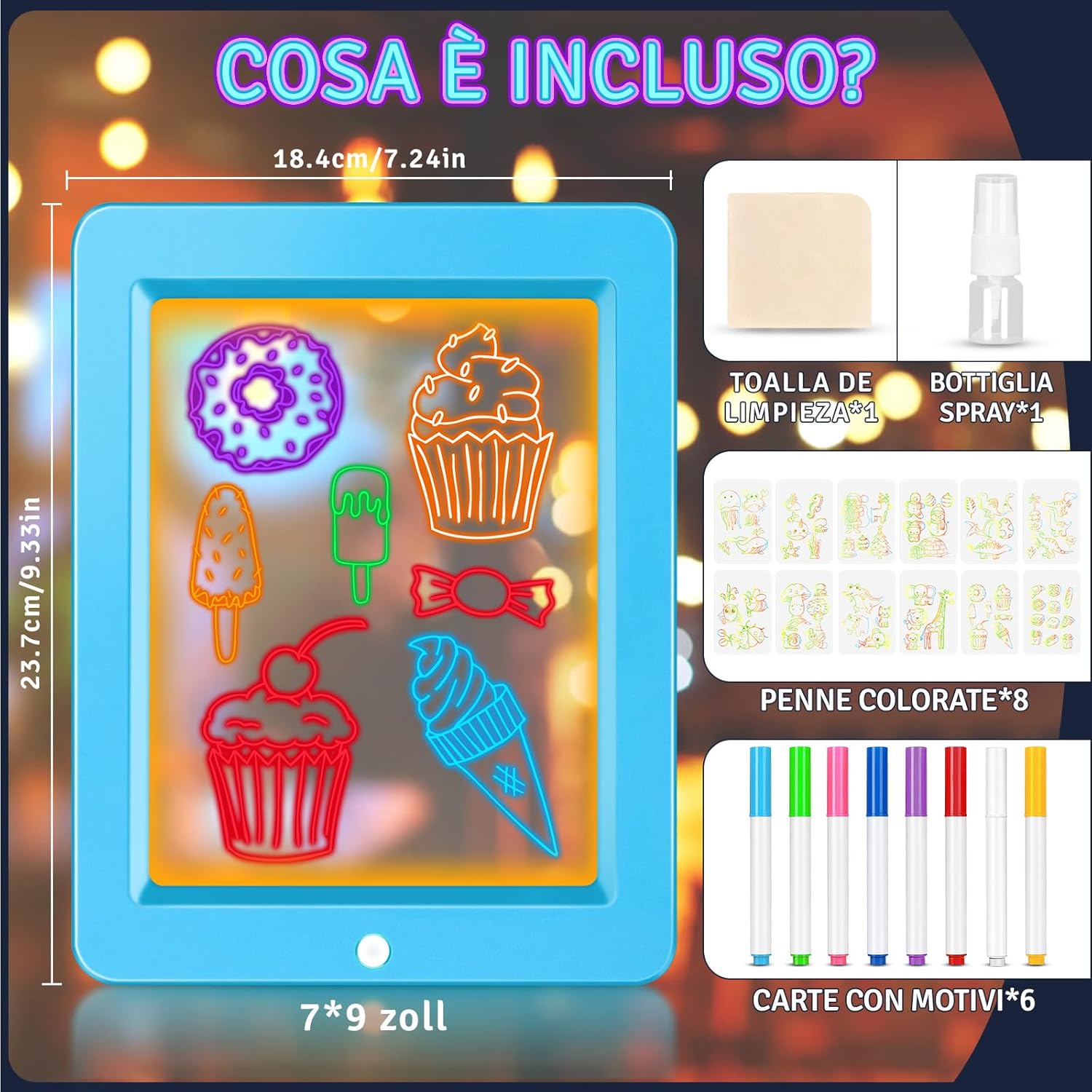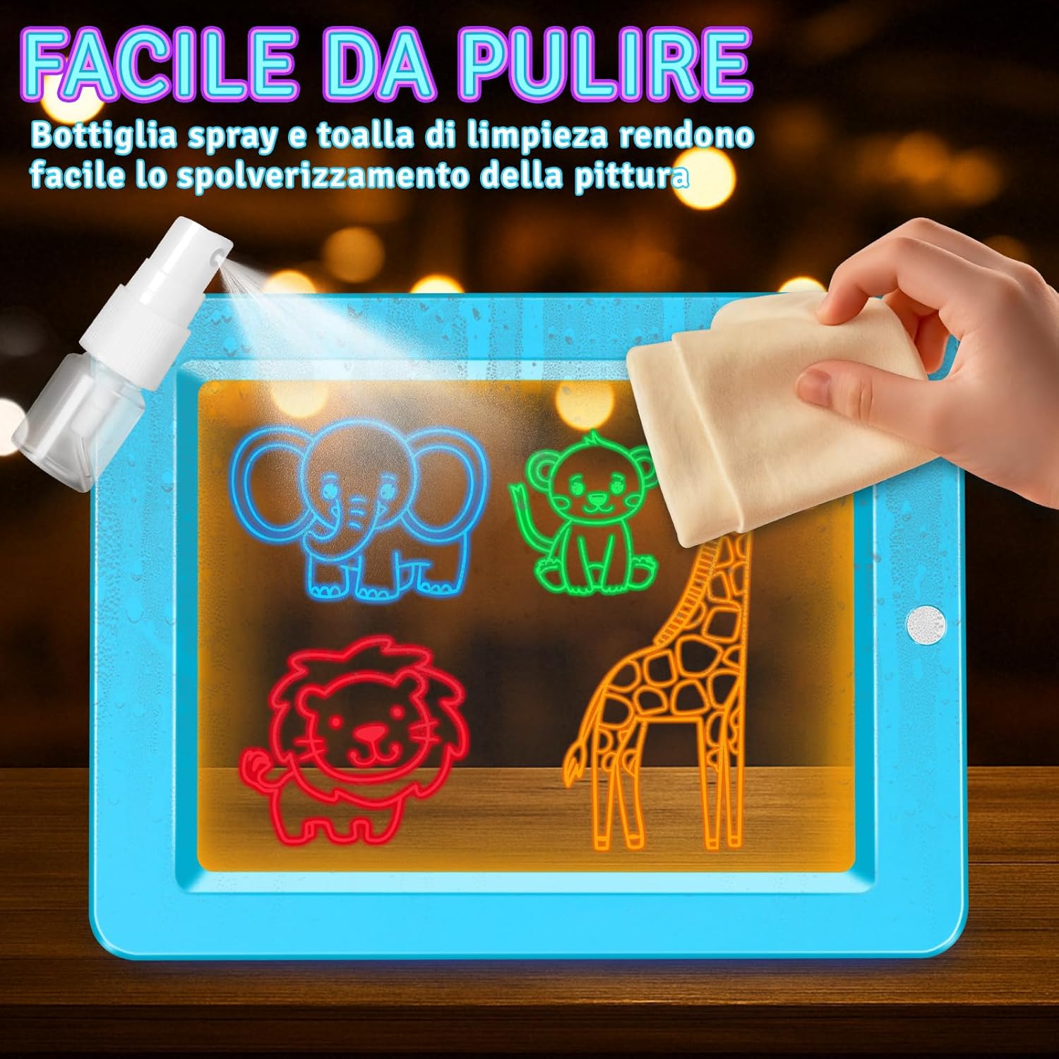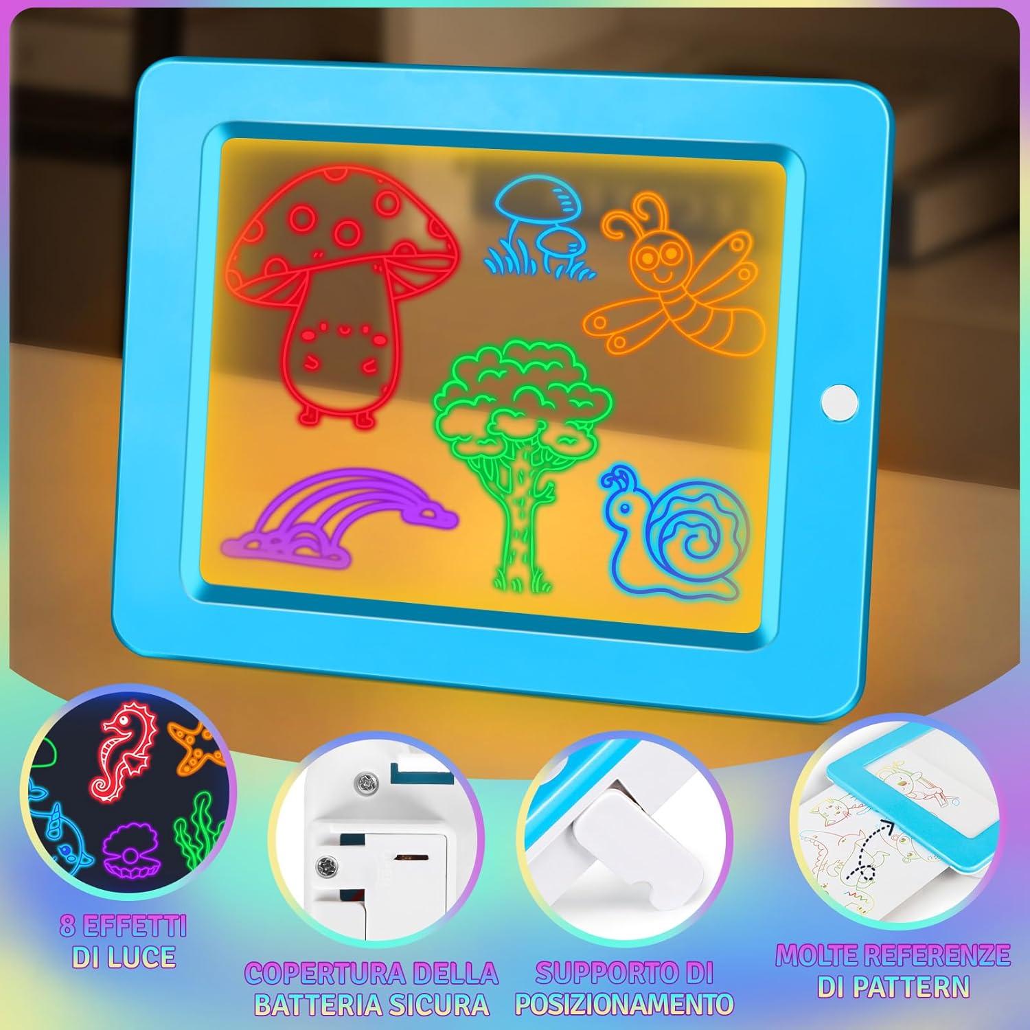 Lavagna luminosa a LED a 8 colori per bambini: la lavagna luminosa a 8 colori apre le porte a meraviglie artistiche visive! Basta con la monotonia della pittura! Utilizziamo una lavagna trasparente con 8 luci colorate magiche commutabili. Quando la luce si accende, la lavagna si trasforma in una tela luminosa. I bambini non vedono solo semplici linee, ma opere d'arte che danzano nella luce colorata. Questo offre un'esperienza sensoriale senza precedenti e accende immediatamente la passione per la pittura. Richiede 3 batterie AAA (non incluse). Schede da ricalcare e imparare a disegnare: sfruttate al meglio la lavagna trasparente! Il set contiene 6 schede da ricalcare con cartoni animati, che possono essere semplicemente posizionate sotto la lavagna luminosa. I bambini possono ricalcare chiaramente ogni dettaglio dei motivi e imparare così a disegnare. Dopo aver disegnato, la luce colorata accesa trasforma le immagini in uno spettacolo di luci magico per un enorme senso di soddisfazione! Il ricalco allena efficacemente la coordinazione occhio-mano, il controllo della matita e la capacità di osservazione, rendendo l'educazione artistica precoce scientifica e divertente. Spruzzare e pulire per una pulizia senza fatica: divertitevi a creare senza pensieri, al problema della pulizia ci pensiamo noi. La lavagna trasparente, liscia e senza giunture, insieme al flacone spray e al panno di pulizia in dotazione, rende la manutenzione un gioco da ragazzi. Basta spruzzare, pulire e la lavagna sarà perfettamente pulita, senza residui. Questa pulizia senza sforzo incoraggia i bambini a essere sempre creativi e libera i genitori dallo stress delle pulizie per momenti artistici davvero rilassanti. Molteplici applicazioni: da giocattolo per bambini ad aiuto per la famiglia. Più di un semplice giocattolo. I bambini possono usarlo per disegnare, scrivere, fare calcoli e scarabocchiare. Può anche essere utilizzato come bacheca di famiglia, agenda settimanale o raccoglitore di ricette in cucina. La sua trasparenza e luminosità lo rendono persino una fantastica lavagna per appunti notturni. Le sue molteplici funzioni soddisfano le esigenze di tutta la famiglia, rendendolo il regalo più creativo per bambini dai 3 agli 8 anni. Set regalo completo: un regalo creativo con infinite possibilità. La bella confezione regalo contiene: 1 lavagna LED per bambini, 8 penne speciali, 6 cartoncini da ricalcare, 1 flacone spray e 1 panno per la pulizia. Subito pronto all'uso, non sono necessari accessori. Che sia per un compleanno, per Natale o per la festa dei bambini, questo regalo farà brillare gli occhi dei più piccoli e susciterà un entusiasmo duraturo. È un regalo pieno di creatività e fascino unici.