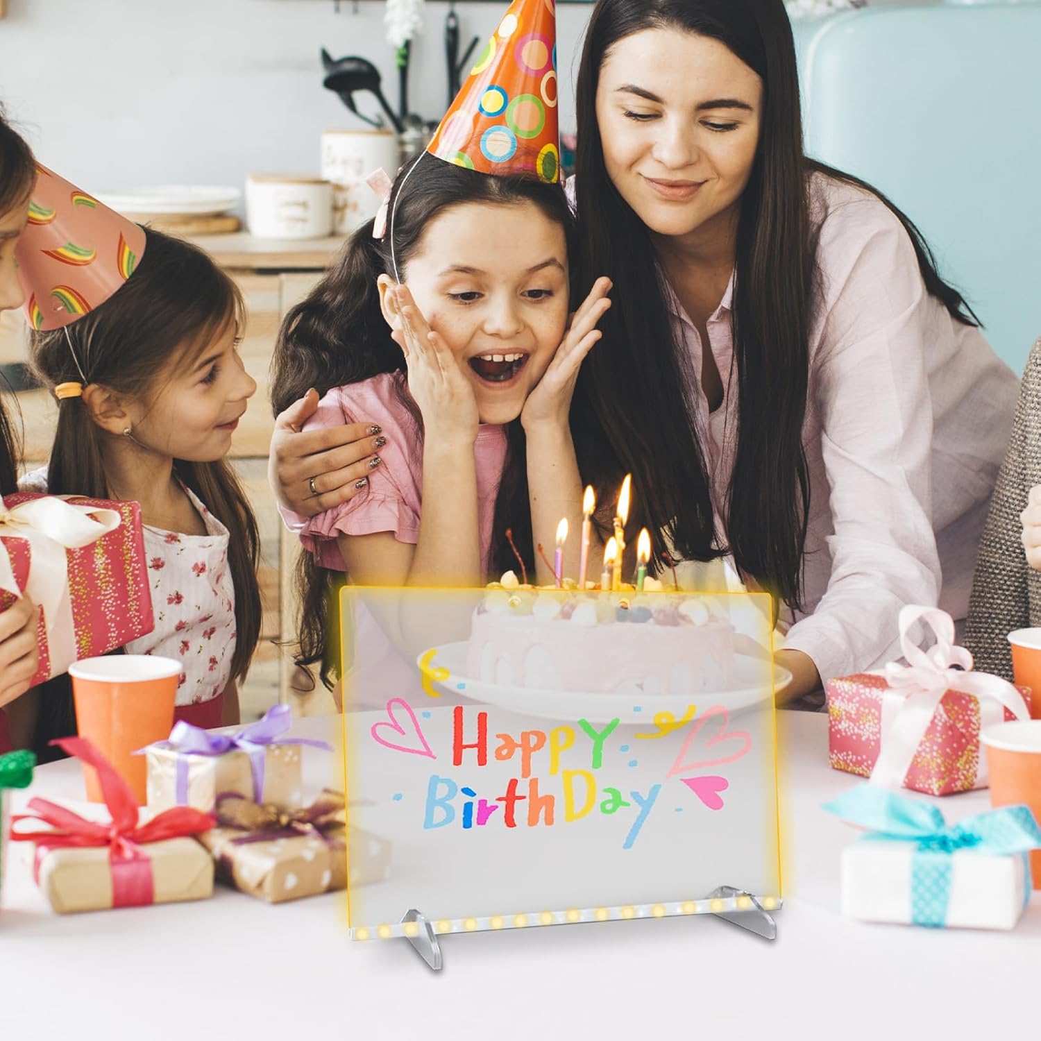 Superfici Scrittura Facile: Pannello acrilico resistente offre finitura di scrittura liscia che elimina i senza sforzo, semplifica le attività domestiche e le routine di appunti per tutta la famiglia Apprendimento Colorato: Stimola l'immaginazione infantile con mescolanze e abbinamenti flessibili, utilizzando 7 penne colorate per creatività espressiva sulla lavagna luminosa LED Designazione Antiriflesso Notturna: Progettata per offrire un effetto luminoso soffuso, la lavagna luminosa LED presenta una sorgente luminosa a colori avanzata che garantisce una retroilluminazione vivace e colorata, assicurando che nessun riflesso disturbi la tua esperienza serale con una visibilità ottimale senza affaticamento degli occhi Usi Diversificati: Strumento essenziale per annotazioni visibili e giochi educativi, offre soluzioni innovative per istituti, e case attraverso la sua funzione di bacheca luminosa per appunti che migliora produttività e coinvolgimento con utilizzo intuitivo Design Robusto: Caratterizzato da un supporto resistente che permette posizionamento regolabile con stabilità affidabile, mantenendo la lavagna LED sicuramente in posizione durante varie applicazioni quotidiane d'ufficio