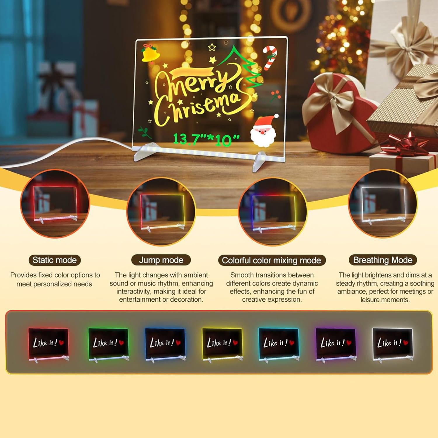 Gestione Note Comoda: Pannello acrilico con design anti-polvere per scrittura liscia e senza , migliora la comunicazione domestica e semplifica la pianificazione quotidiana con praticità eccezionale Apprendimento Colorato: Stimola l'immaginazione infantile con mescolanze e abbinamenti flessibili, utilizzando 7 penne colorate per creatività espressiva sulla lavagna luminosa LED Designazione Antiriflesso Notturna: Progettata per offrire un effetto luminoso soffuso, la lavagna luminosa LED presenta una sorgente luminosa a colori avanzata che garantisce una retroilluminazione vivace e colorata, assicurando che nessun riflesso disturbi la tua esperienza serale con una visibilità ottimale senza affaticamento degli occhi Utilizzi Versatili: Lavagna luminosa LED perfetta per appunti durante le riunioni e graffiti creativi dei bambini, si utilizza facilmente in scuole, e case come bacheca familiare per comunicazioni quotidiane e promuovere interazione pratica in diversi ambienti con design moderno e funzionale Funzionalità Anti-Ribaltamento: Equipaggiato con un supporto solido che consente regolazioni angolari flessibili mantenendo la stabilità, assicurando performance affidabili della lavagna LED in qualsiasi configurazione di scrivania