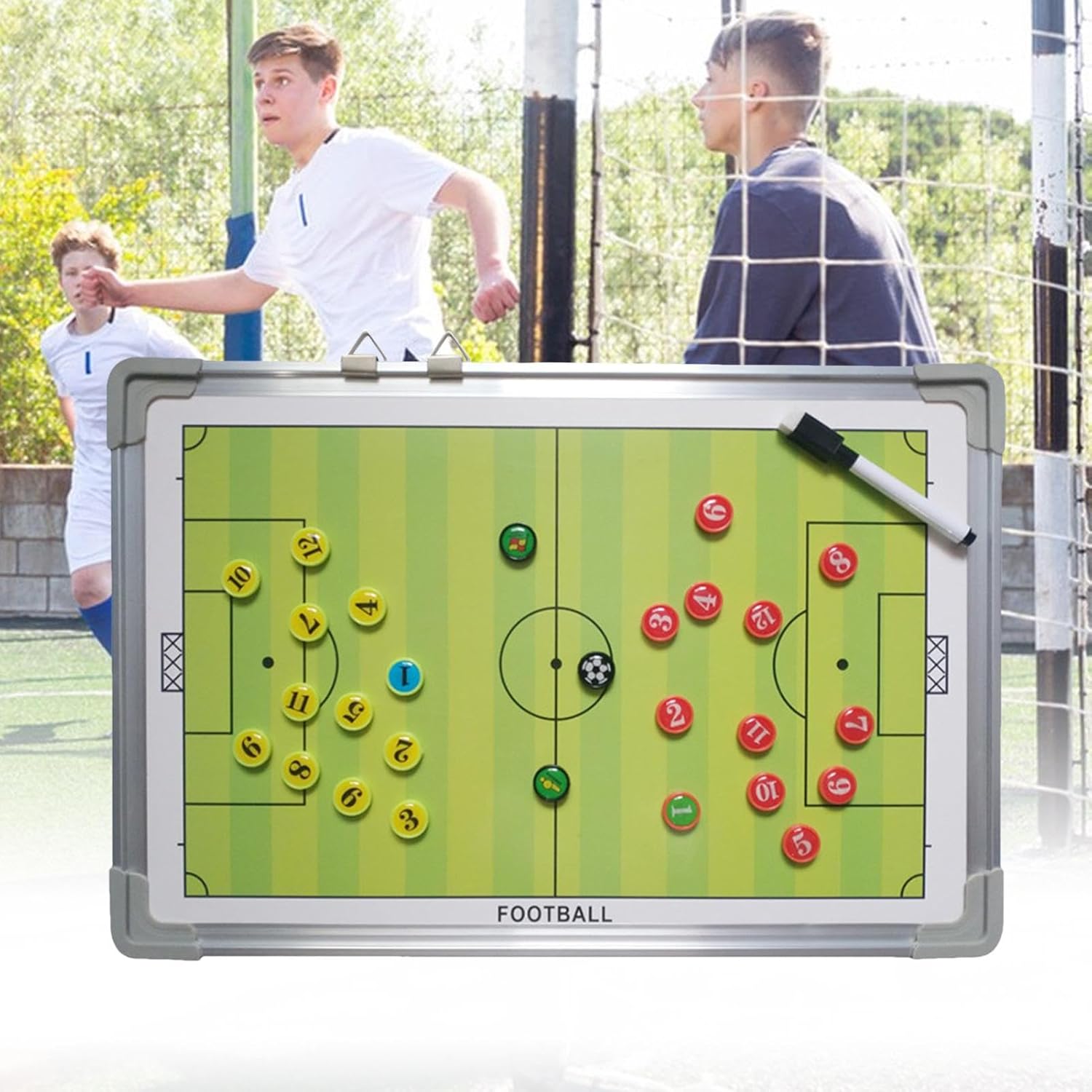 Praticità d'uso: Grazie al materiale durevole anti-intemperie, la lavagna resiste ai graffi e mantiene la qualità nel , offrendo praticità di pulizia e usabilità prolungata Allenamento Pratico: Combina strumenti di addestramento concreto con la capacità di modificare strategie, risorsa essenziale per lo sviluppo teorico e tecnico del calcio per giovani. Carattere: 202 Design per Gruppi: Dimensioni ottimizzate per discussioni tattiche con squadre, combinando contrasti di colore intensi e segni distintivi per modernizzare le attività di allenamento calcistico Design Cancellabile: Lavagna riutilizzabile per segnalazioni ripetibili con marcatori a umido, garantisce flessibilità operativa e funzionalità essenziale come strumento per allenamento calcio. Materiale Resistente: Realizzato in alluminio duraturo, la struttura portatile assicura maneggevolezza senza sforzo e prestazioni a lungo termine, completata da soluzione di riporlo a parete per risparmio spazio e facile montaggio