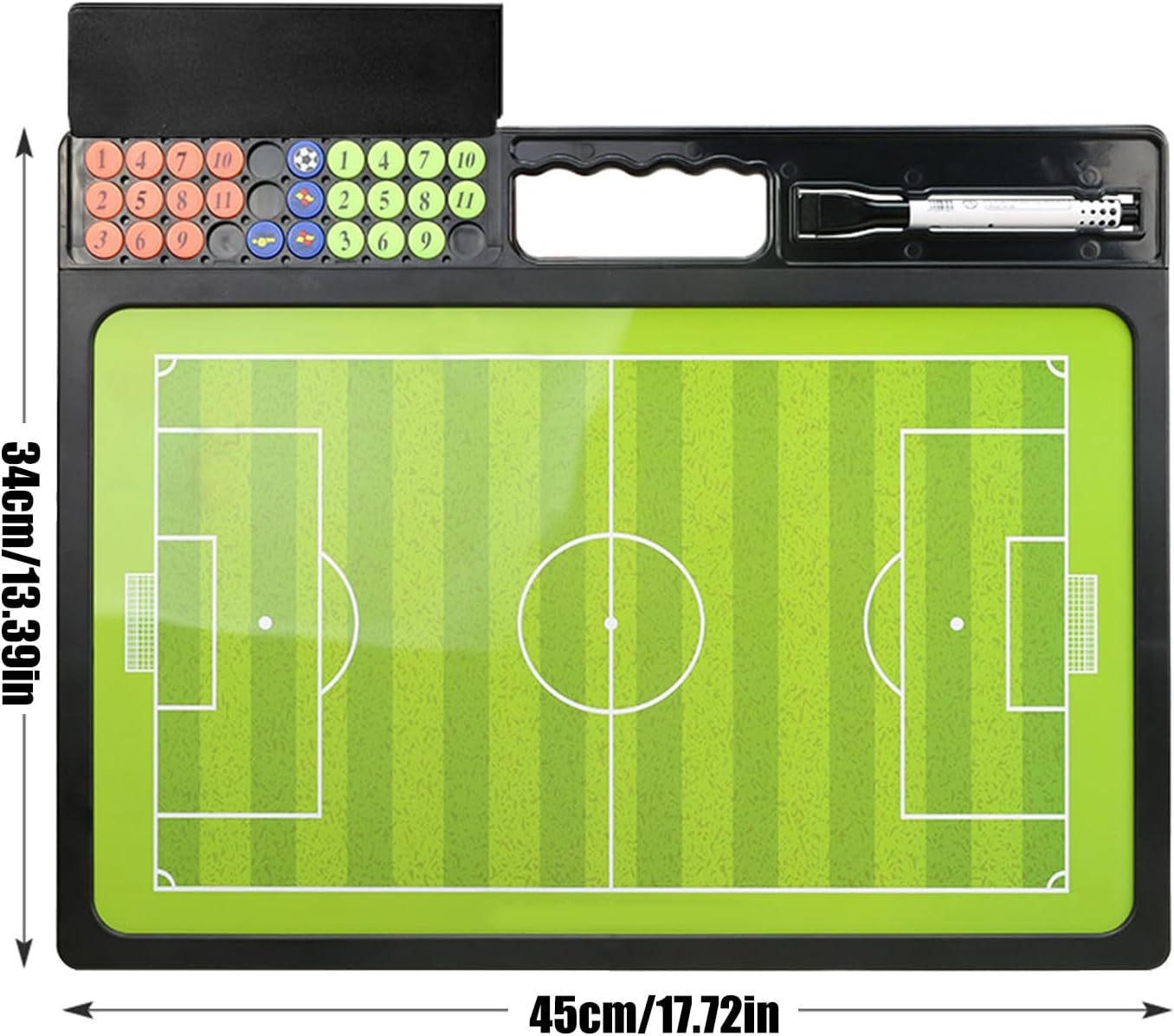 Esperienza Scrittura : La lavagna per calcio migliora l'apprendimento attraverso visualizzazioni chiare e mantiene la superficie ordinata durante le modifiche, garantendo una scrittura scorrevole e facile da leggere grazie alle linee luminose, con una cancellatura pulita senza sbavature per attività di coaching continue e senza interruzioni, ideale ssioni di allenamento fluide ed con scrittura sempre leggibile e precisione costante. Pianificatore di Gioco Magnetico: Progettato per la praticità, il tavolo da calcio combina un di marcatori magnetici e strumenti user-friendly come penne scanalate, rendendo facile organizzare formazioni e posizioni per un coaching in qualsiasi contesto sportivo, con una gestione intuitiva e senza sforzo. Durabilità Doppia Faccia: La lavagna per allenamento calcio offre una finitura liscia e impermeabile che permette una pulizia rapida e senza , garantendo massima praticità dopo sessioni di training intense; la sua capacità di resistere ai di sudore e pioggia assicura una lunga durata nel , con una superficie robusta che mantiene le prestazioni anche in condizioni di uso frequente all'aperto, ideale per mantenere la lavagna sempre pronta per l'uso in qualsiasi situazione di allena Ampia Applicabilità: La lavagna magnetica per calcio serve come strumento versatile per gli allenatori, permettendo di pianificare le formazioni e le sostituzioni in modo e intuitivo. È particolarmente vantaggiosa sia per le partite che per i periodi di allenamento, la chiarezza strategica è fondamentale per il successo della . Grazie alla sua capacità di visualizzare le tattiche e gestire i cambi, favorisce una migliore organizzazione e readiness, adattandosi a esigenze div Apprendimento Strategico Versatile: Progettata con doppi diagrammi di campo, la lavagna magnetica per l'allenamento di calcio semplifica l'insegnamento del posizionamento e dei percorsi fornendo visualizzazioni dettagliate per entrambe le configurazioni di campo intero e mezzo campo, migliorando le esperienze di apprendimento. Questo approccio versatile supporta una vasta gamma di strategie, facilitando la comprensione delle tattiche attraverso rappresentazioni chiare e adattabili, ideali