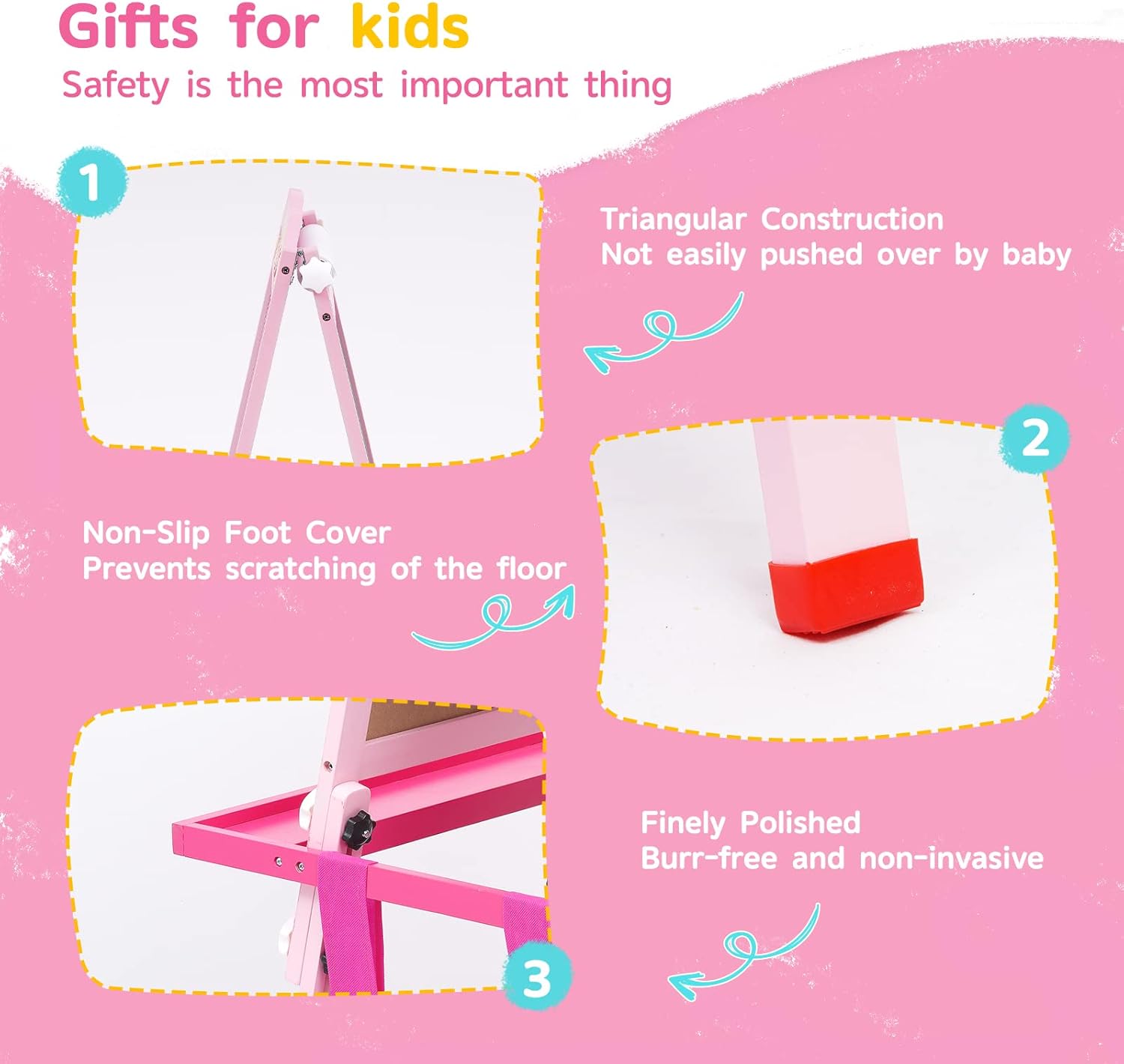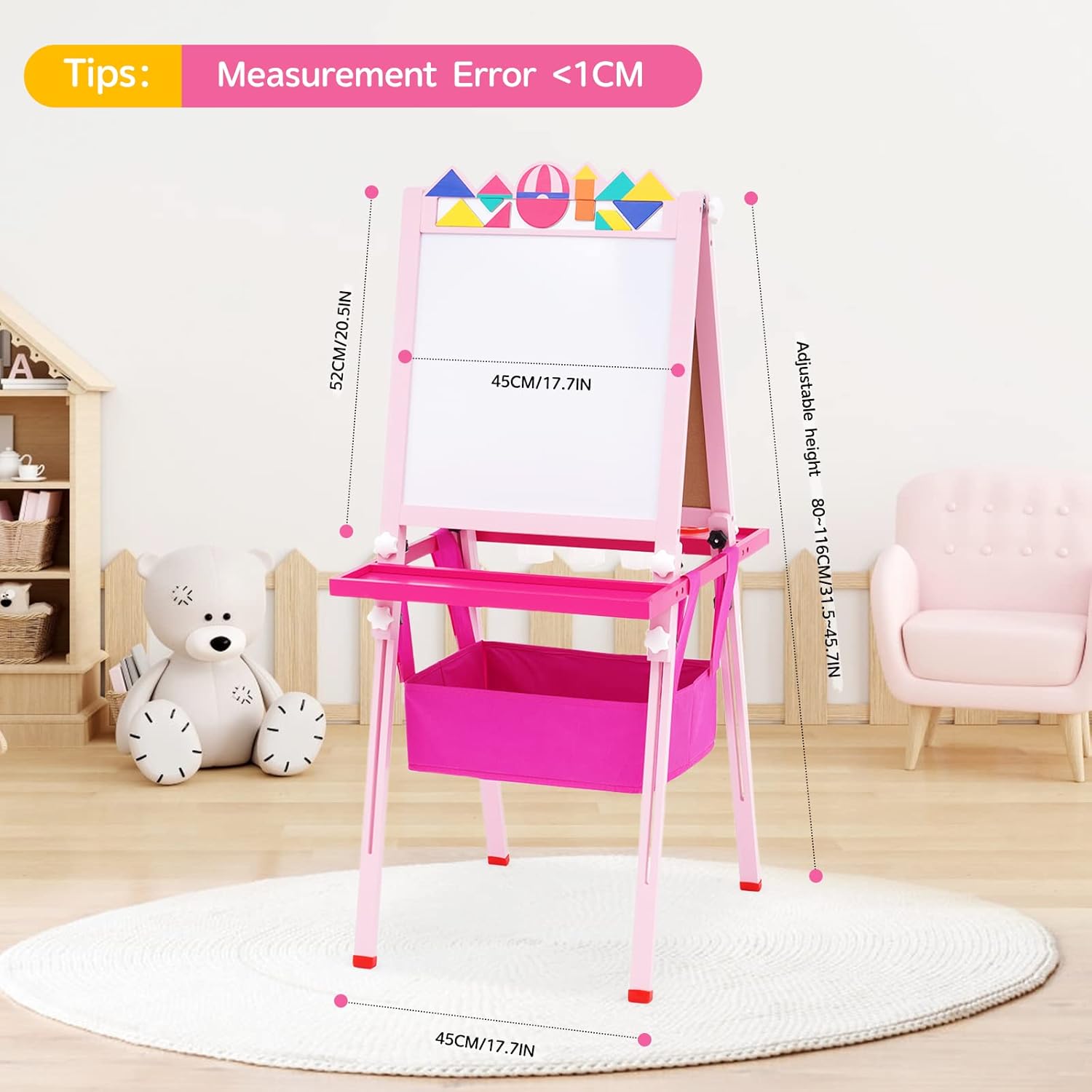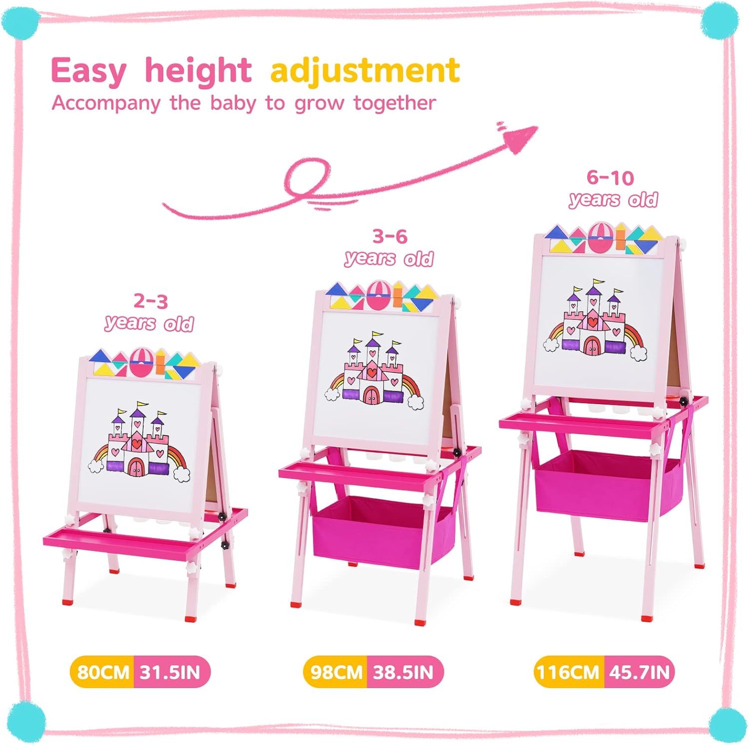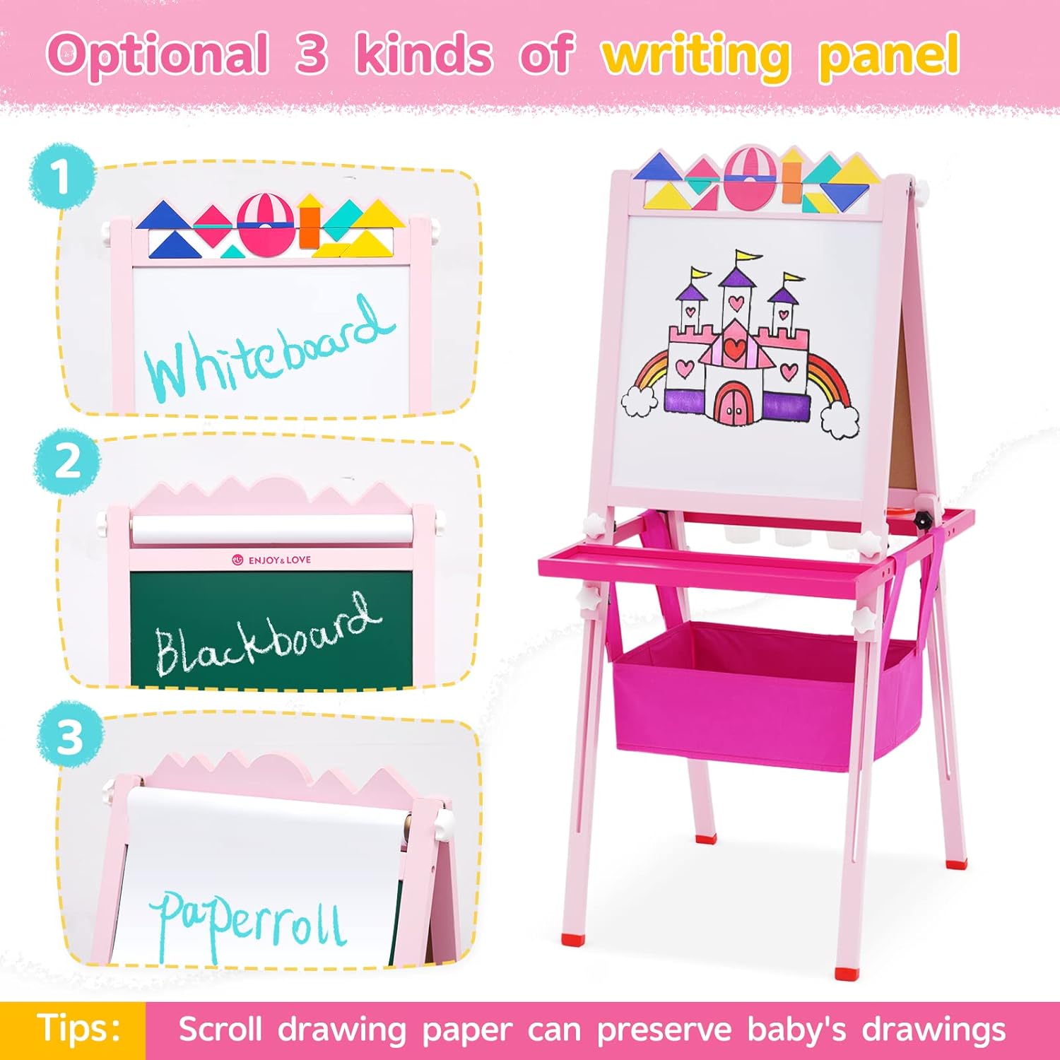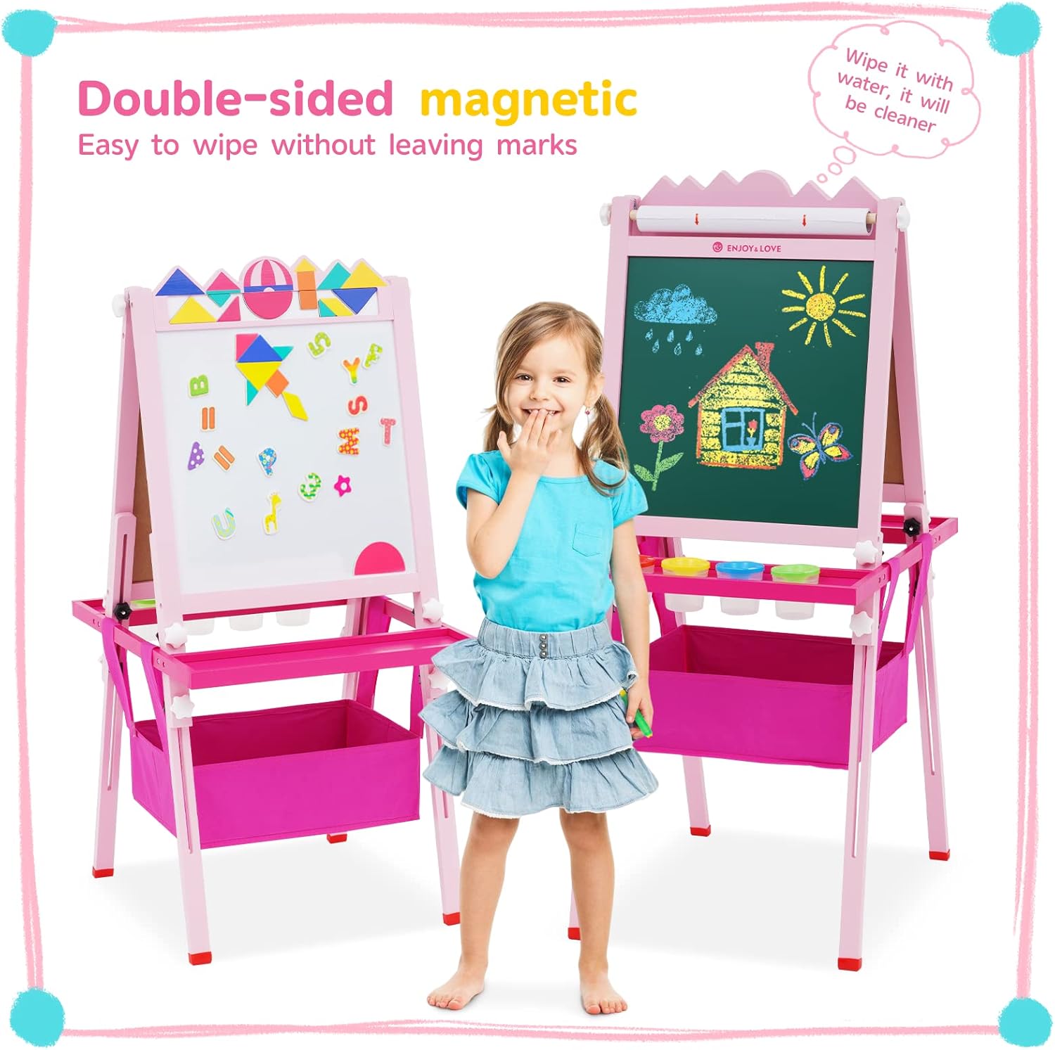 【CAVALLETTO IN LEGNO SOLIDO】 Questo cavalletto in legno include gomma per lavagna * 2, pennarello per lavagna bianca a base d'acqua * 4, lavagna per puzzle * 1, lavagna per animali dei cartoni animati * 12, fibbia colorata * 6, spazzola * 6 + colore set di gessetti * 1, tazza di vernice * 4, righello colorato * 1, carta da disegno a scorrimento * 1 (puoi salvare i dipinti del tuo bambino) 【TAVOLO DA DISEGNO TANGRAM CREATIVO】 Questo cavalletto artistico viene fornito con un giocattolo puzzle , i bambini possono non solo disegnare immagini attraverso il tavolo da disegno, ma anche usare i puzzle per costruire vari modelli sul tavolo da disegno. Attraverso puzzle unici, i bambini possono esplorare il fascino della geometria 【UN BUON PARTNER PER ACCOMPAGNARE IL TUO BAMBINO A CRESCERE】 Man mano che il tuo bambino cresce in altezza, il nostro cavalletto artistico in piedi può anche "crescere più alto", può essere regolato da 76 cm a 114 cm . Può soddisfare le esigenze di bambini di età diverse. Questo tavolo da disegno è anche molto semplice da installare e facile da riporre 【DESIGN INGEGNOSO】 La lavagna per bambini con struttura triangolare ha piedini antiscivolo, che non sono facili da spingere, e le madri non devono preoccuparsi di graffiare il pavimento; è finemente levigato, liscio e privo di sbavature, il che non danneggerà le manine del bambino. Nota: ci sono pellicole su entrambi i lati del cavalletto, si prega di strappare prima dell'uso 【IL REGALO PIÙ ADATTO AI BAMBINI】 I bambini possono liberare la natura della pittura attraverso il tavolo da disegno e possono anche coltivare la creatività, l'immaginazione, l'osservazione e l'esplorazione dei bambini, il che favorisce lo sviluppo completo dei sensi e dell'intelligenza del bambino