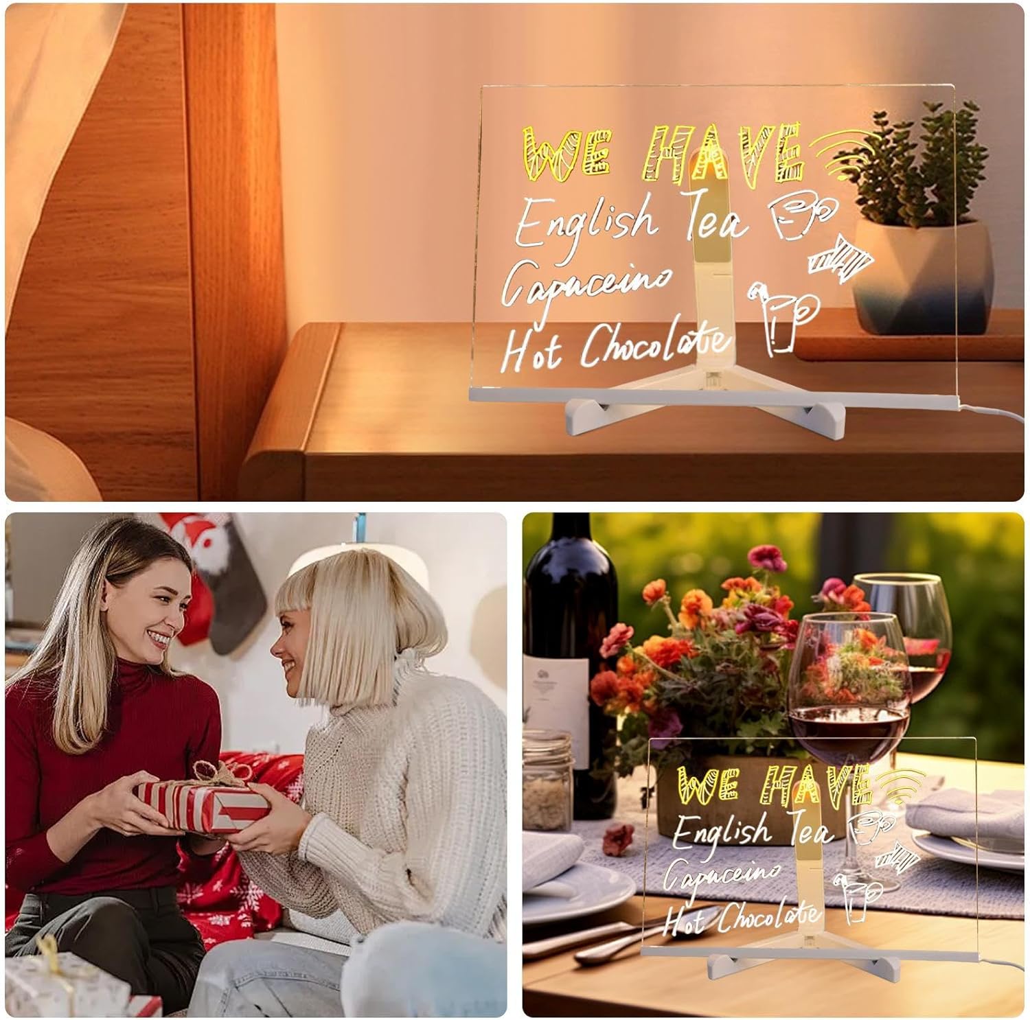 Lavagna a LED: questo versatile strumento di scrittura dal design luminoso del blocco note favorisce la libertà di espressione e risveglia la curiosità dei bambini attraverso la scrittura interattiva. Strumento creativo: gli evidenziatori consentono di creare opere d'arte vivide sulla lavagna, stimolare la concentrazione e l'immaginazione e ispirare gli utenti di tutte le età con il loro design leggero e accattivante per migliorare il successo e la creatività. Multiuso: questa lavagna a LED è perfetta per ambienti professionali e combina la funzione calendario con l'eleganza decorativa. Serve anche come agenda e blocco note per spazi organizzati. Design di facile manutenzione: grazie alla sua struttura robusta e al design riutilizzabile, questa lavagna a LED è facile da pulire con un panno. Ciò garantisce una lunga durata con il minimo sforzo di manutenzione nell'uso quotidiano. : Un regalo pratico, perfetto per occasioni festive, feste e compleanni. Ottimo regalo anche per Natale.