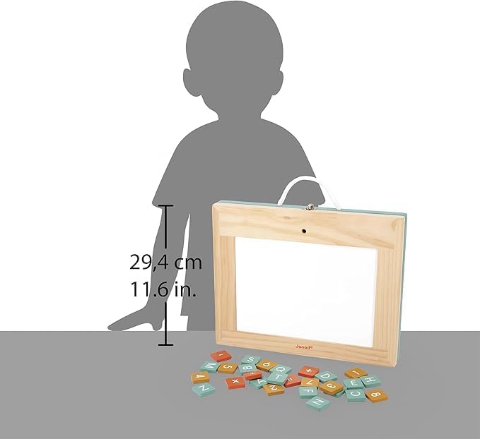 4 ATTIVITÀ: Un tabellone formato “valigetta” composto da 4 diverse attività per tenere occupati i bambini. Include 1 lato in ardesia nera, 1 lato in ardesia bianca, 1 lato magnetico e 1 lato in "ardesia magica". Ore di gioco creativo ti aspettano! FACILMENTE TRASPORTABILE: Il suo formato compatto e richiudibile facilita il trasporto della tavola e di tutti i suoi accessori. Questo gioco manterrà i bambini perfettamente occupati durante i lunghi viaggi in macchina o a casa in caso di pioggia! TANTISSIMI ACCESSORI INCLUSI: Grazie ai 42 magneti, alla scatola da 5 gessetti, al pennello e al pennino per lavagna magica inclusi, il tuo bambino ha tutti gli accessori per sfruttare al meglio il suo gioco! Pennarello cancellabile non fornito. CARATTERISTICHE: Contiene 42 magneti (27 lettere, 10 numeri e 5 segni), una scatola da 5 gessetti, un pennello, uno stilo. Dimensioni del gioco: Lunghezza 37 cm x Larghezza 4 cm x Altezza 29 cm. Da 3 anni a 8 anni IL POTERE DEL GIOCO: Con collezioni audaci e innovative, Janod accompagna i bambini nell'avventura più bella: crescere! Bellissimi giocattoli per imparare senza nemmeno rendersene conto, esplorare il mondo, sognare e condividere... Bravi!
