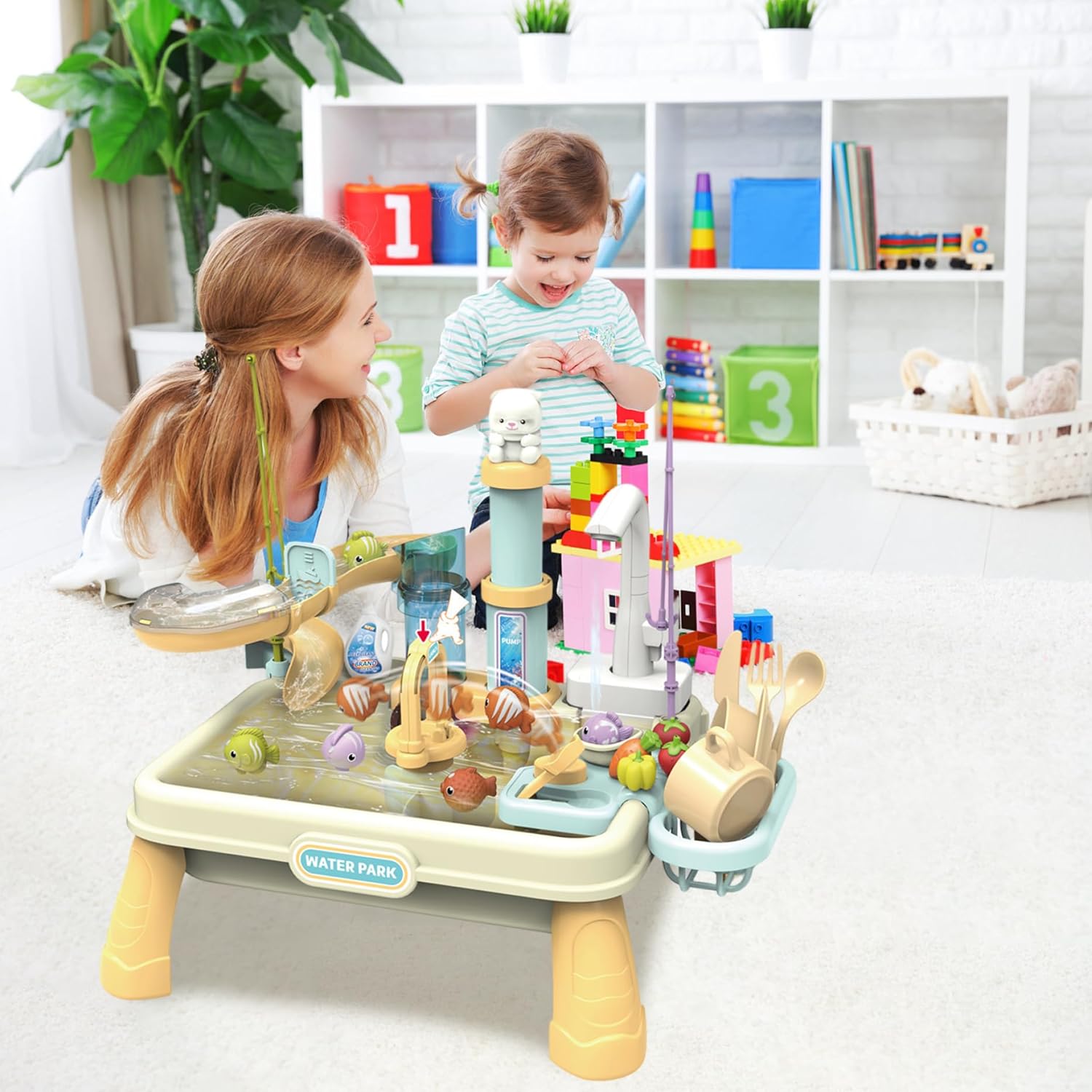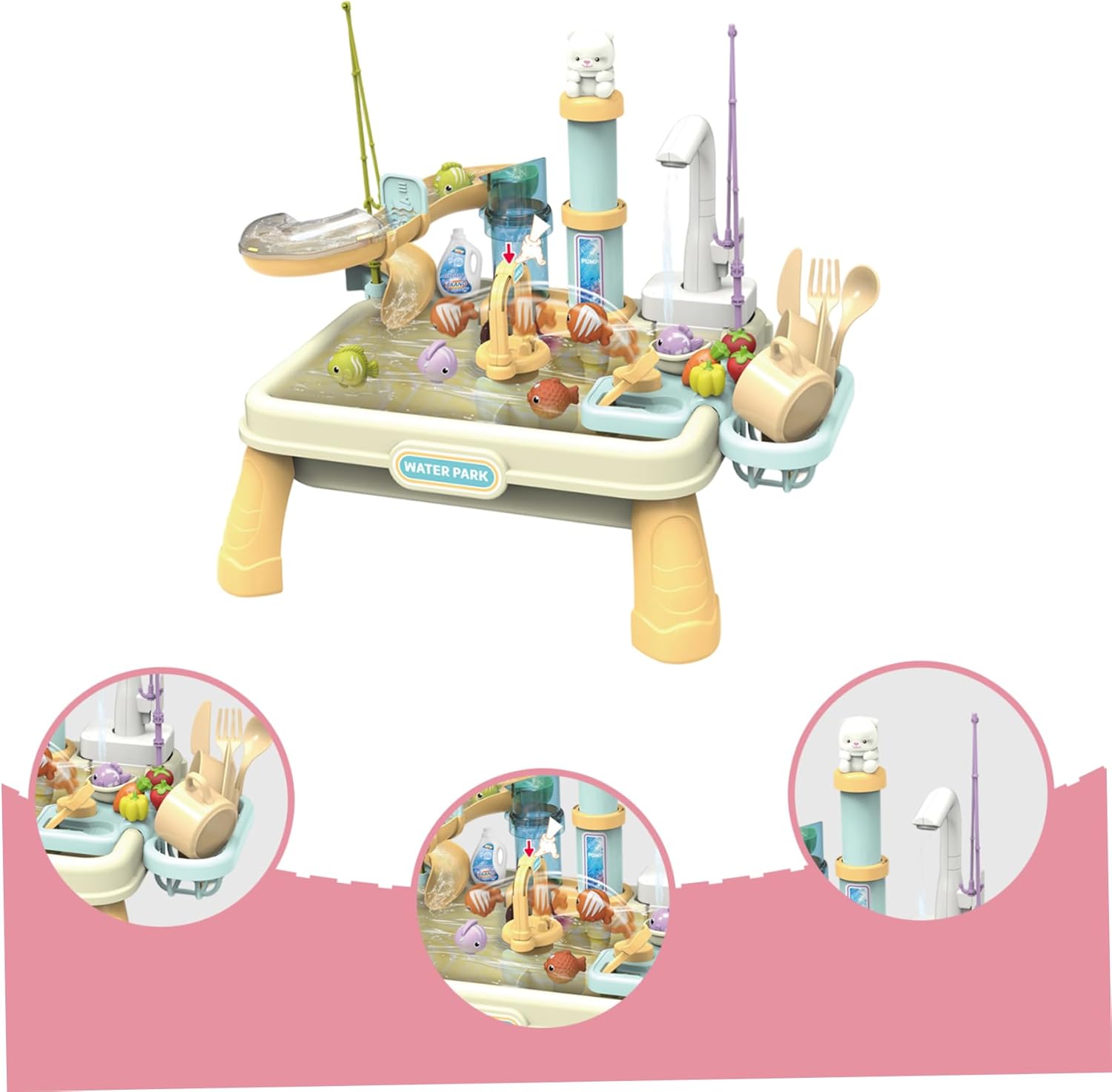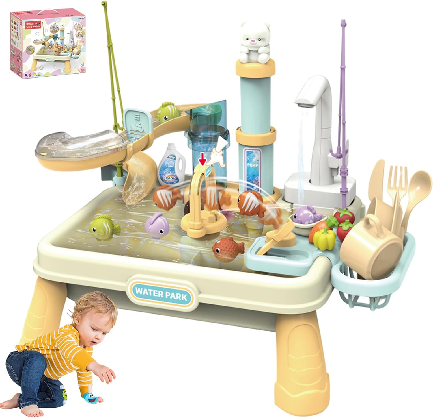 Divertimento didattico interattivo: questo lavandino con acqua corrente coinvolge i bambini in giochi fantasiosi, incoraggiando la creatività e aiutando a sviluppare abilità essenziali come la coordinazione occhio-mano e le abitudini igieniche di base attraverso attività acquatiche interattive. Design spazioso e stabile: realizzato in plastica di lunga durata, questo spazioso tavolo ad acqua per bambini è robusto e facile da pulire, garantendo un uso duraturo all'interno o all'esterno e fornendo ampio spazio per far giocare insieme più bambini. Sicuro ed educativo: realizzato con materiali atossici e sicuri per i bambini, questo giocattolo promuove il gioco sicuro in acqua e un'esperienza educativa per ragazze e ragazzi, favorendo l'apprendimento precoce sulla pulizia, sulla responsabilità e sul lavoro di squadra. Set completo di accessori: viene fornito con strumenti per la pesca e il lavaggio progettati per le mani dei più piccoli, tra cui un rubinetto, una bacinella, utensili e giocattoli per pesci, offrendo opzioni di gioco versatili che stimolano lo sviluppo delle capacità sensoriali e motorie. Mobile acquatico realistico: dotato di una pompa dell'acqua elettrica, il lavandino giocattolo offre un'esperienza realistica dell'acqua corrente, rendendo il tempo di gioco più emozionante e coinvolgente mentre insegna ai bambini l'uso e la conservazione dell'acqua.