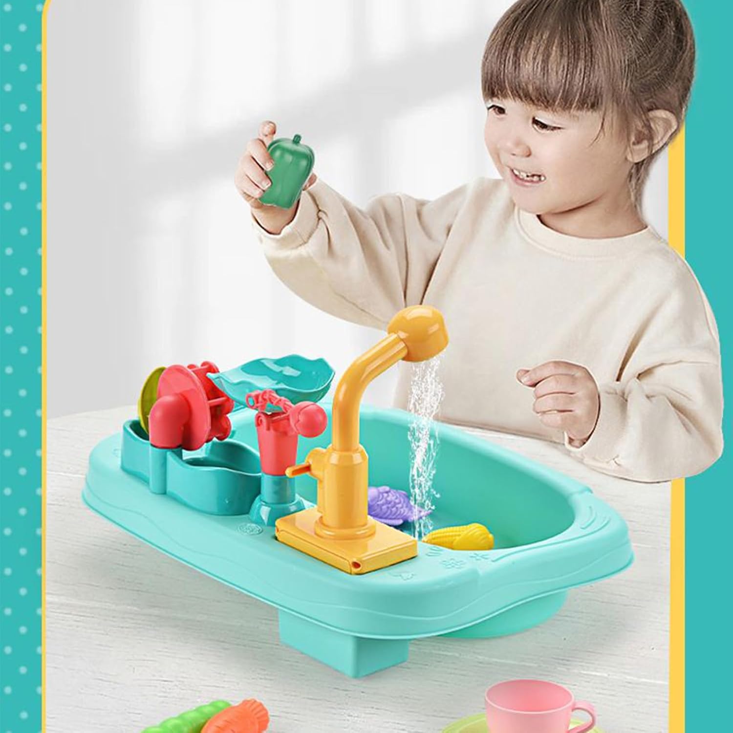 Sicurezza integrata: Progettato con spigoli arrotondati, anti-perdite avanzato e componenti elettrici completamente sigillati per garantire maneggevolezza sicura e prestazioni durature senza compromessi su funzionalità o esperienza d'uso. Apprendimento versatile:Attraverso attività di montaggio e feedback sensoriali, il giocattolo sviluppa la coordinazione occhio-mano, la percezione spaziale e il pensiero logico per molteplici obiettivi educativi. Divertimento Realistico Lavastoviglie: Grazie al design della scena di lavaggio piatti simulata e a un innovativo dispositivo elettrico integrato, questo lavello giocattolo con acqua corrente permette ai bambini di immergersi in un apprendimento pratico, replicando fedelmente il vero processo di lavaggio per un'interazione autentica e coinvolgente, senza compromettere la sicurezza. Gioco Educativo: Supporta il role-play con flusso d'acqua esplorativo, combinando lavabo per verdure, giochetto di e ruota idrica a per potenziare apprendimento pratico e gioia condivisa Configurazione Semplice: Montaggio immediato con rubinetto regolabile e flusso continuo, arricchito da ruota floreale che crea giochi d'acqua coinvolgenti tramite tecnologia di pompaggio automatico