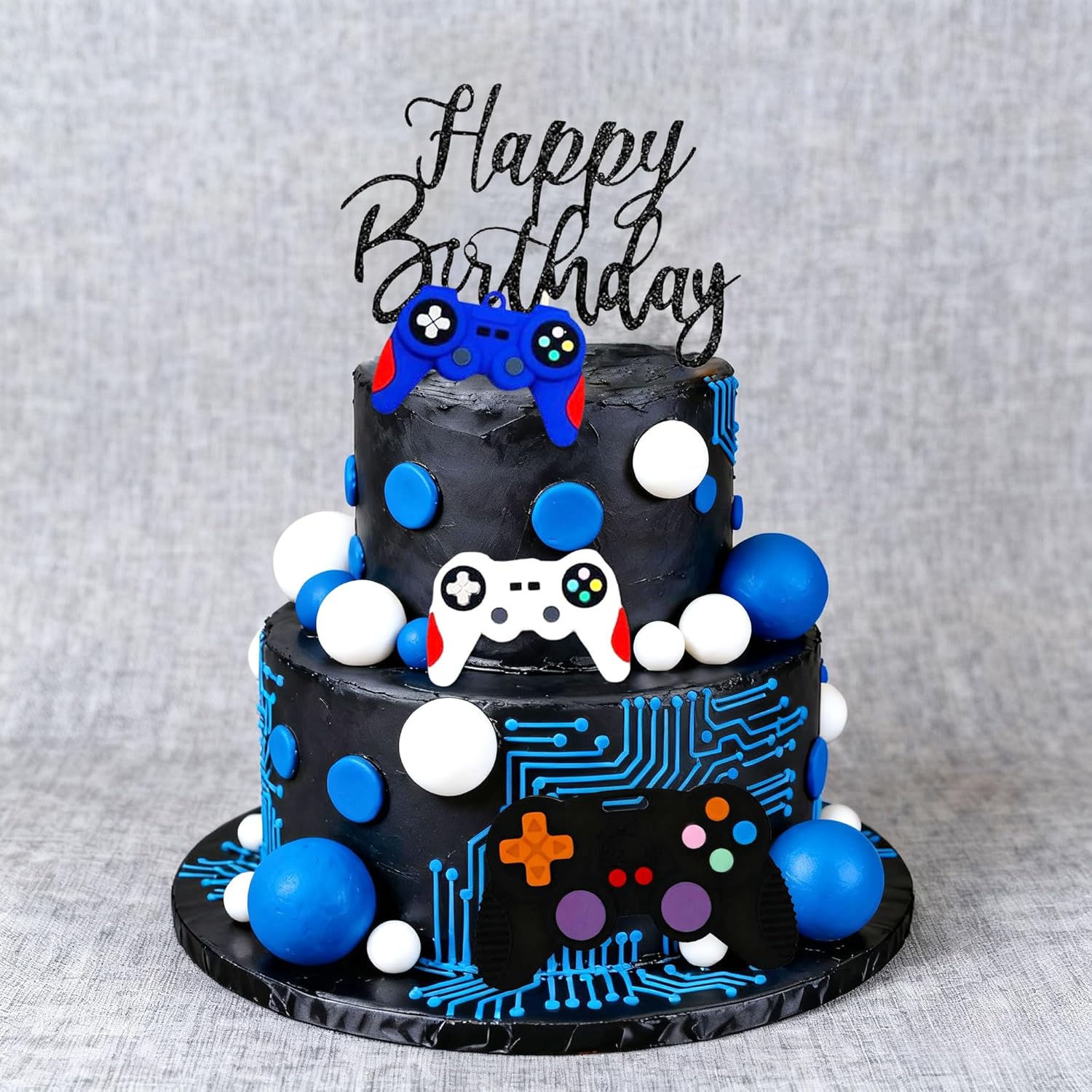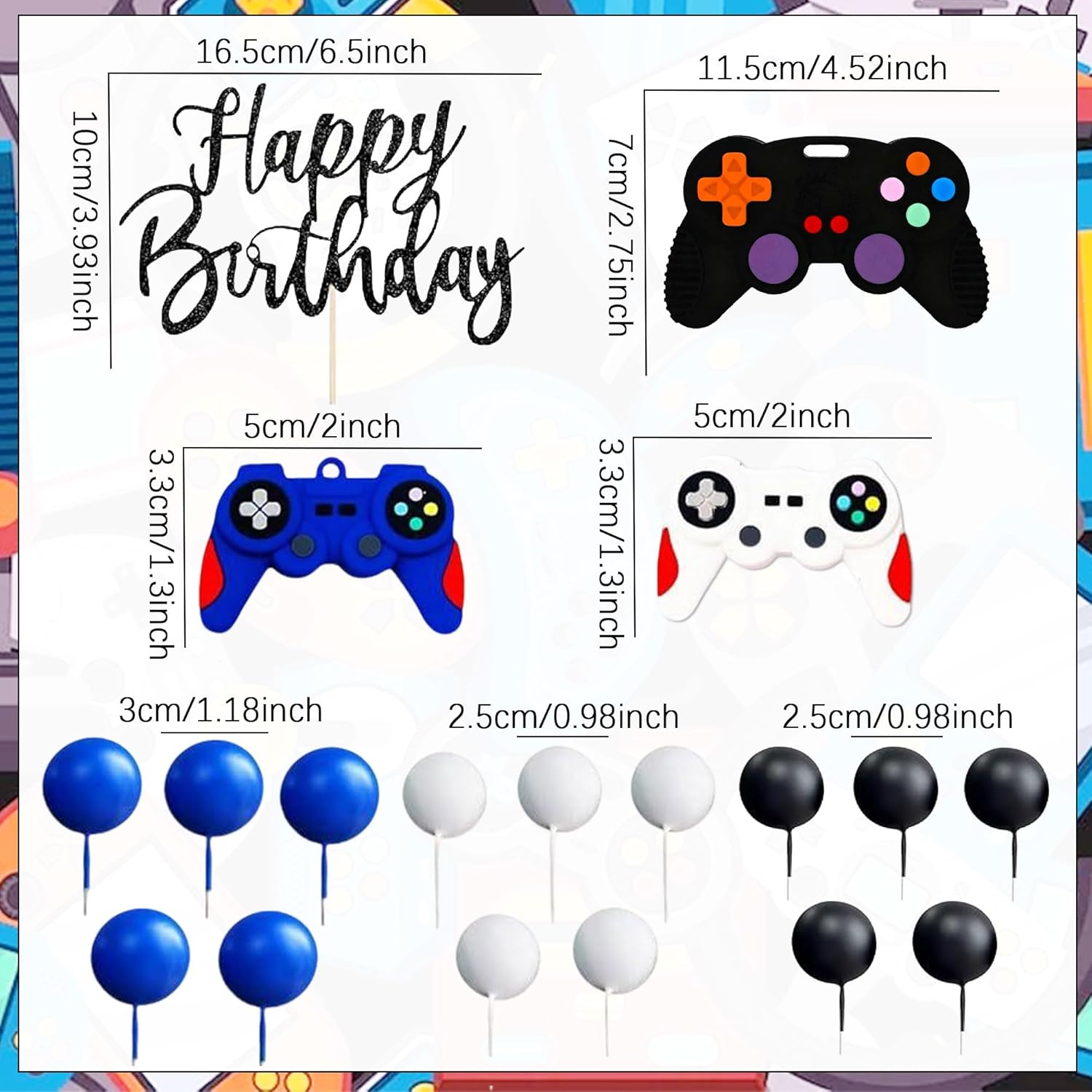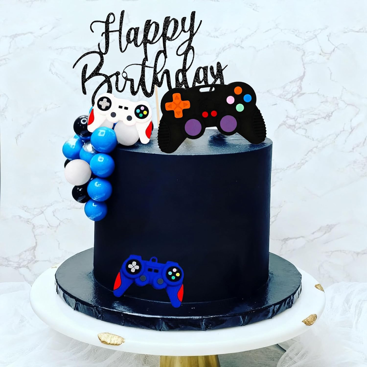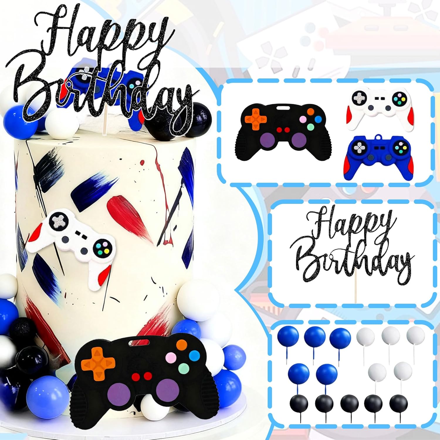 Il nostro set di decorazioni per torte a tema videogioco blu offre tutto ciò di cui hai bisogno per rendere questo giorno indimenticabile Questo set di decorazioni per compleanni a tema videogiochi è ideale per feste di compleanno, party di gioco e feste TV Il pacchetto include: 1 x inserto "Happy Birthday", 3 x controller di gioco, 15 x palline Il nostro set di decorazioni per torte a tema videogiochi rende la tua torta interessante e trasporta la tua famiglia e gli amici in un'esperienza indimenticabile Se hai domande sul prodotto, non esitare a contattarmi. Ti auguro una buona giornata